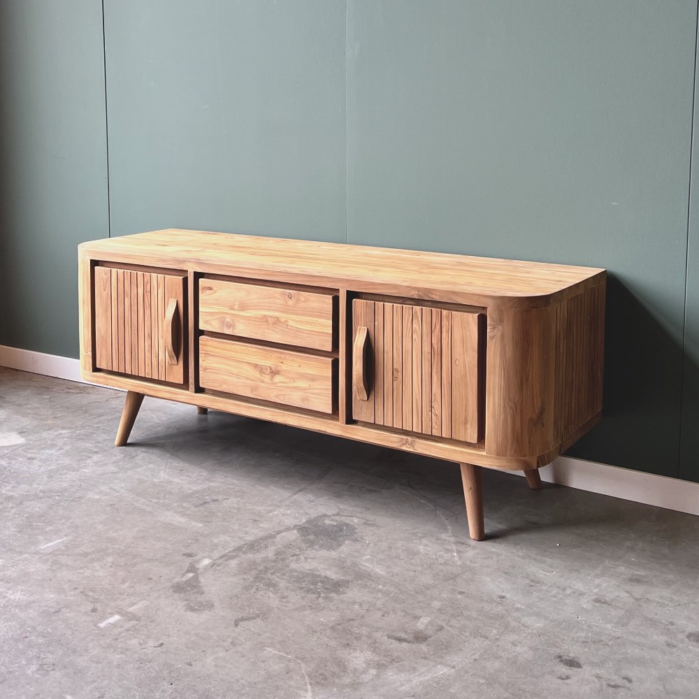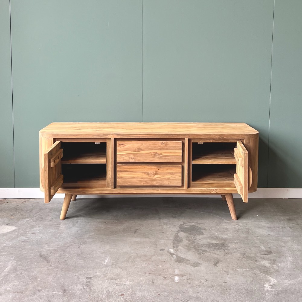 De ronde poten en afgeronde hoeken geven dit meubel helemaal de jaren 50 stijl. Dit tv-meubel is gemaakt van uitstekende kwaliteit gerecycled teakhout. De laden gaan open op een metalen rails en de deuren zijn te stellen. Bij het ontwerpen hebben wij bewust gekozen voor een dicht meubel. Dit zorgt voor een strak design.