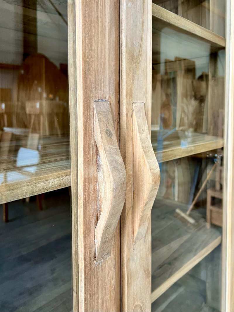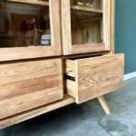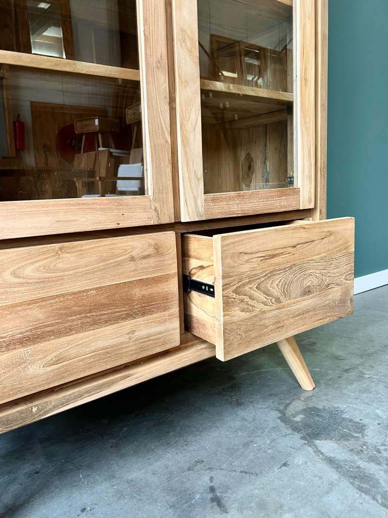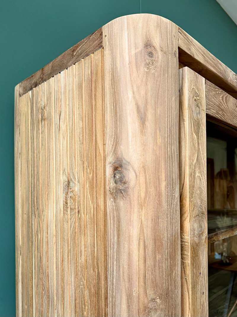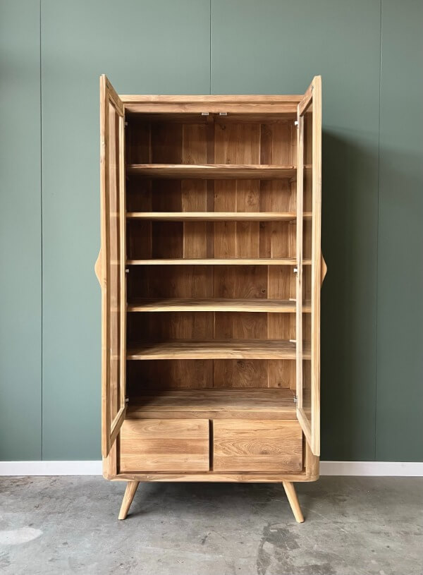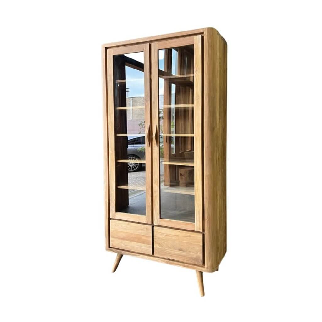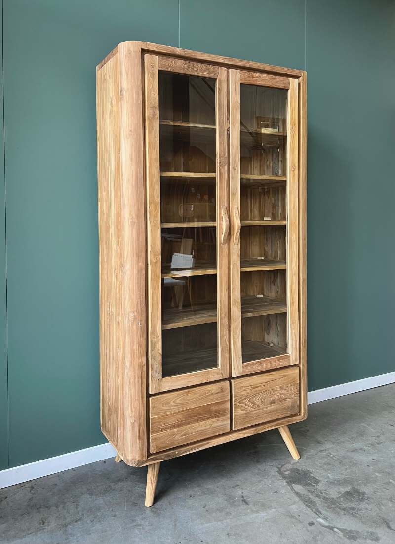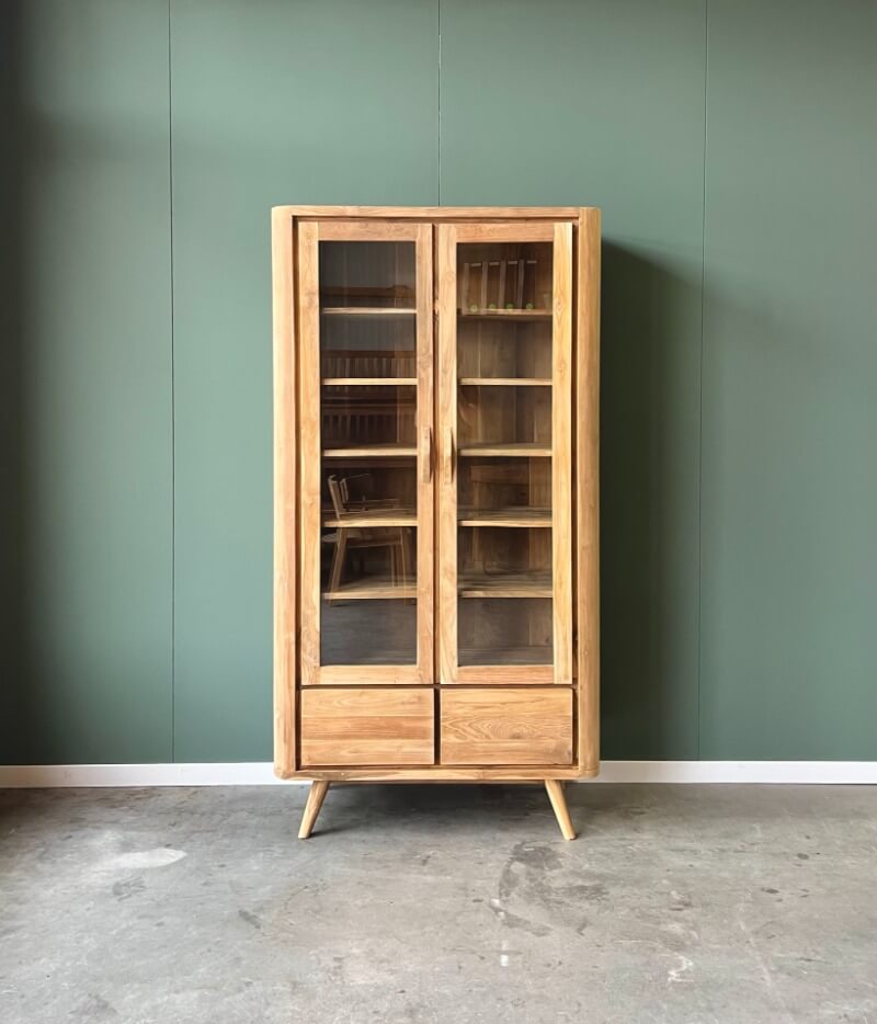 Deze retro vitrinekast gemaakt van gerecycled teakhout geeft een warme en natuurlijke uitstraling aan de ruimte, terwijl de retro poten voor een speels effect zorgen. De kast biedt genoeg ruimte om al je favoriete items tentoon te stellen. De planken liggen los en kunnen eventueel verwijderd worden om grotere items te plaatsen.