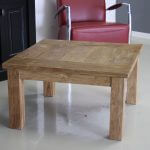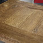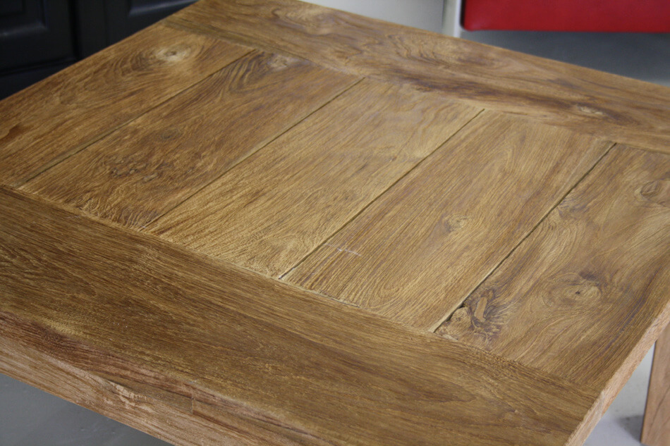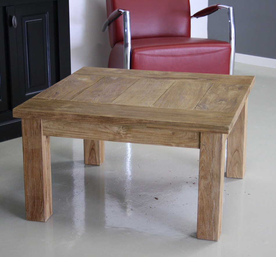 Robuust afgewerkte salontafel 80x80cm. De hoogte van de tafel is 45cm. Het teakhout van de salontafel is geborsteld. Tussen de planken is wat ruimte opengelaten wat zorgt voor een stoere uitstraling.