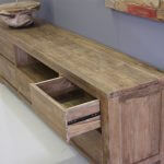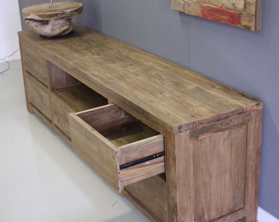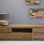 Strak tv meubel met een robuuste uitstraling. Het model is strak afgewerkt, het teakhout is geborsteld. Zes praktische laden. Type Rotterdam.