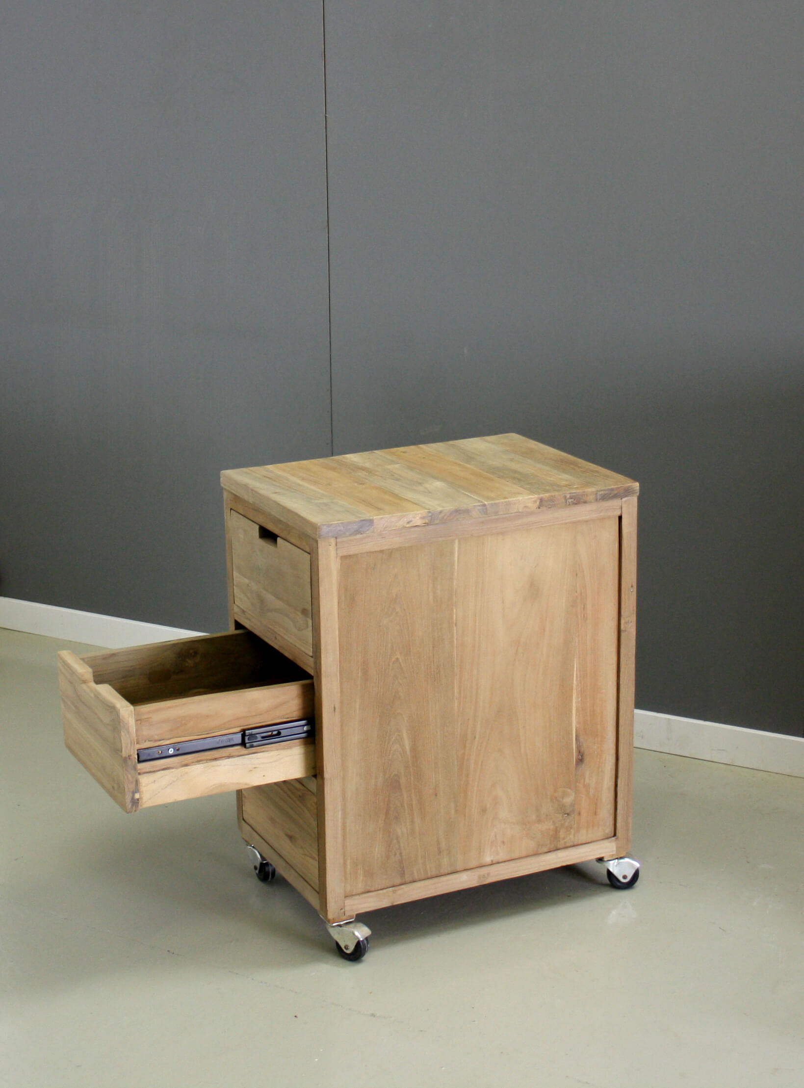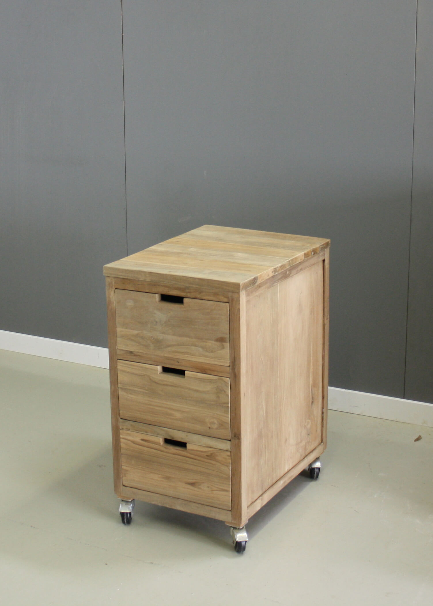 Rollerboy van teakhout. Drie diepe laden. Een ideaal kastje om te combineren met ons bureau “Stijl“. Het is een heel fijn en handig kastje.