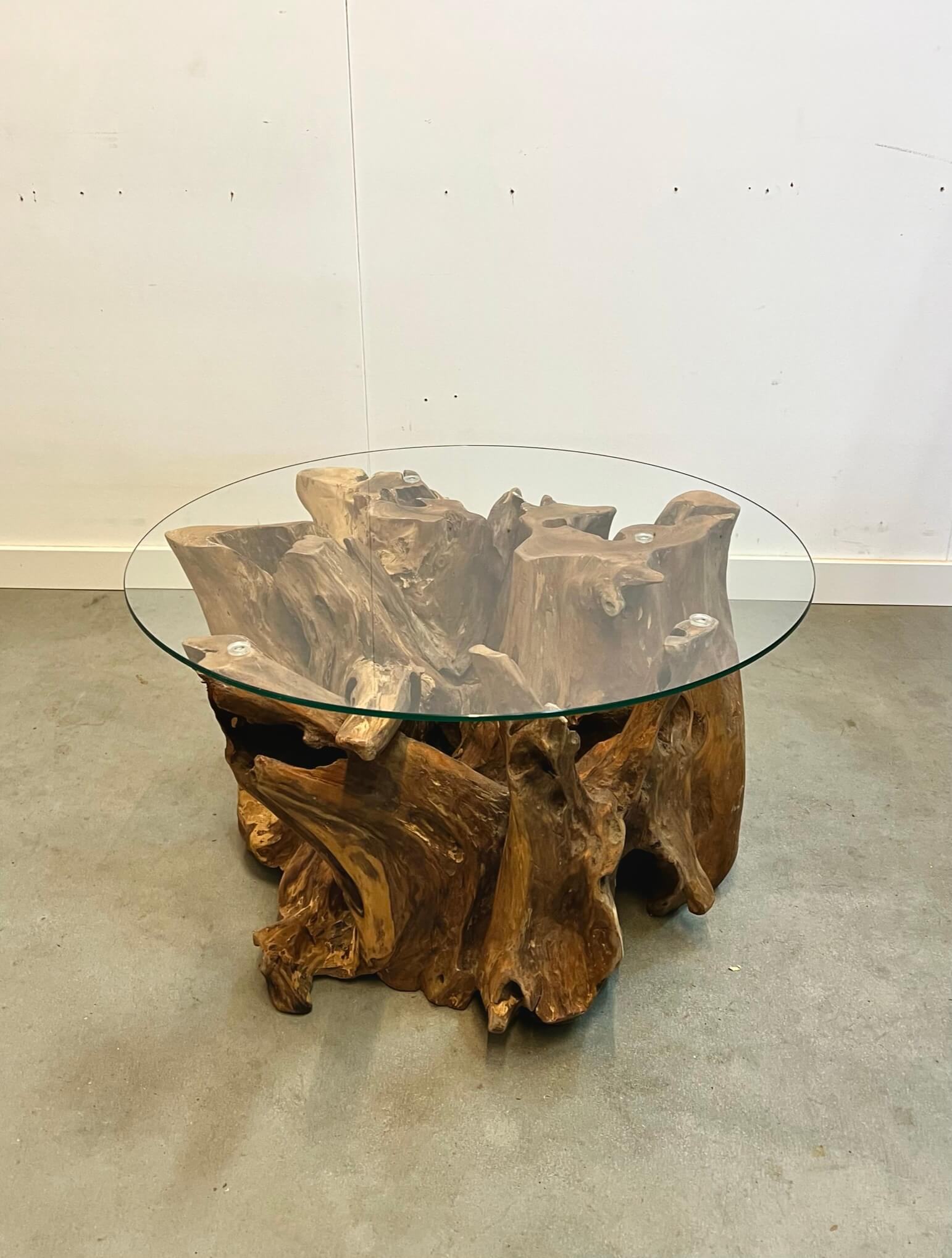 Robuuste salontafel gemaakt van teakhout. Het onderstel is gemaakt van de wortel van een boomstam. De combinatie van het ruwe hout met de glasplaat zorgt voor een elegant geheel.