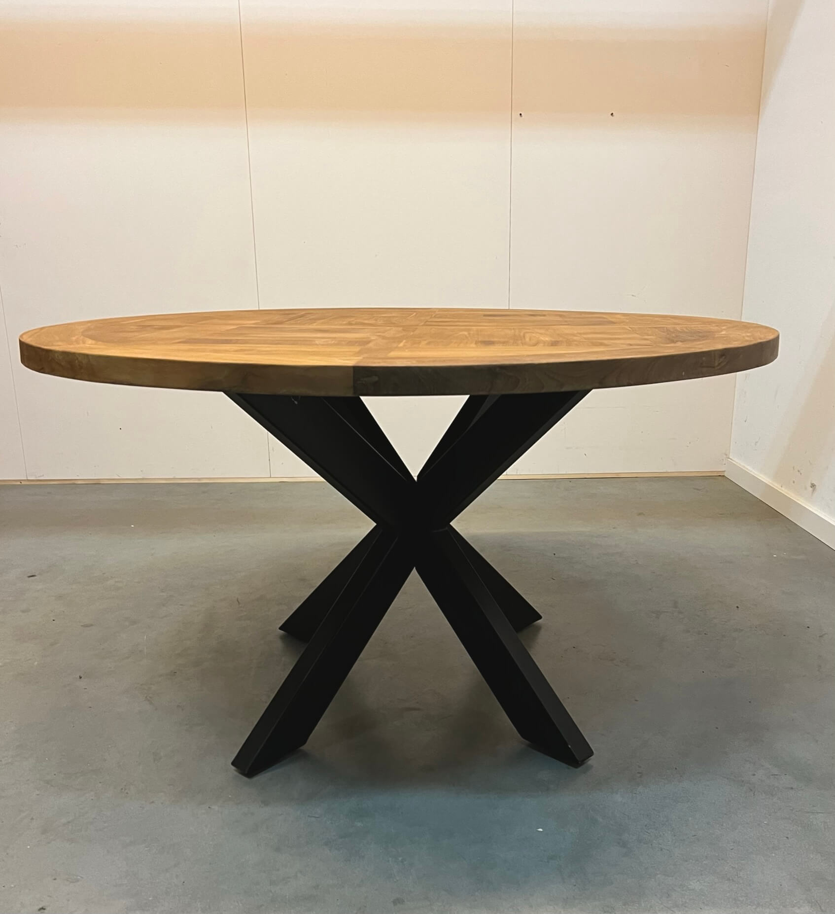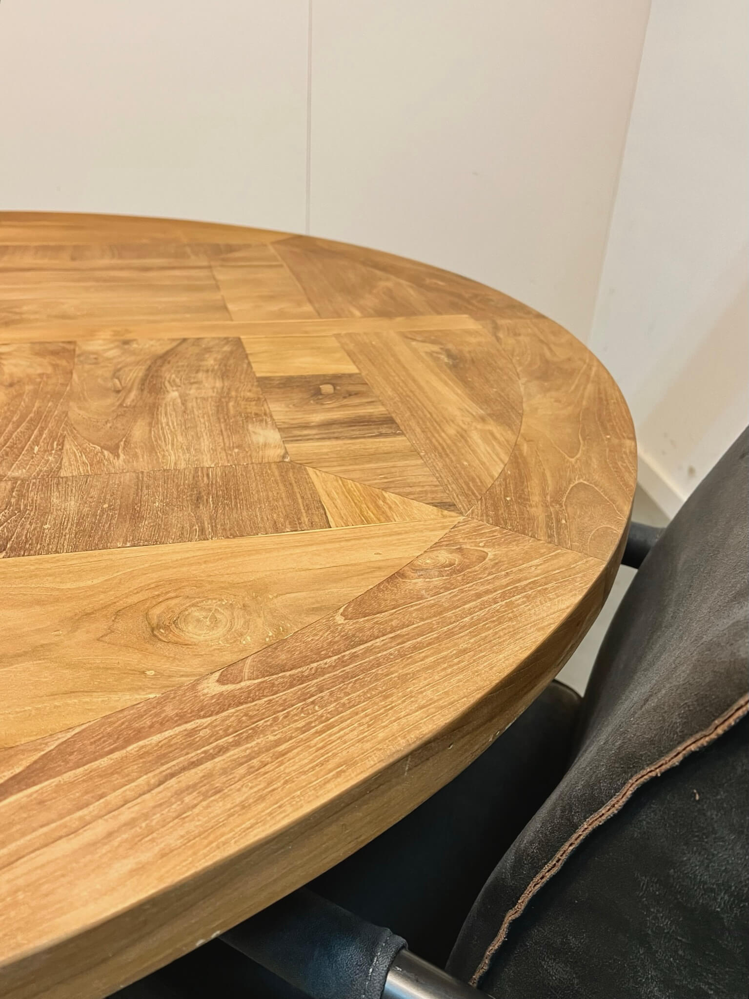 Ronde eetkamer tafel met ingelegd blad. De tafel heeft een metalen kruispoot. Met deze tafel bent u verzekerd van jaren woonplezier!
