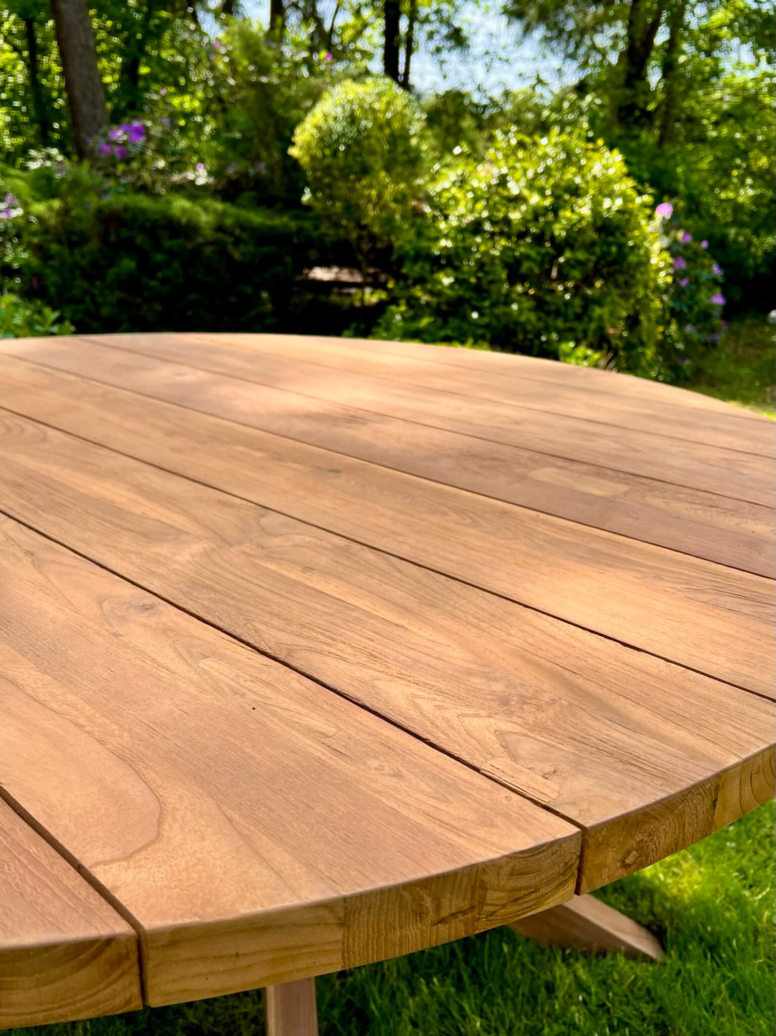 Ronde tuintafel gemaakt van gerecycled teakhout. De tafel is licht opgeruwd voor een natuurlijk effect. De tafel is leverbaar in 2 maten. De stoelen op de foto zijn niet meer leverbaar.