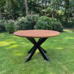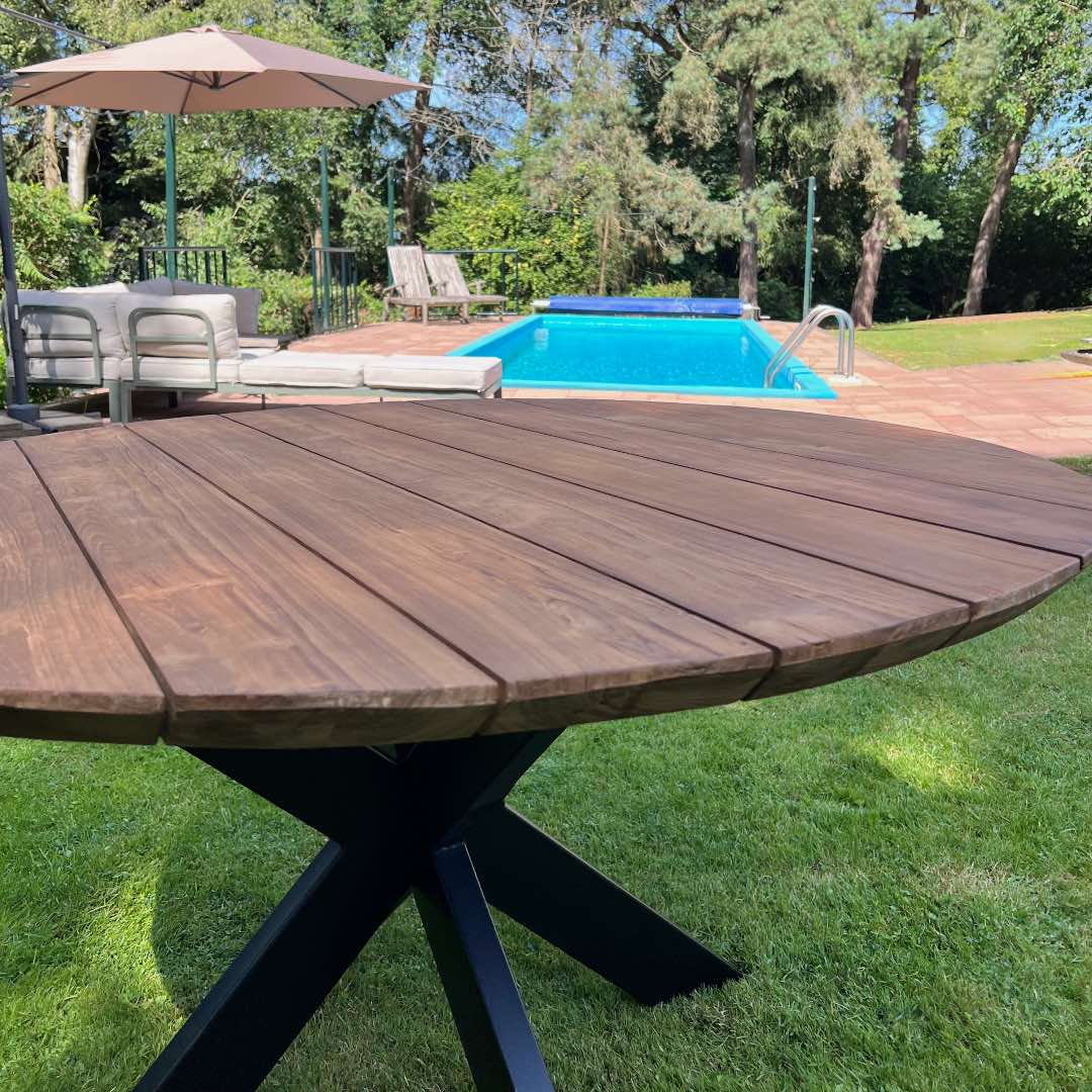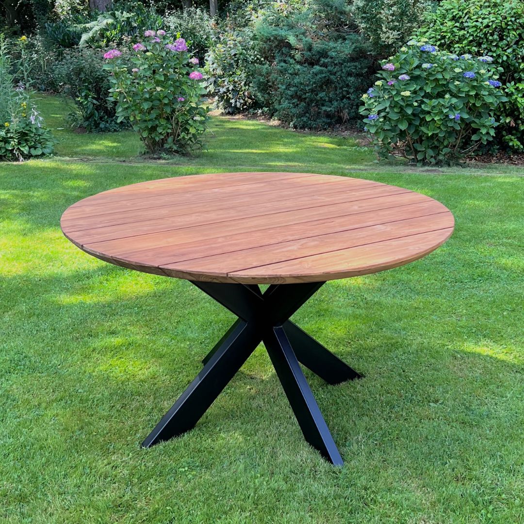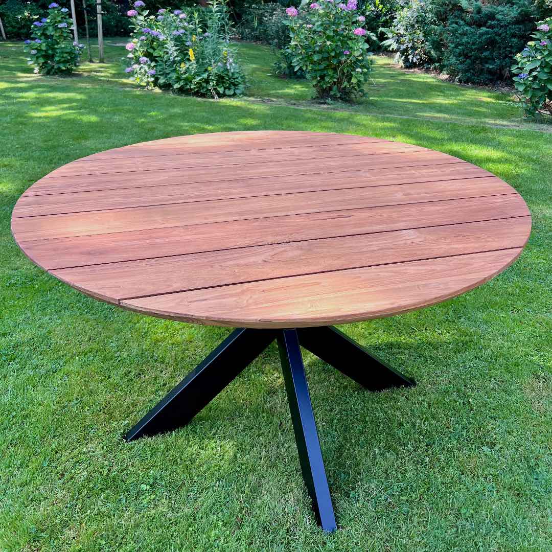 Deze stijlvolle ronde tuintafel combineert natuurlijk materiaal met een industriële poot. Het blad is gemaakt van gerecycled teakhout, wat zorgt voor een warme en natuurlijke uitstraling. Het blad is 4cm massief teakhout en heeft een verjongde rand. De stalen kruispoot geeft de tafel een stoer, industrieel accent en is eerst gegalvaniseerd en daarna gepoedercoat – voor optimale bescherming tegen roest en weersinvloeden.