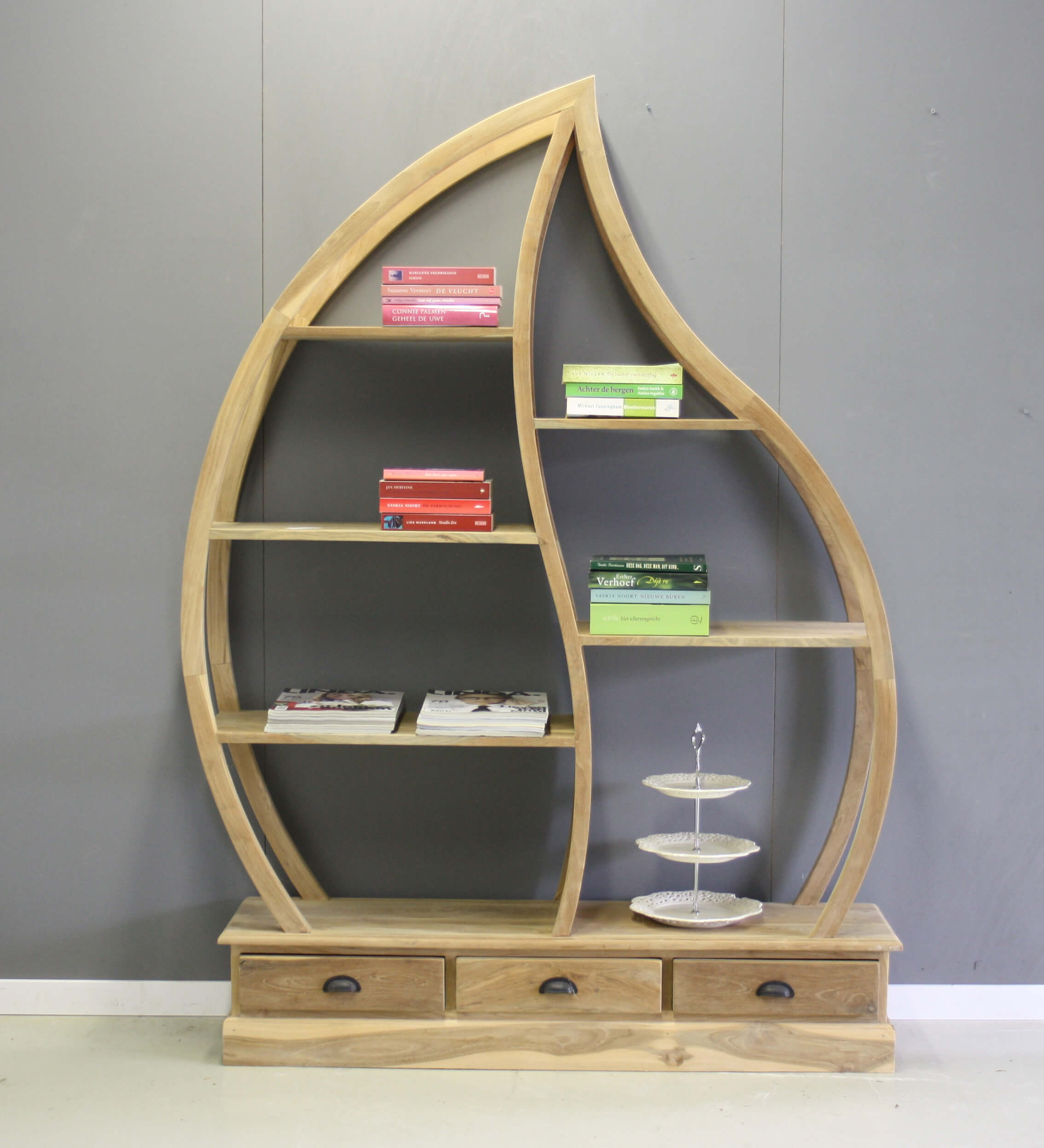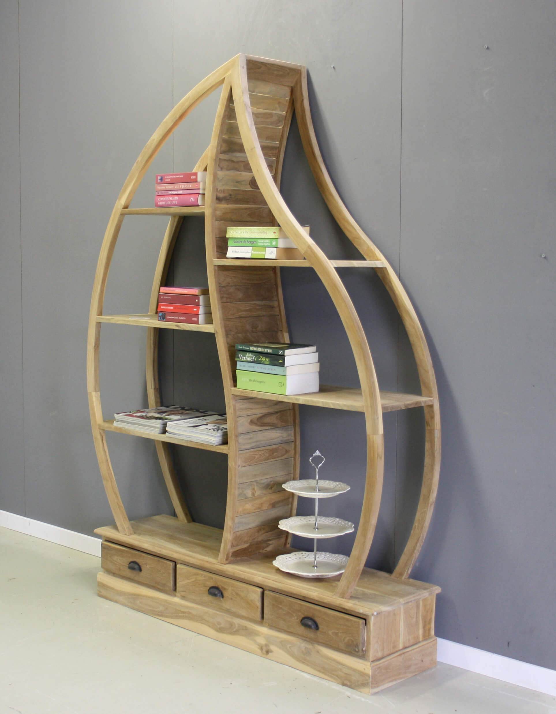 Roomdivider van teakhout in de vorm van een druppel. Het teakhout is onbehandeld.