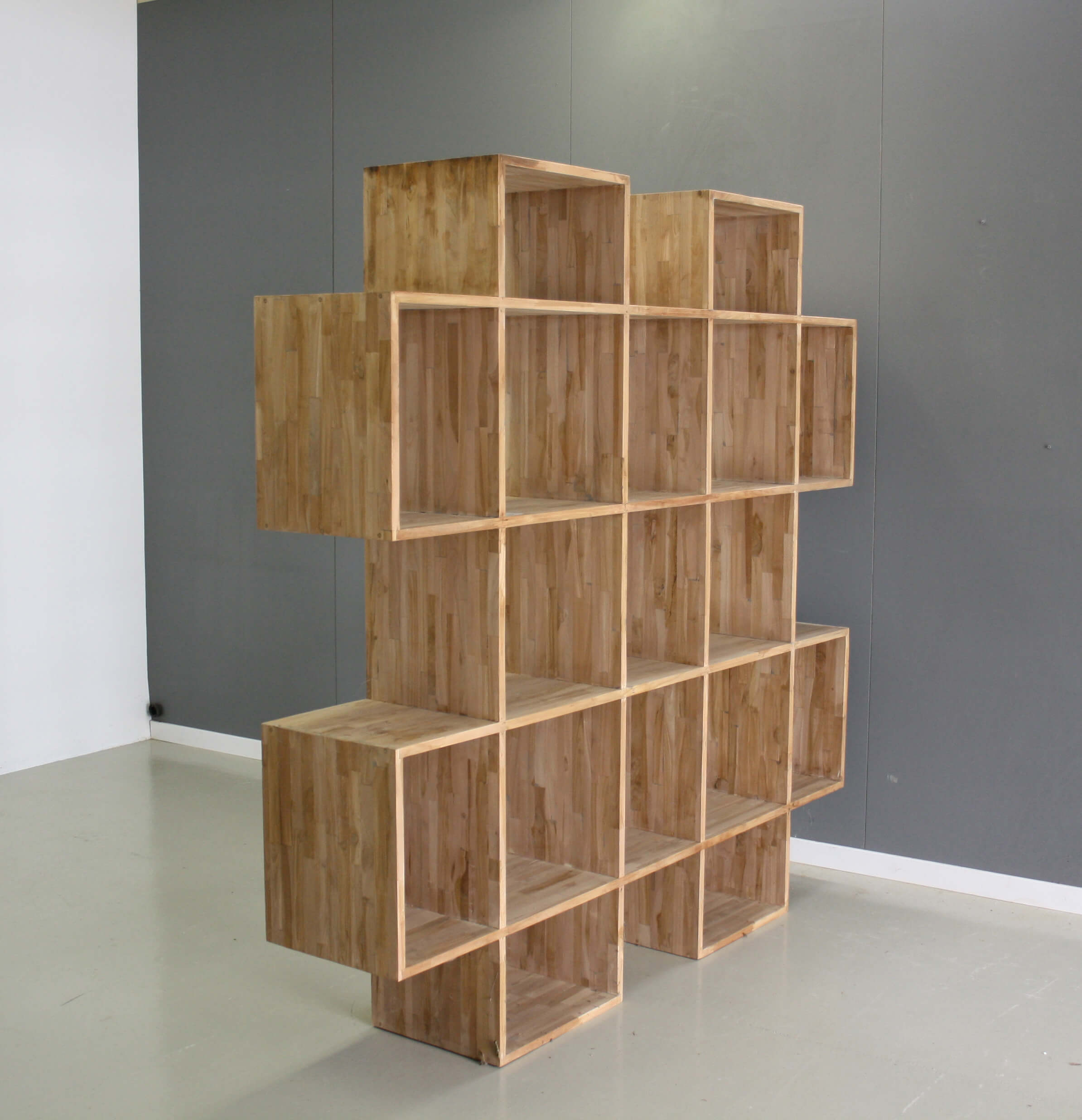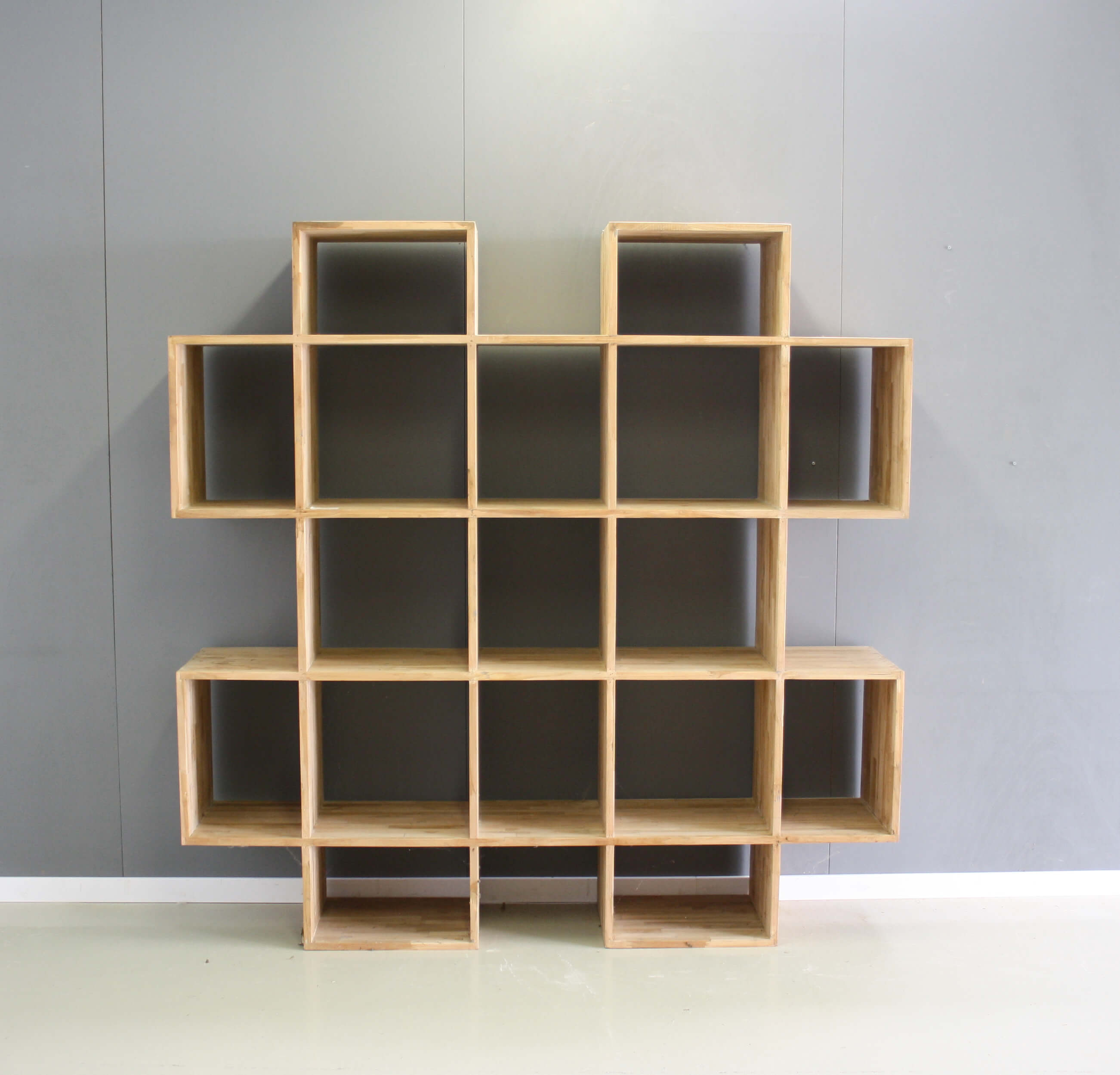 Roomdivider van teakhout. Speels vormgegeven kast die je op verschillende manieren neer kunt zetten.