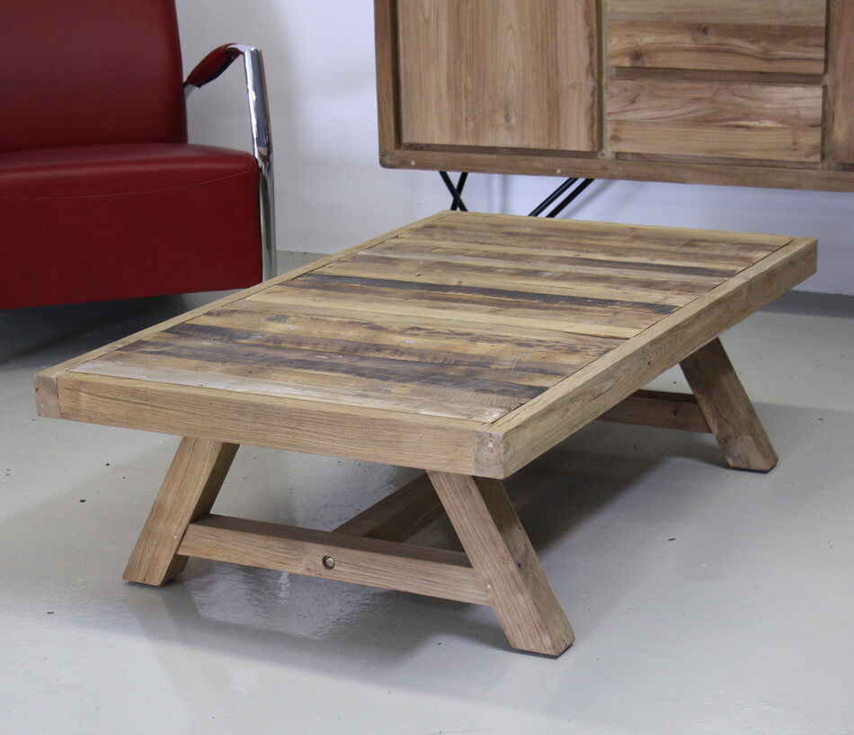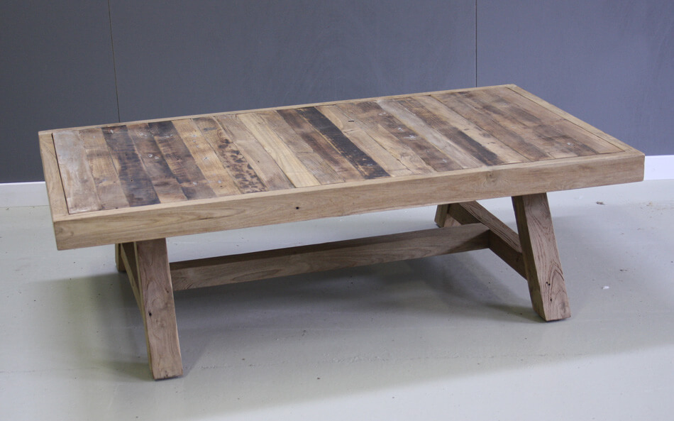 Langwerpige salontafel subtiel gekleurd met krijtwas in natuurlijke tinten.