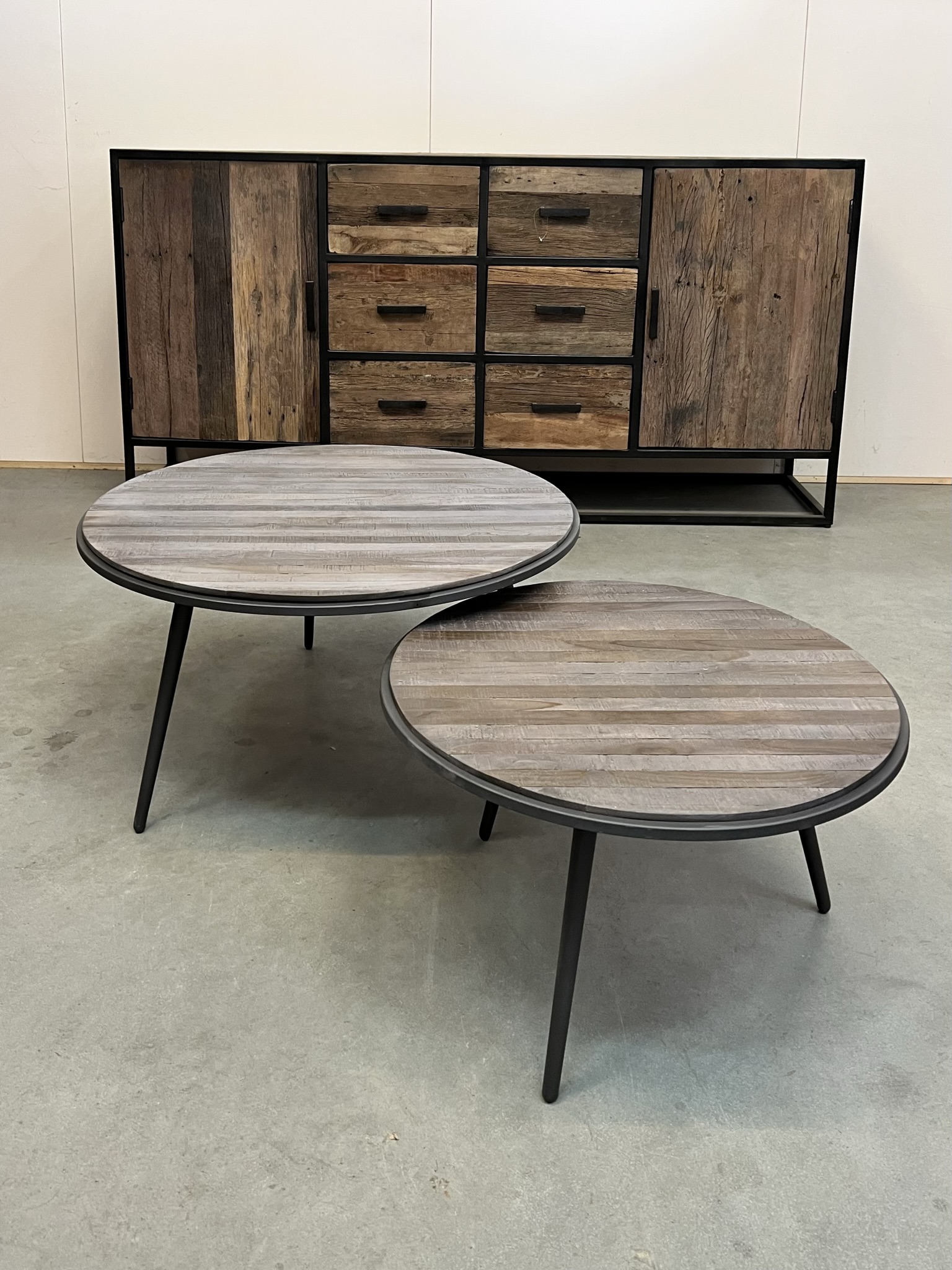 Set van 2 salontafels. De tafels zijn verschillend van hoogte en diameter.