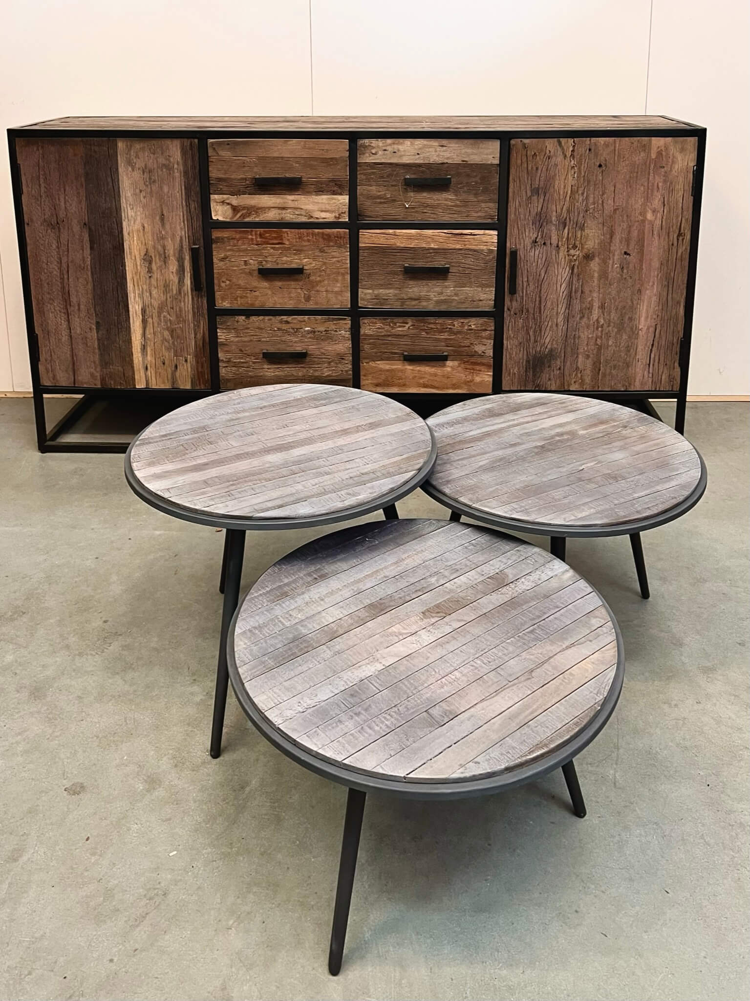 Speelse set van 3 salontafels. De tafelbladen hebben allemaal de zelfde diameter, maar verschillende hoogtes.