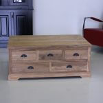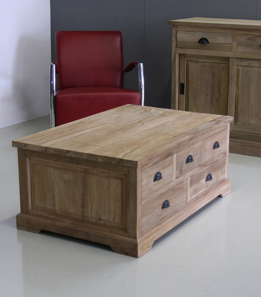 Salontafel van teakhout met 10 fijne laden. De tafel is 110x70cm de hoogte is 45cm