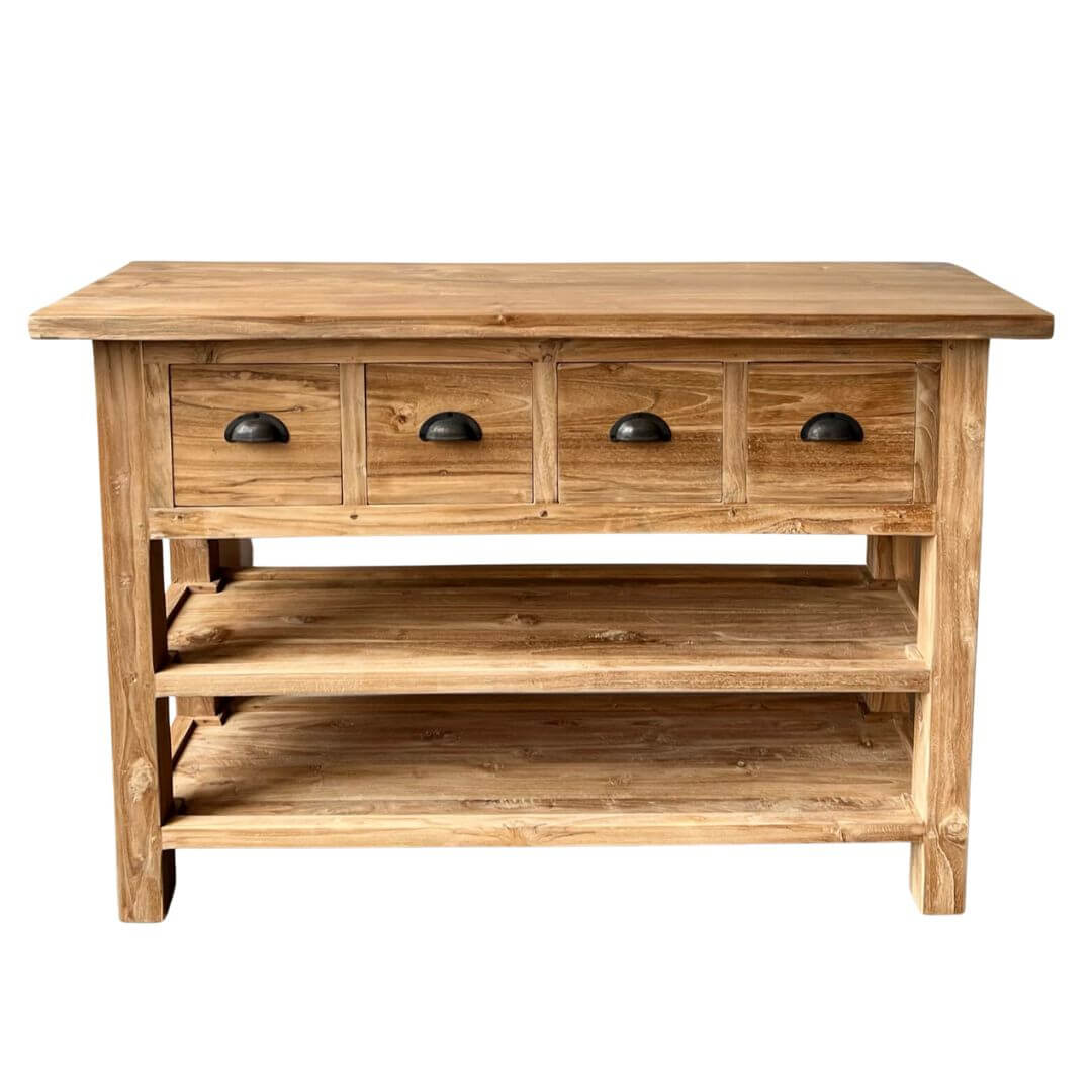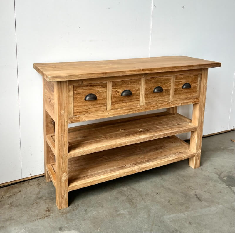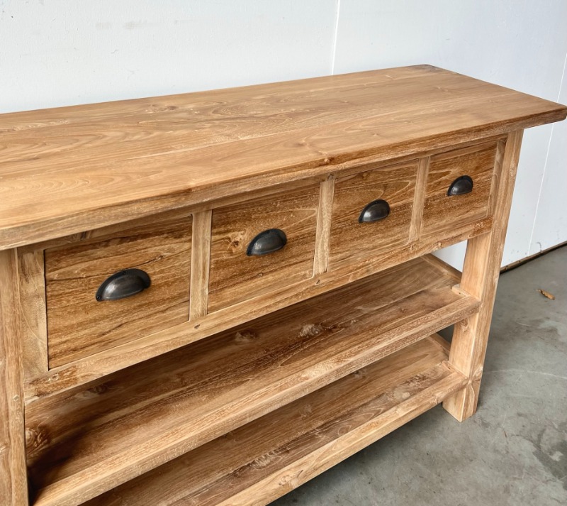 Sidetable van 120cm breed, 80cm hoog en 40cm diep. Vier diepe laden en twee planken. Dit model doet het altijd erg goed in een keuken.