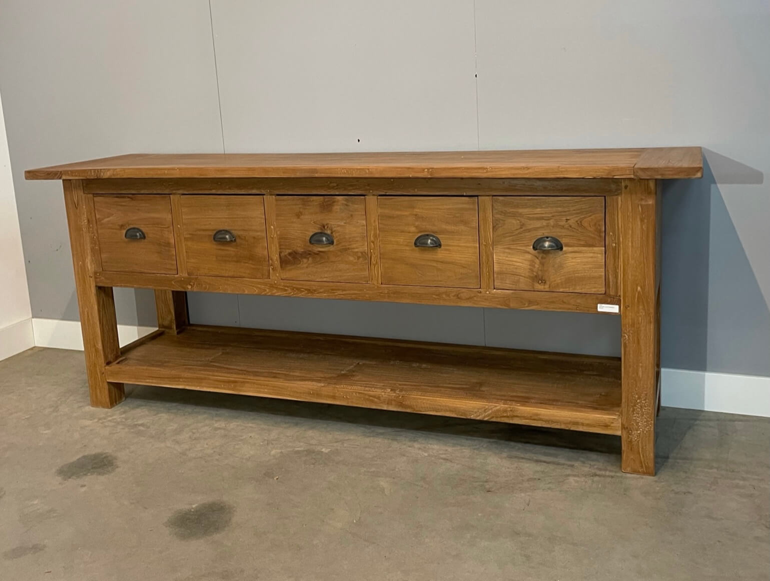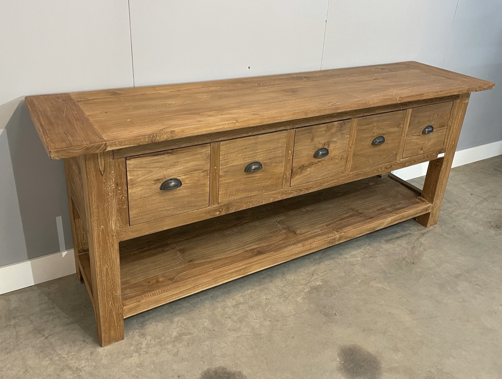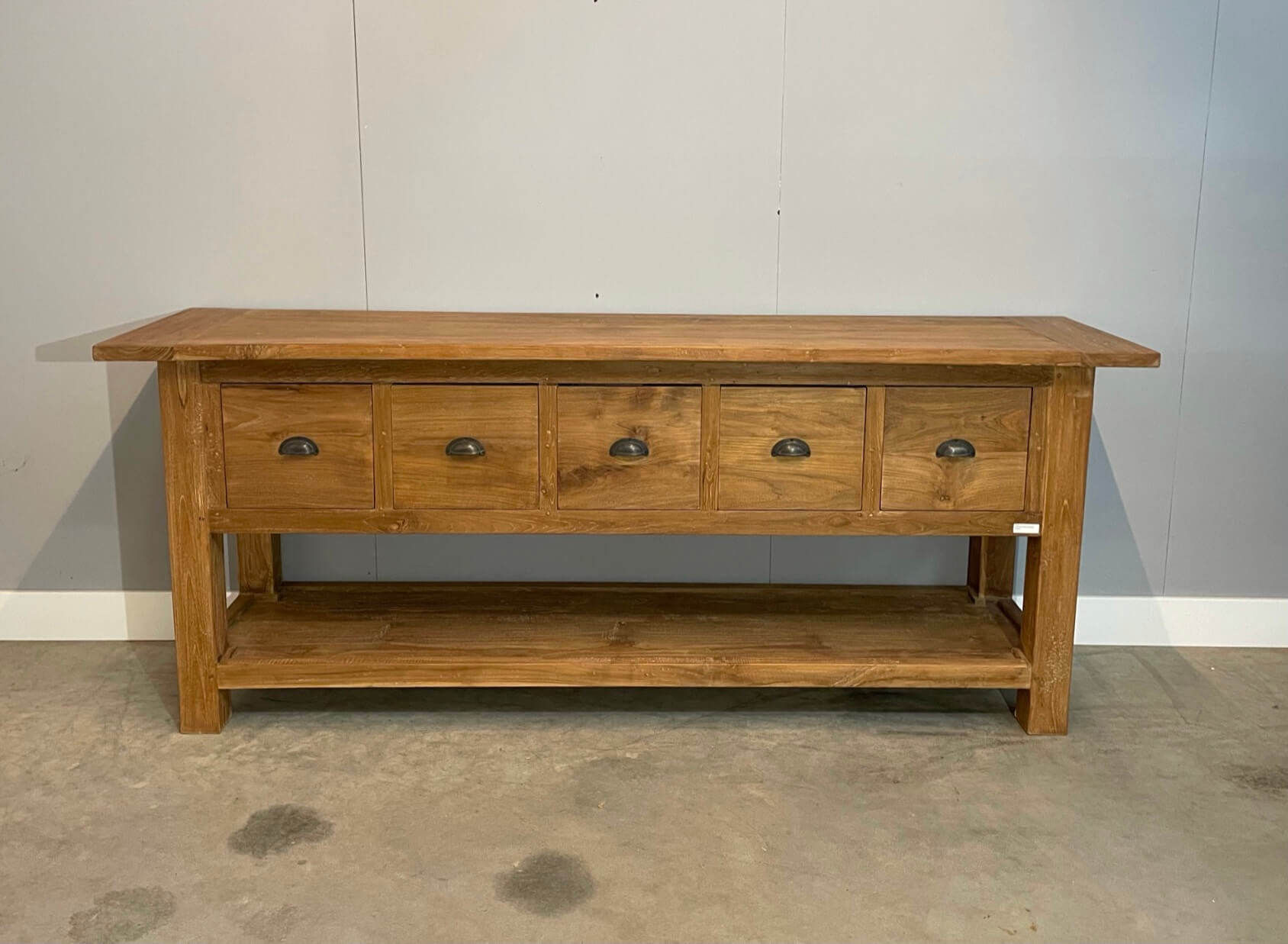 Dingklik teakhouten sidetable. De sidetable is gemaakt van kwalitatief gerecycled teakhout en is afgewerkt met een was om een wat doorleefde uitstraling te geven aan het meubel. 5 handige en diepe laden.