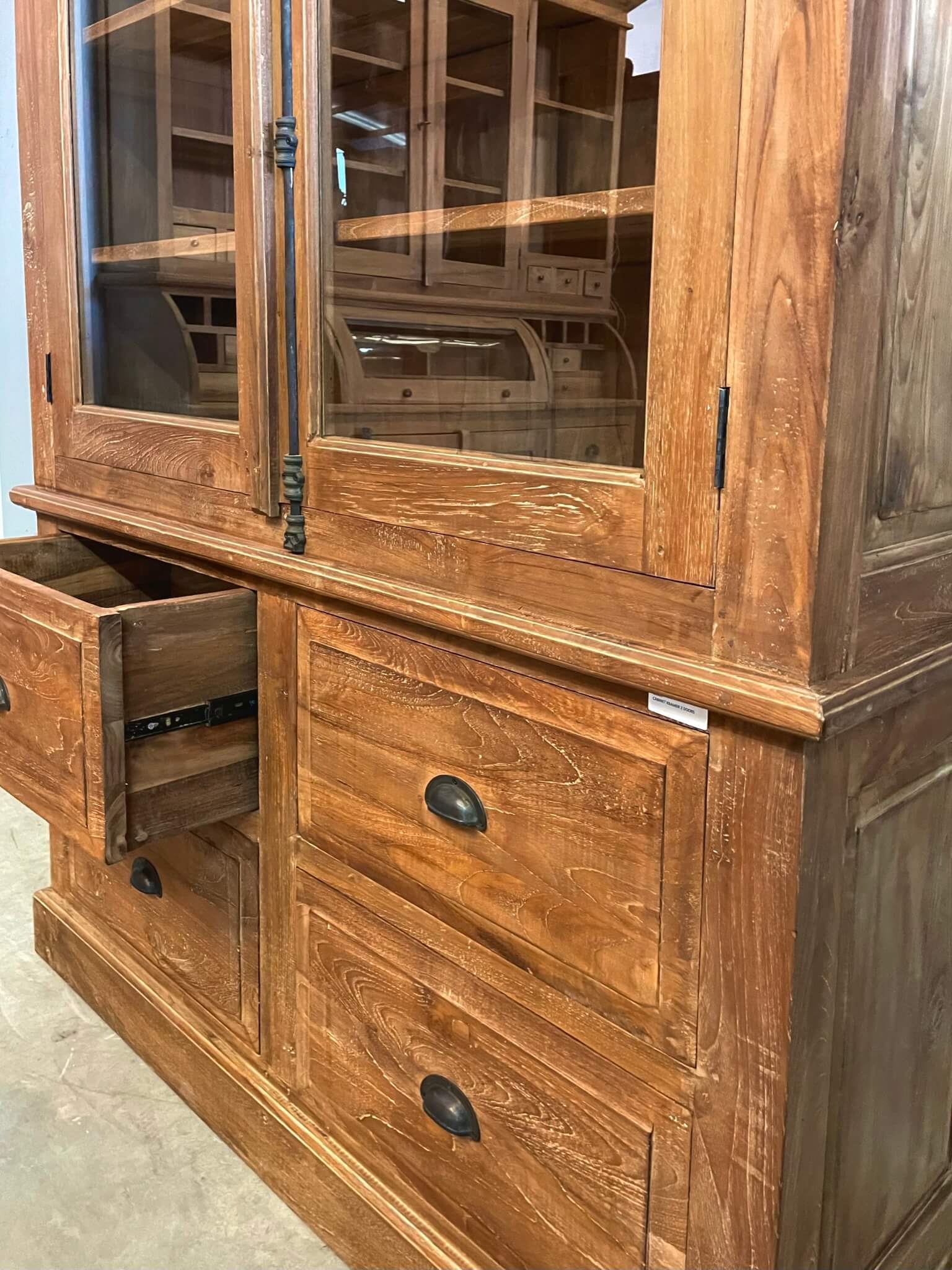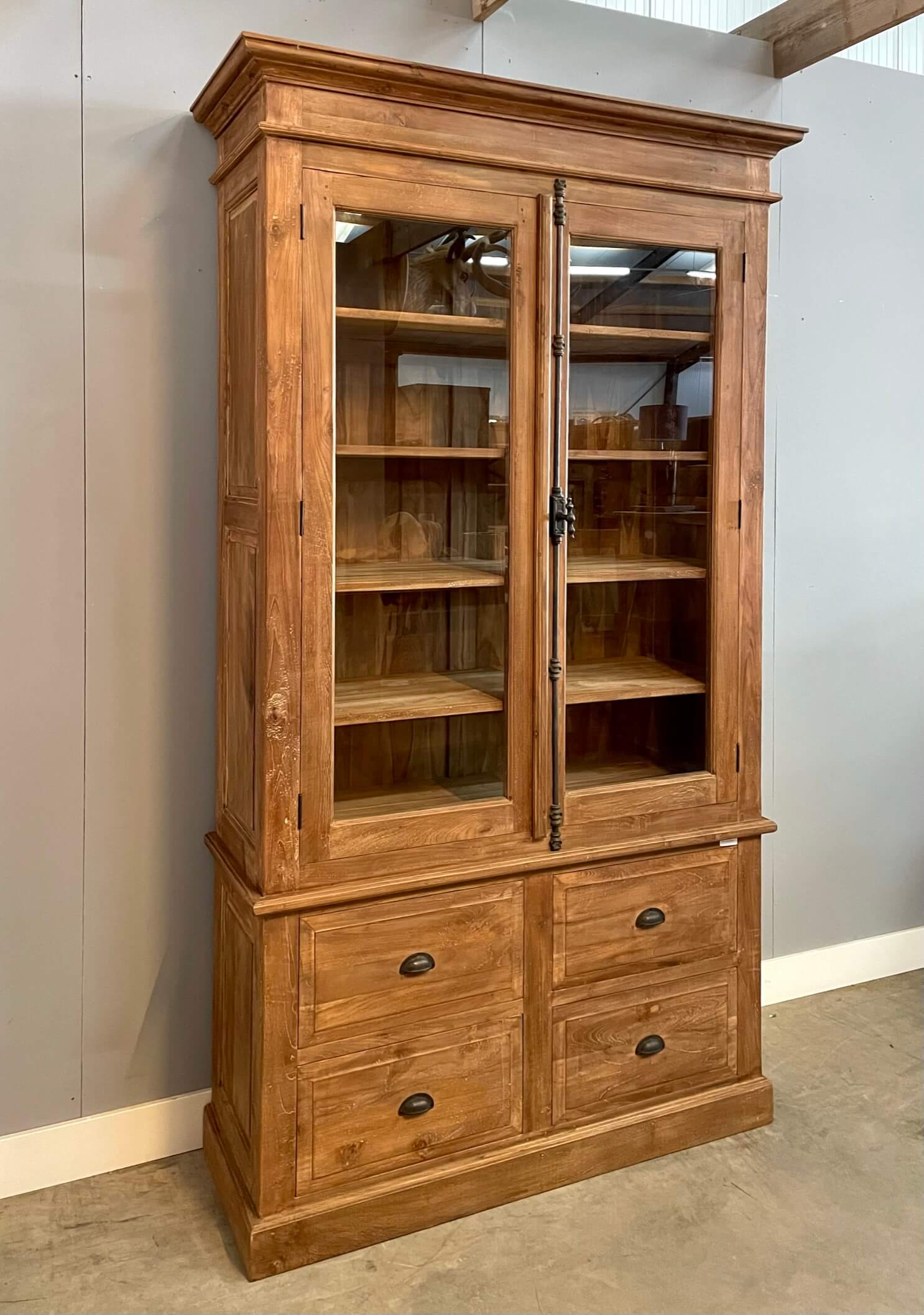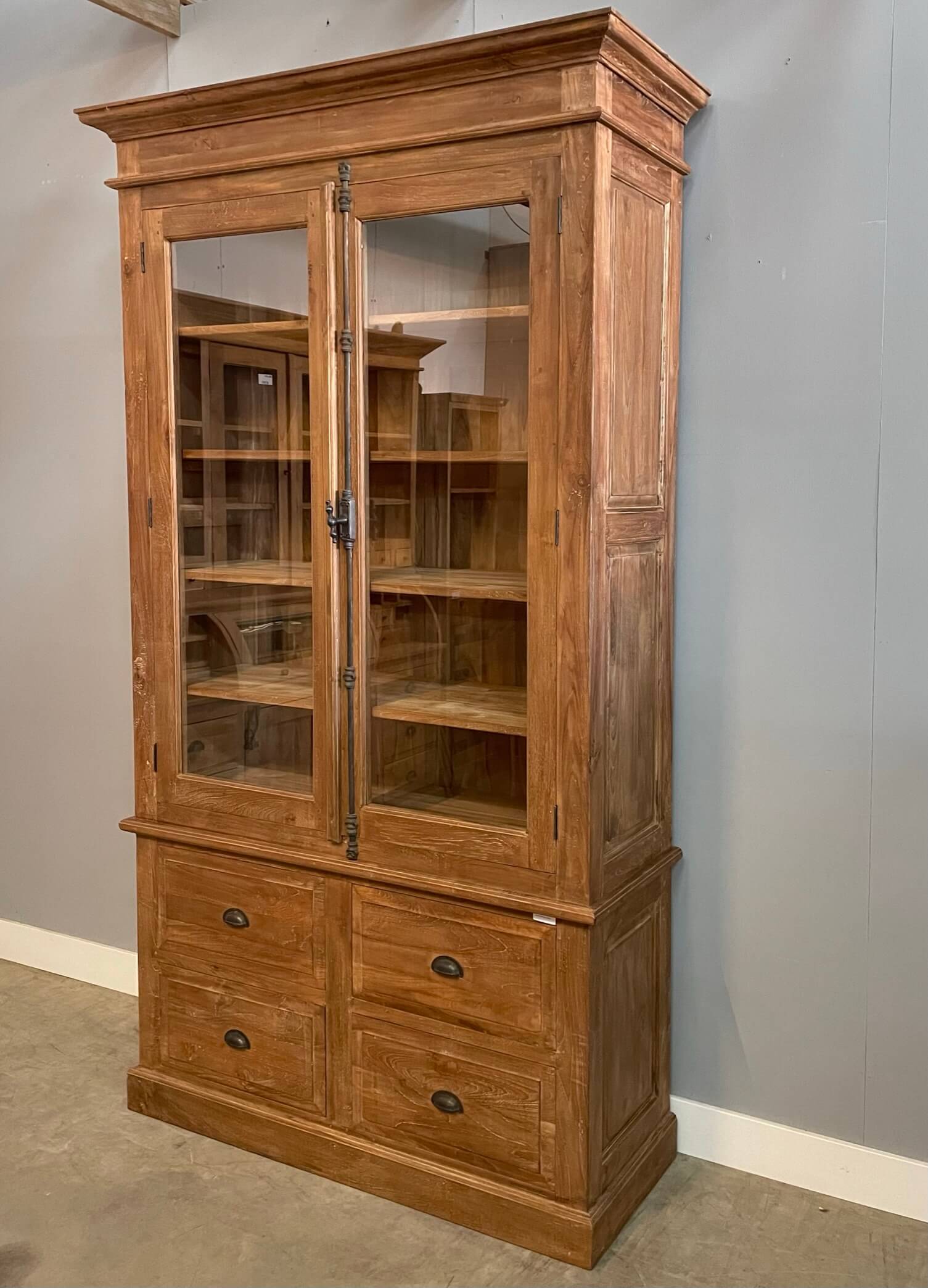 Mooi afgewerkte kast gemaakt van gerecycled teakhout met een dingklik afwerking. De kast heeft een spanjolet sluiting en de laden lopen op metalen geleiders.