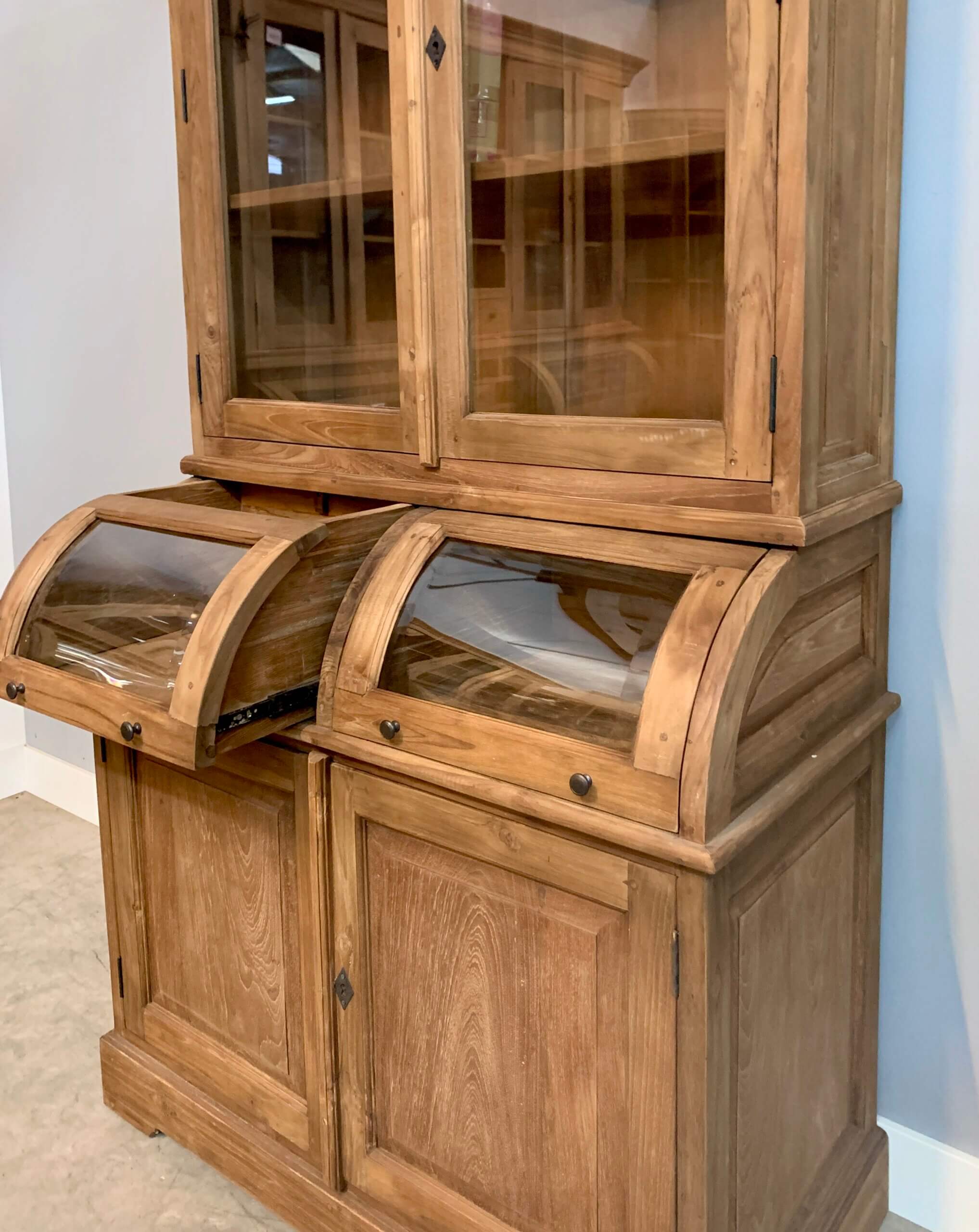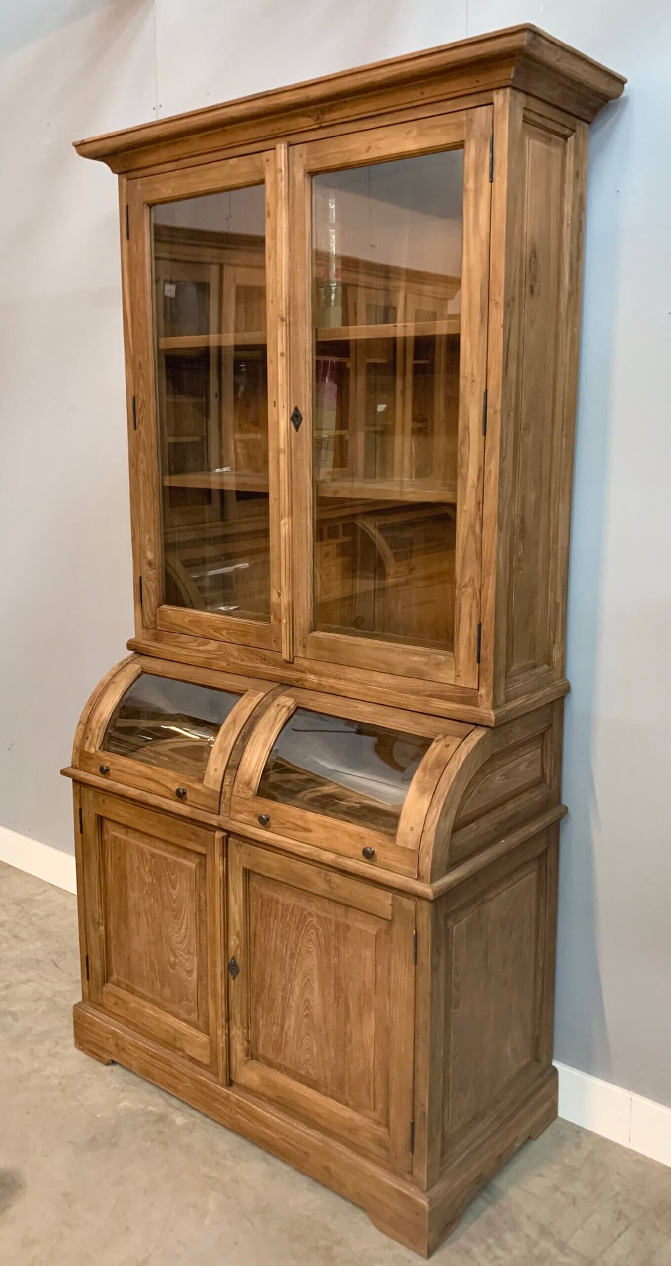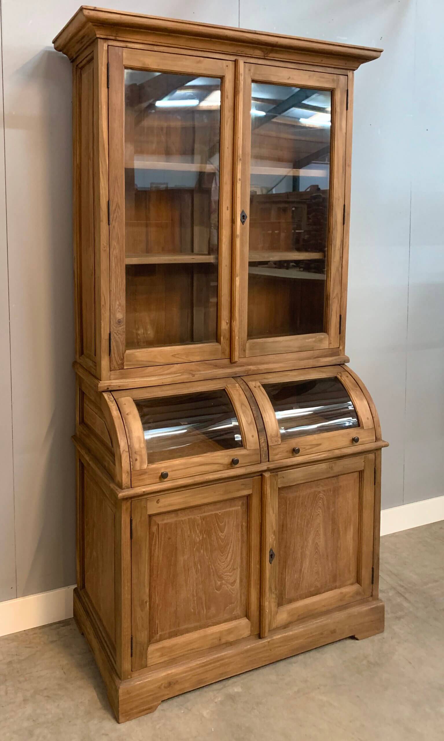 Deze smalle kast is gemaakt van gerecycled hout. De laden van deze kast gaan open op een rails.