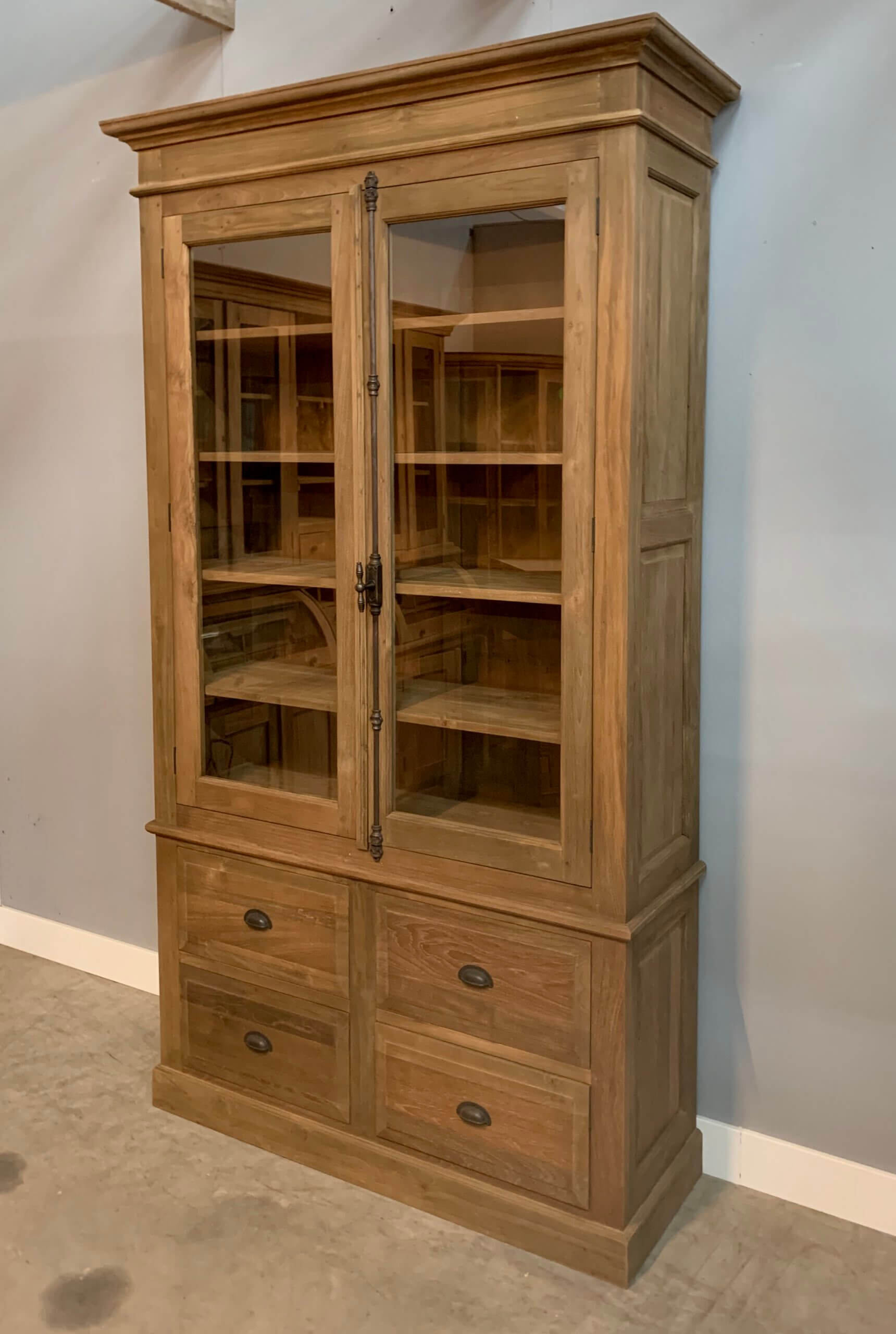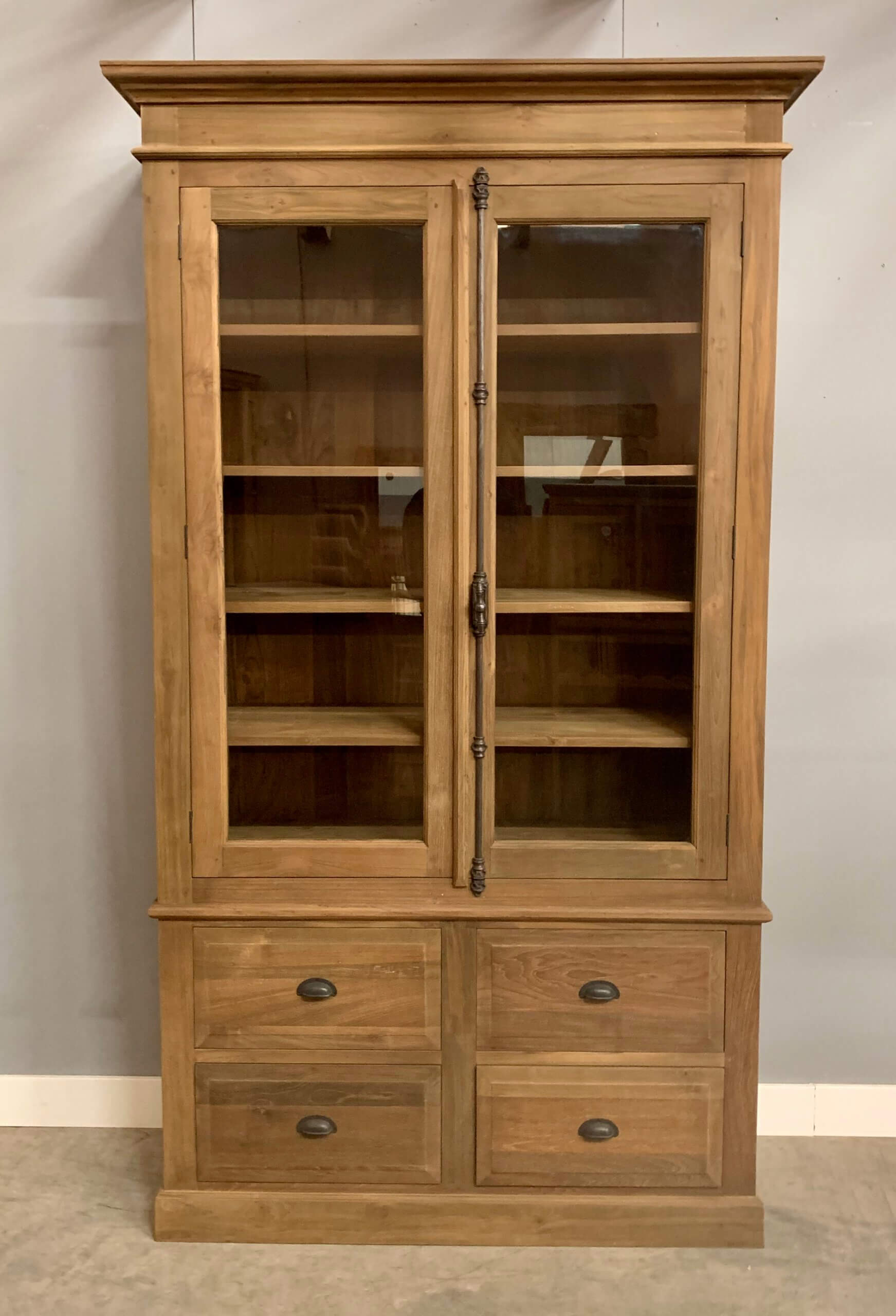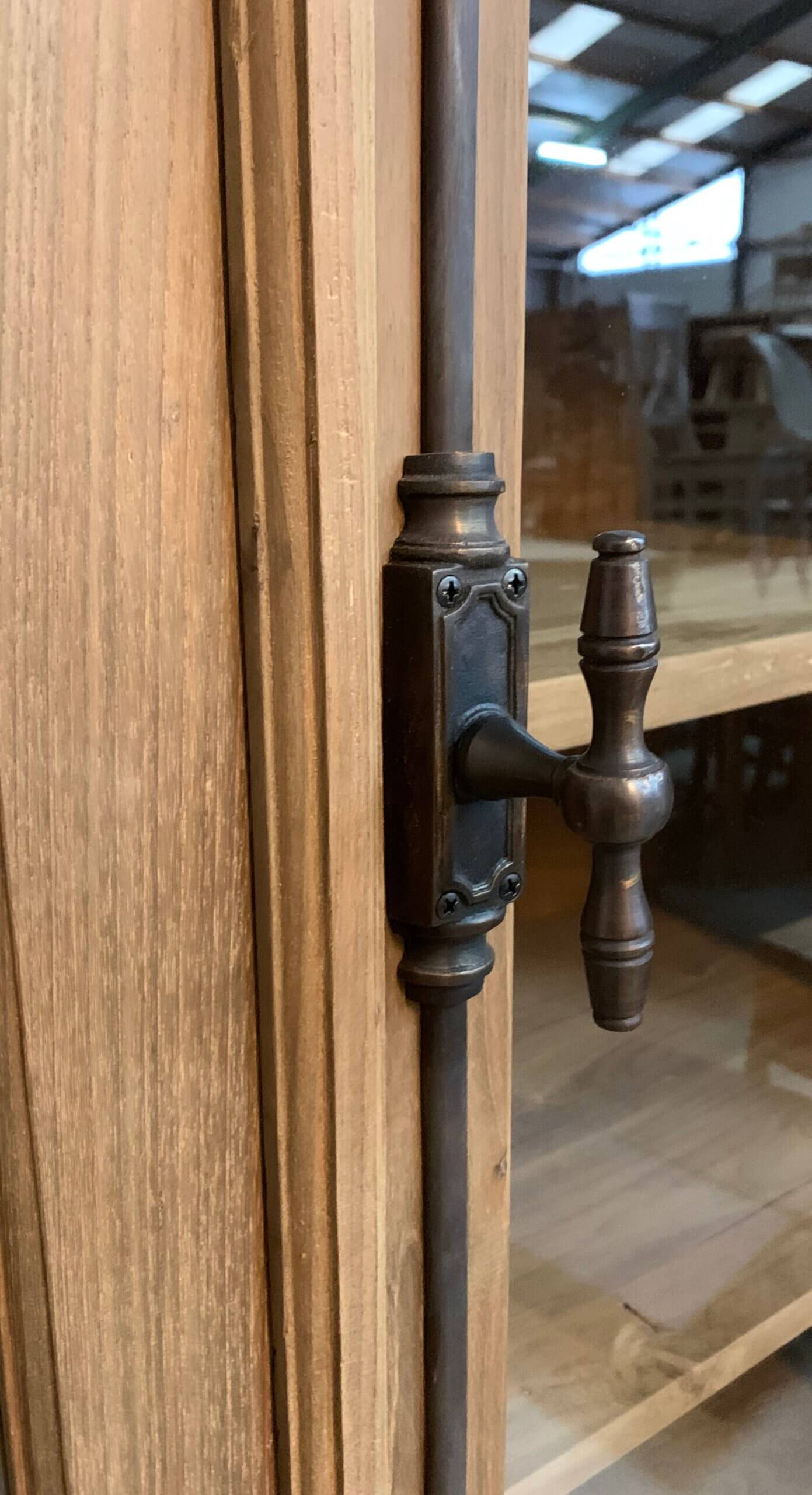 Een erg mooi afgewerkte kast gemaakt van gerecycled teakhout. De kast heeft een spanjolet sluiting. Voor het transport bestaat de kast uit 2 delen.