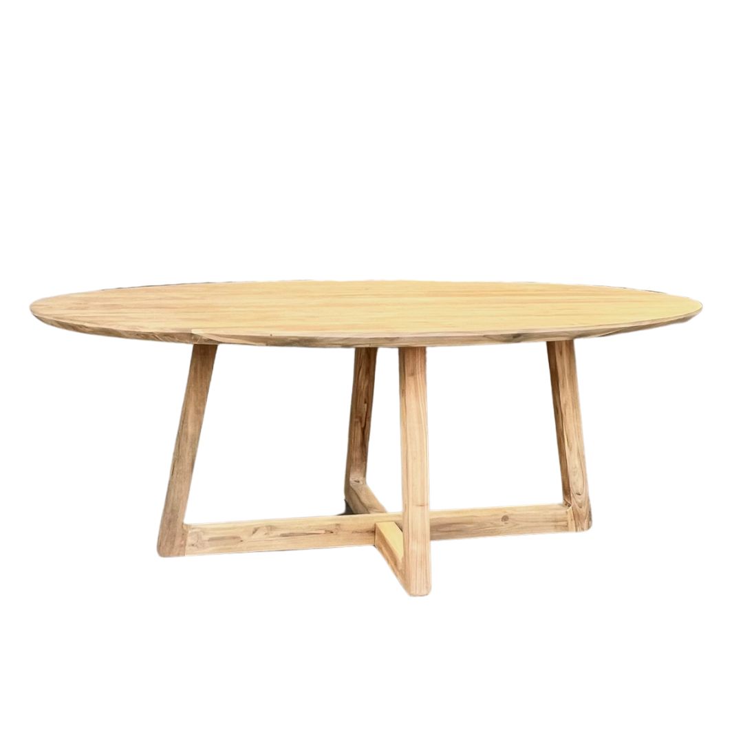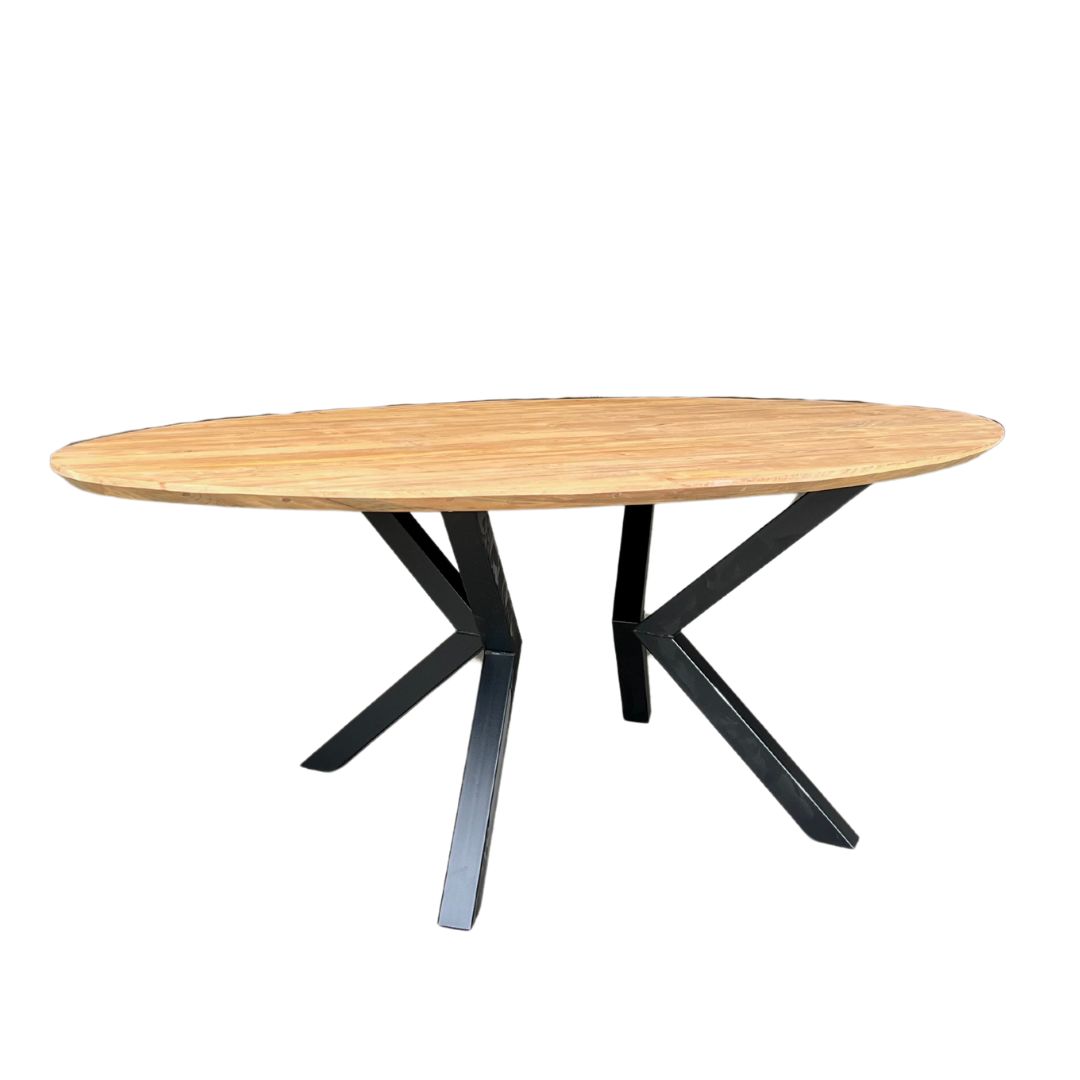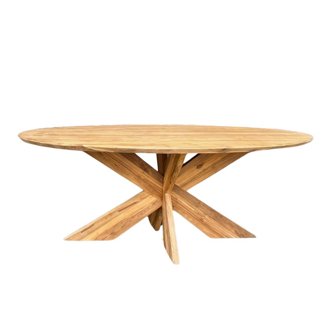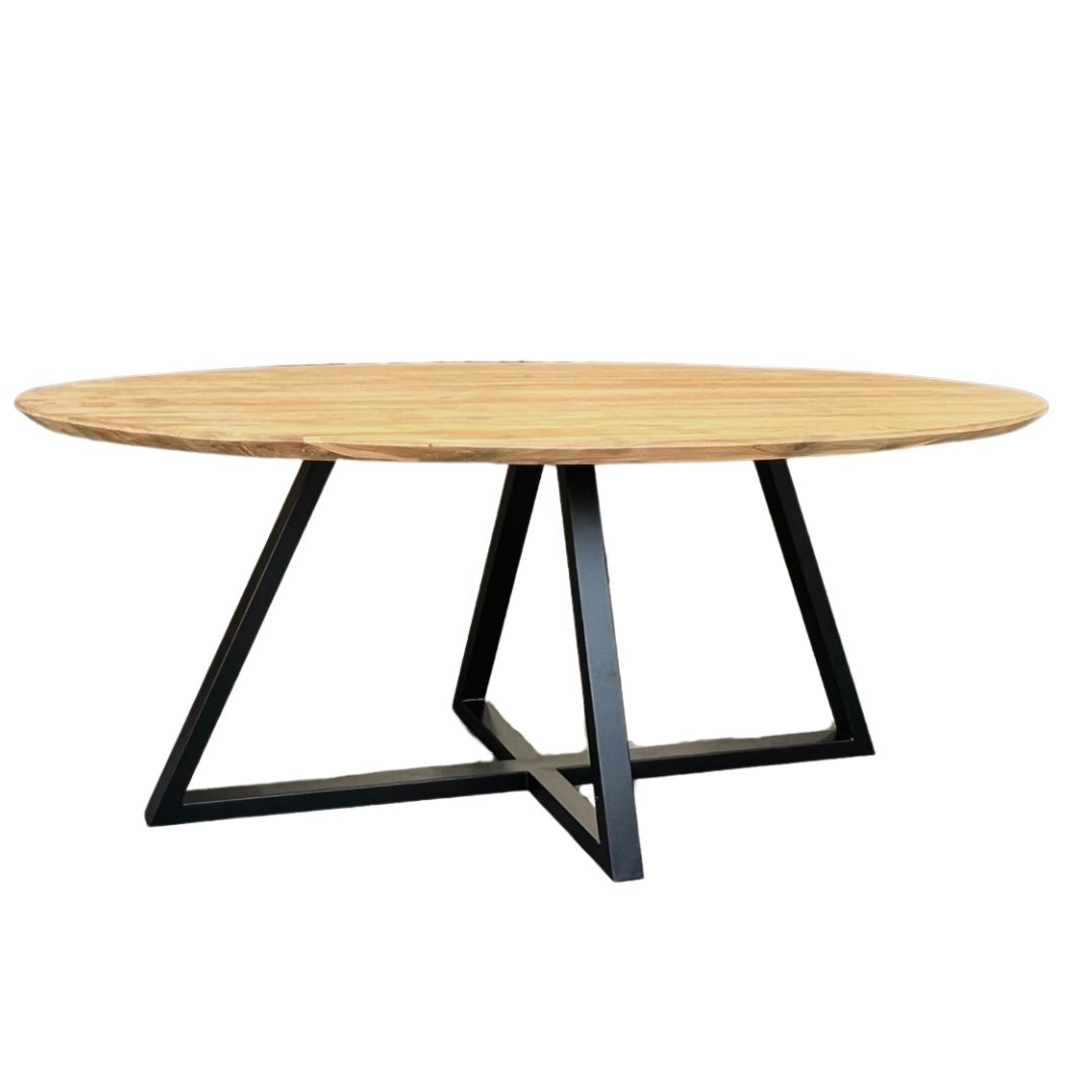 Ontdek ons 4 cm dikke ovale tafelblad met een verjongde rand van gerecycled teakhout. Kies zelf een poot en creëer een unieke tafel die perfect past in jouw interieur!