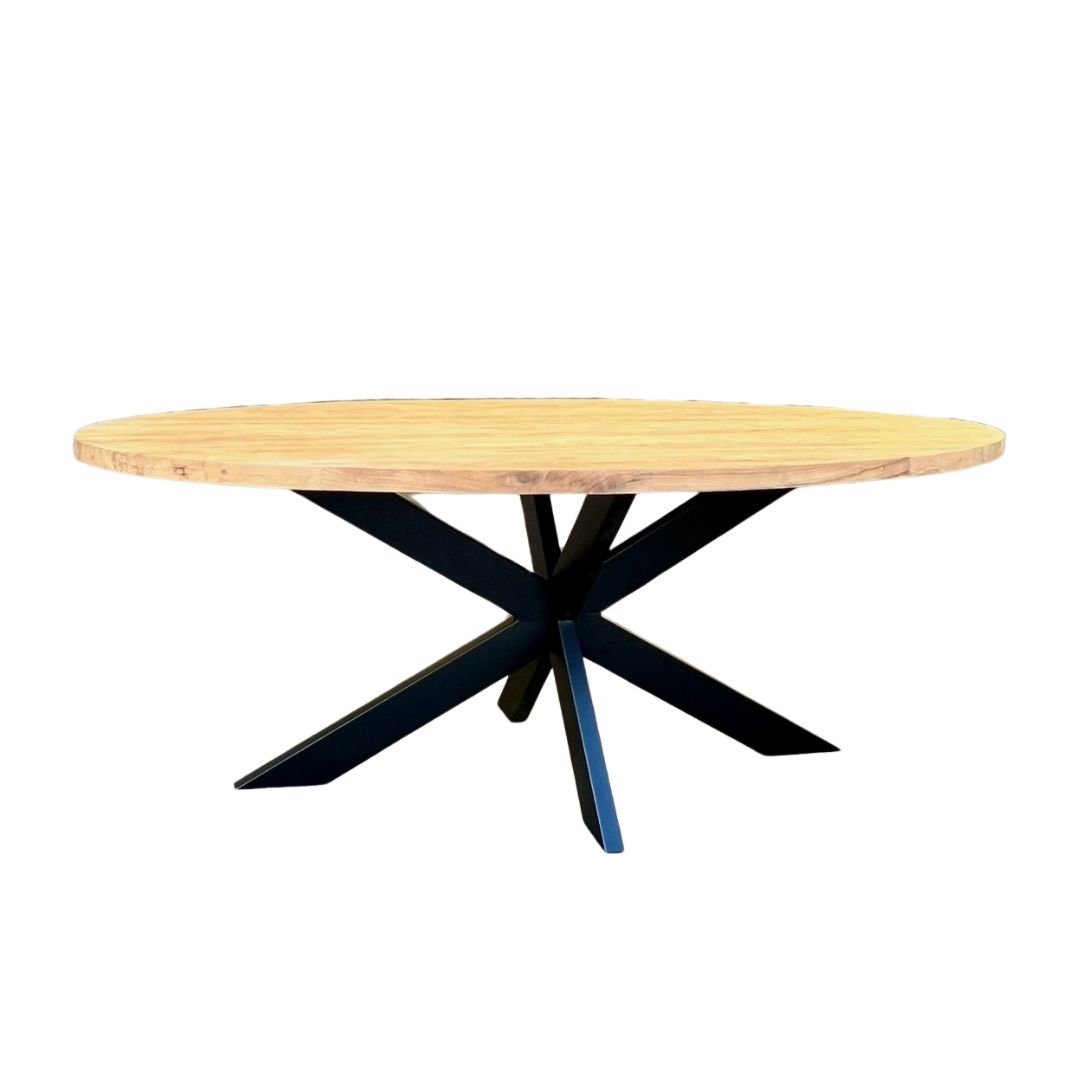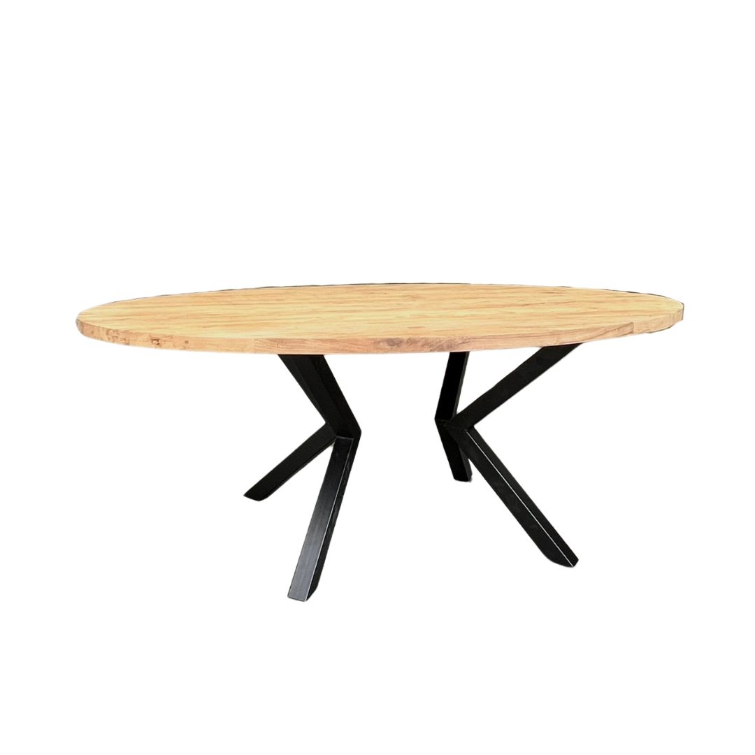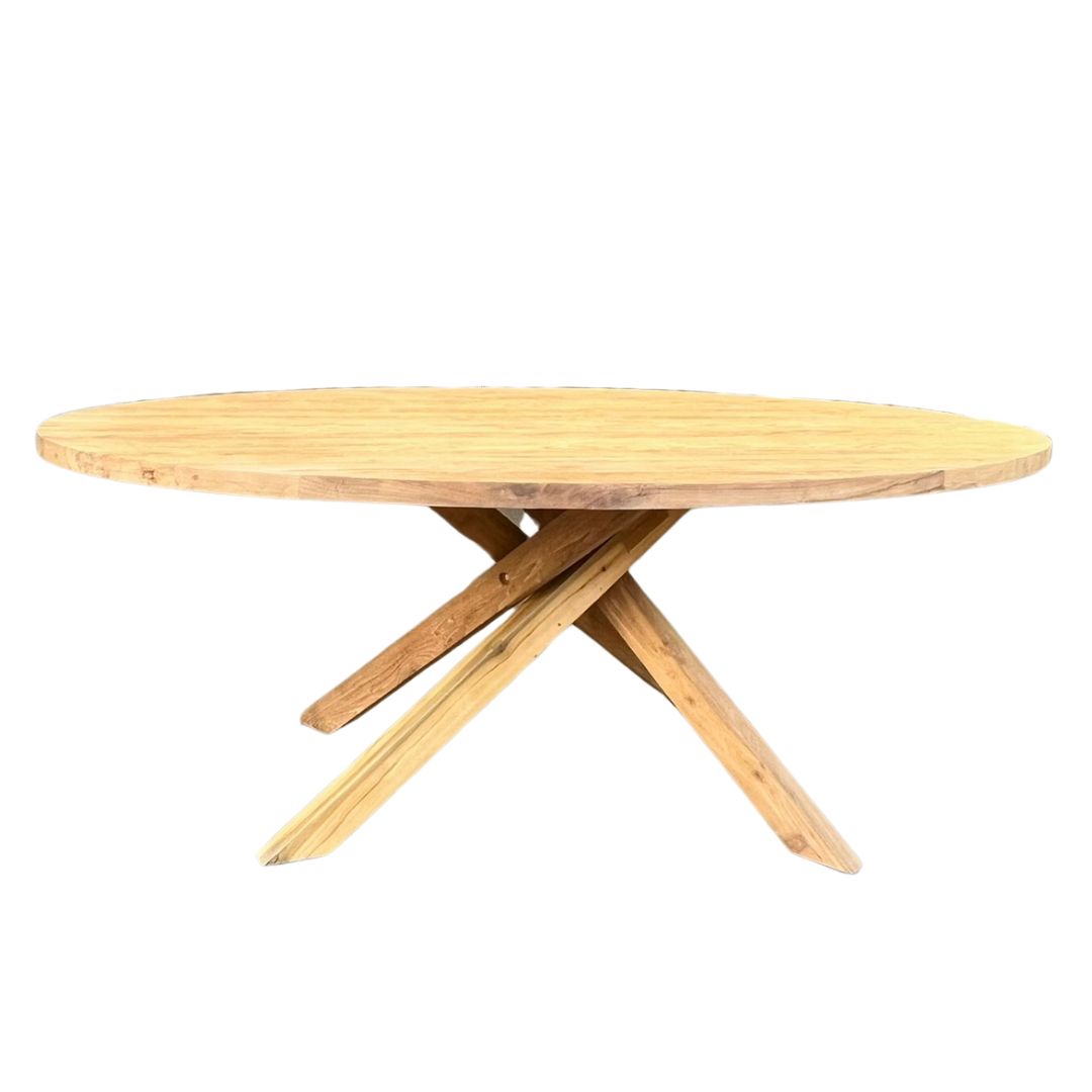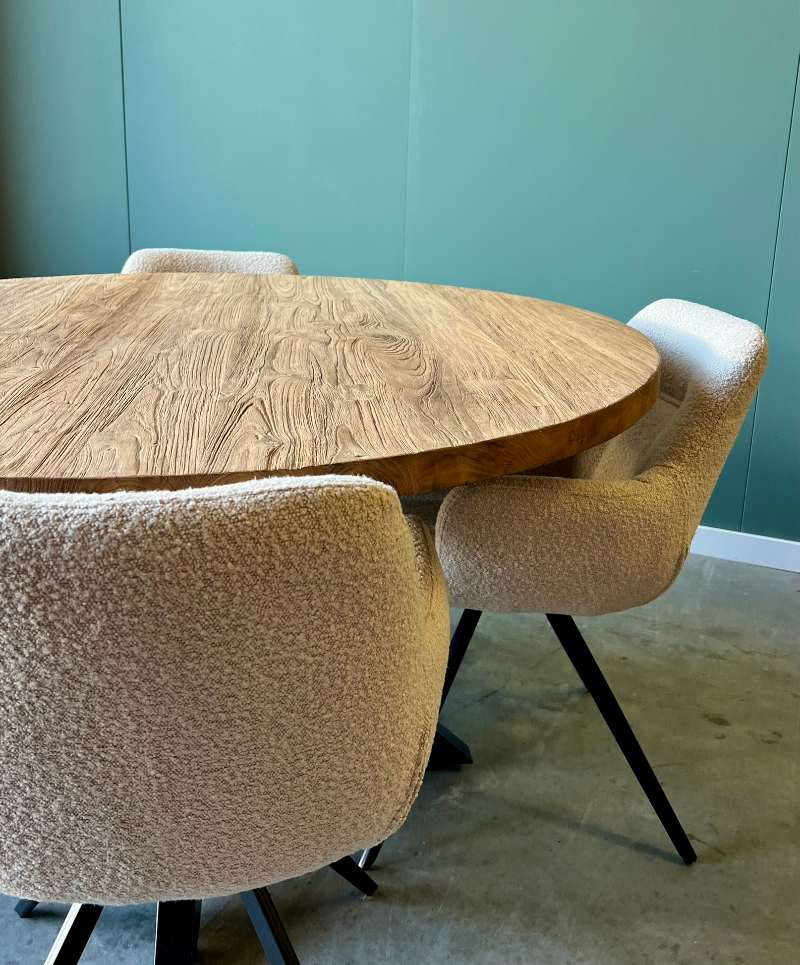 Ontdek ons 4 cm dikke ovale geborstelde blad van gerecycled teakhout. Kies zelf een poot en creëer een unieke tafel die perfect past in jouw interieur!