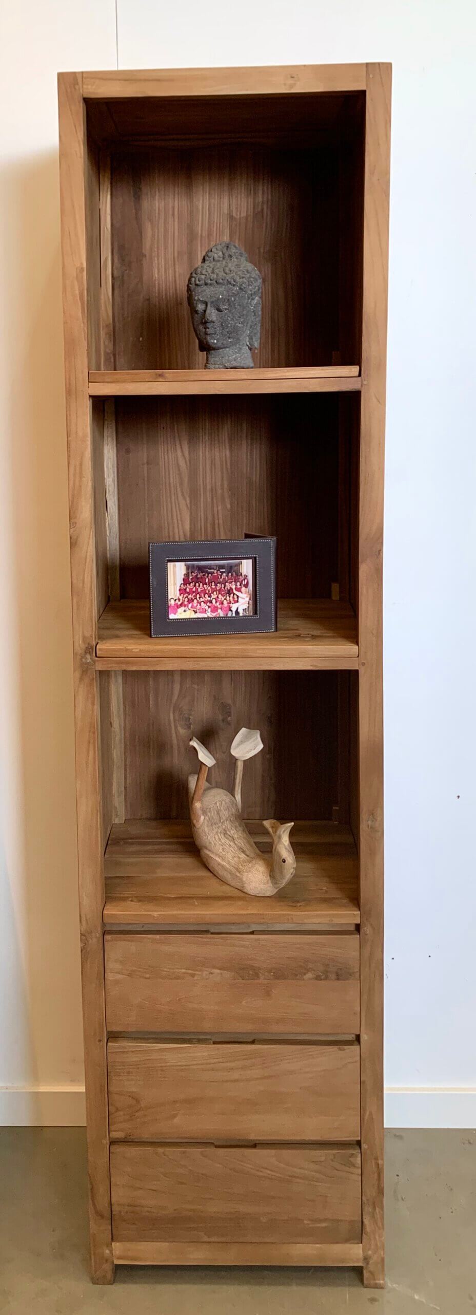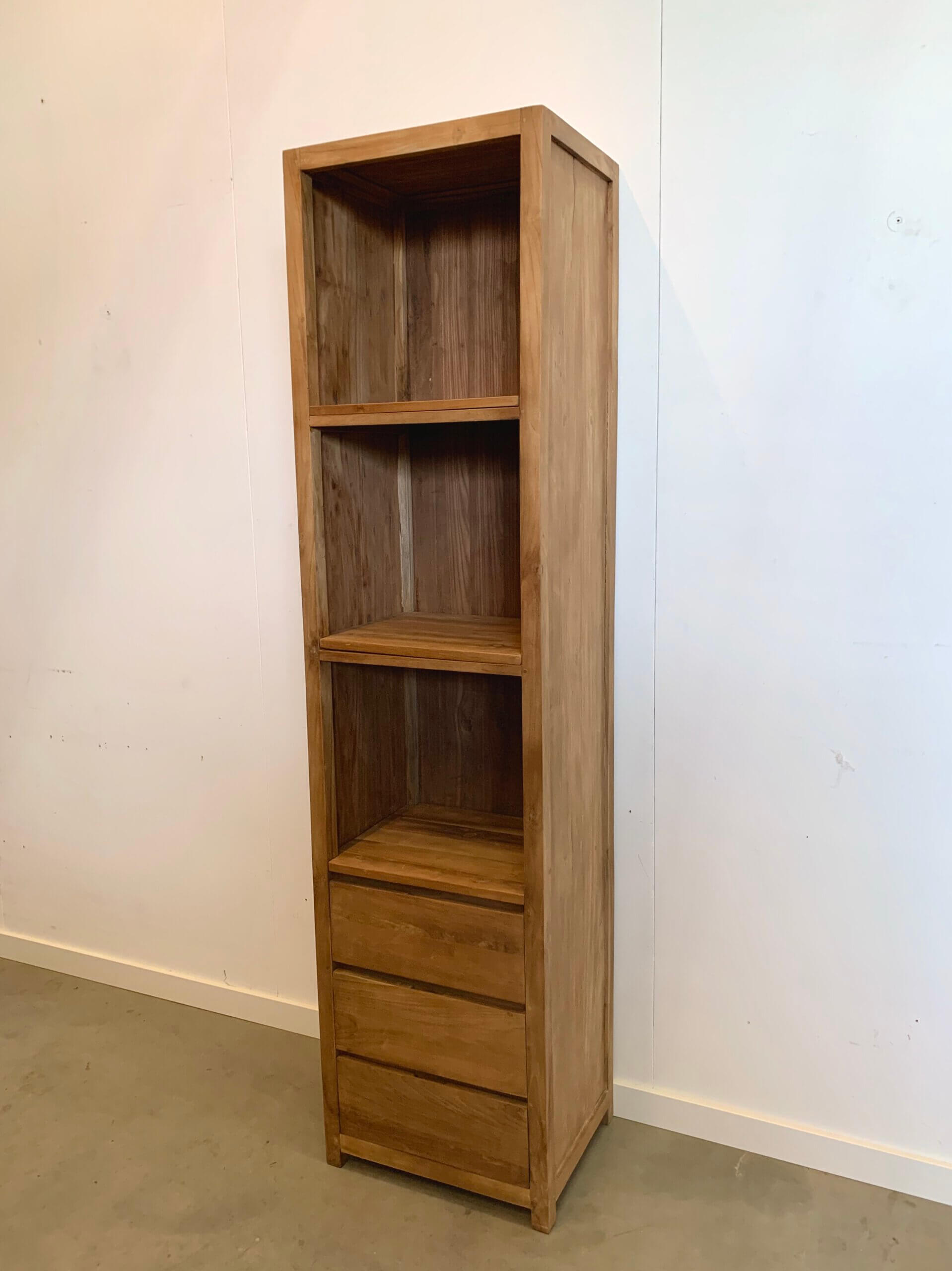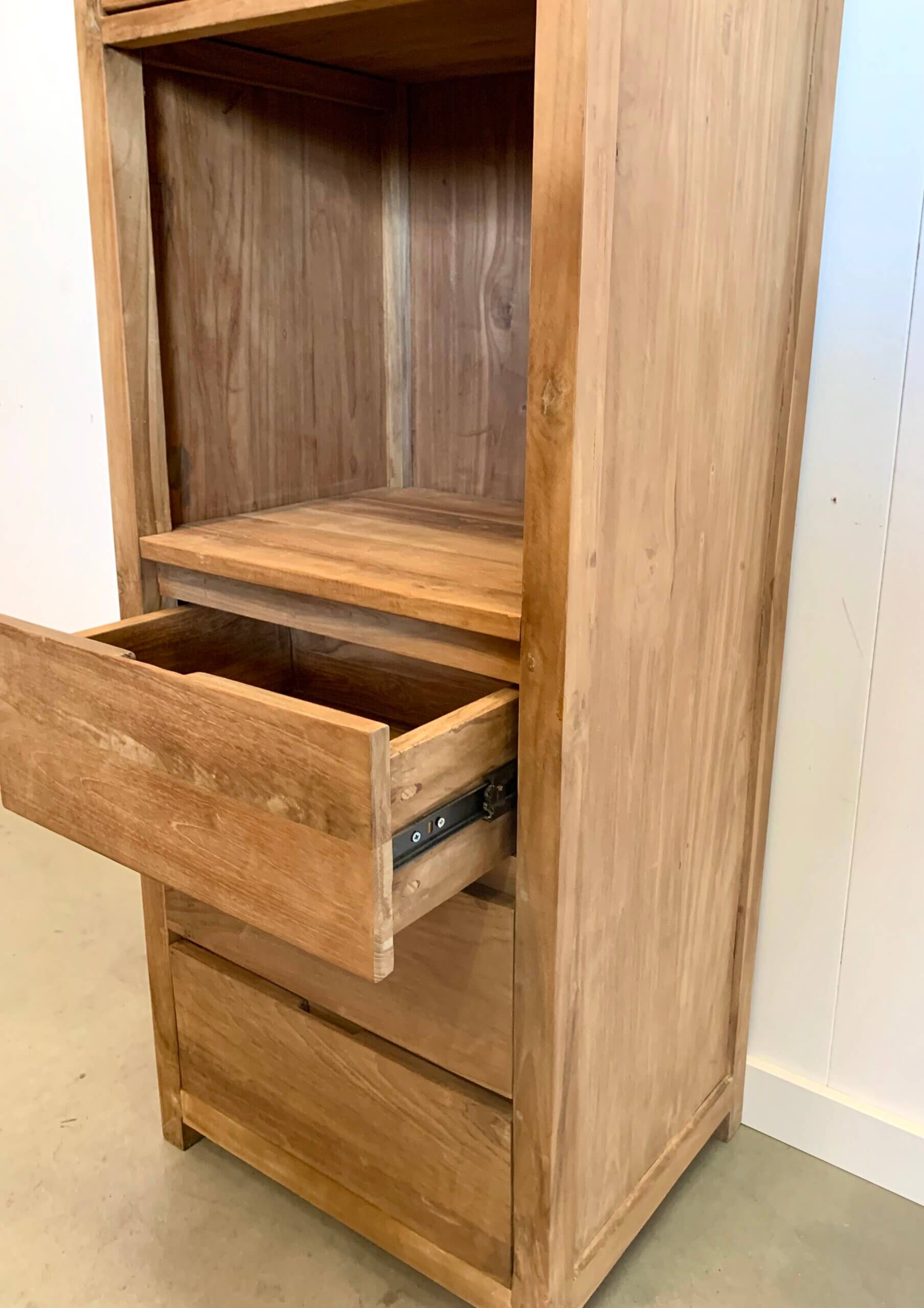 Moderne boekenkast van gerecycled teakhout. De laden zijn gemakkelijk in gebruik door de metalen geleiders.