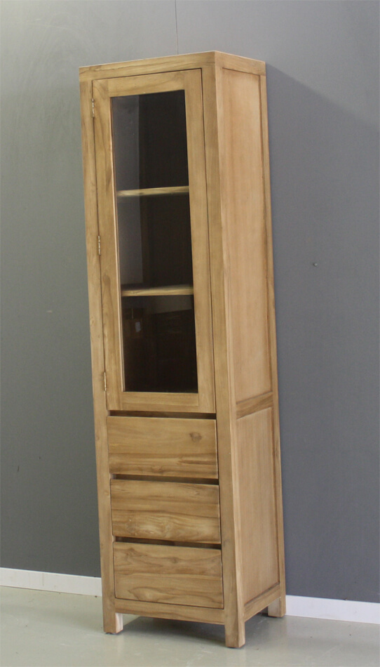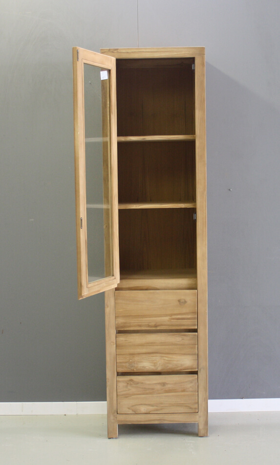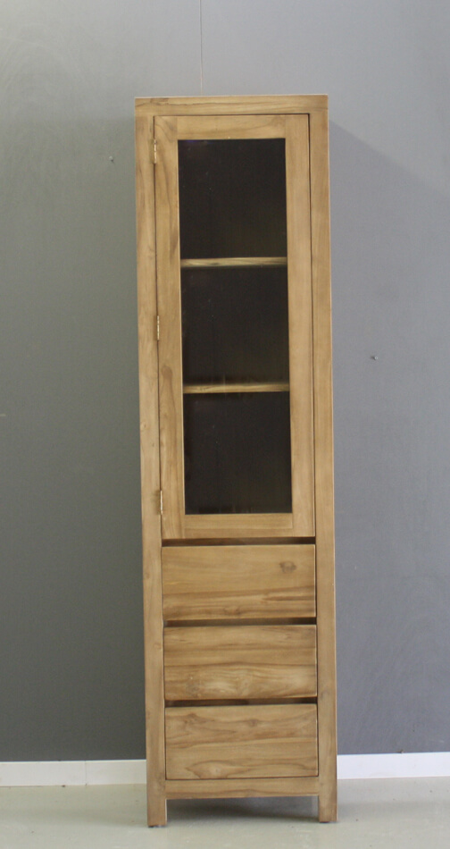 Strak afgewerkte smalle kast van teakhout. Een glasdeur en drie laden zonder grepen. De kast is gemaakt van plantage teakhout.