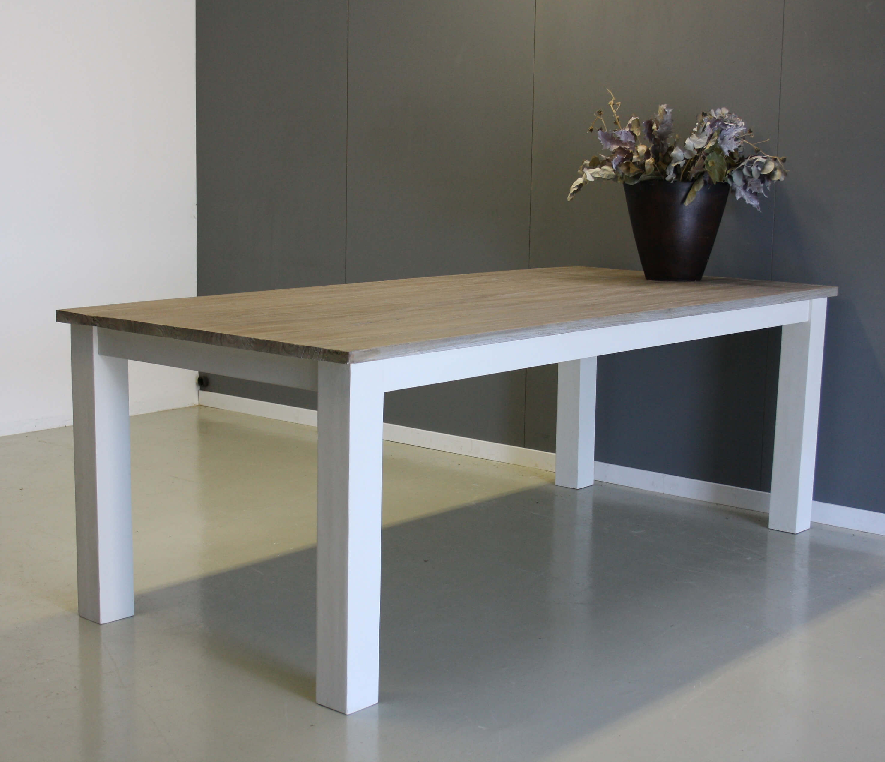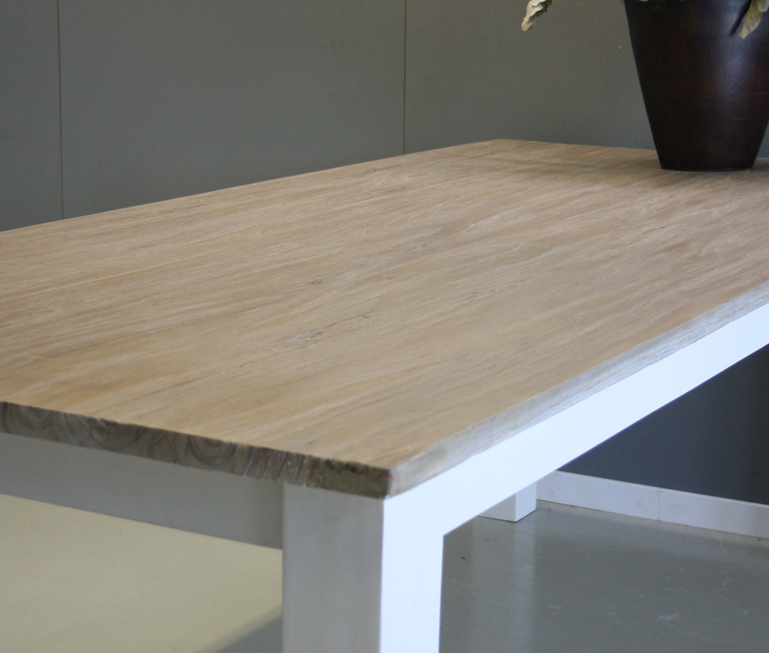 Tafel teak met wit met blokpoten. Het bovenblad is licht grijs gekleurd.