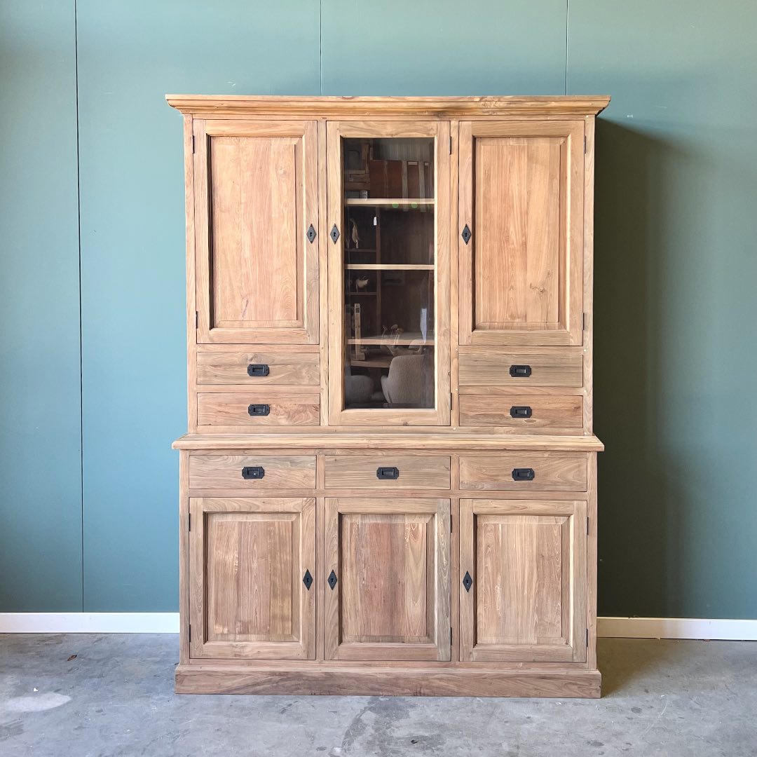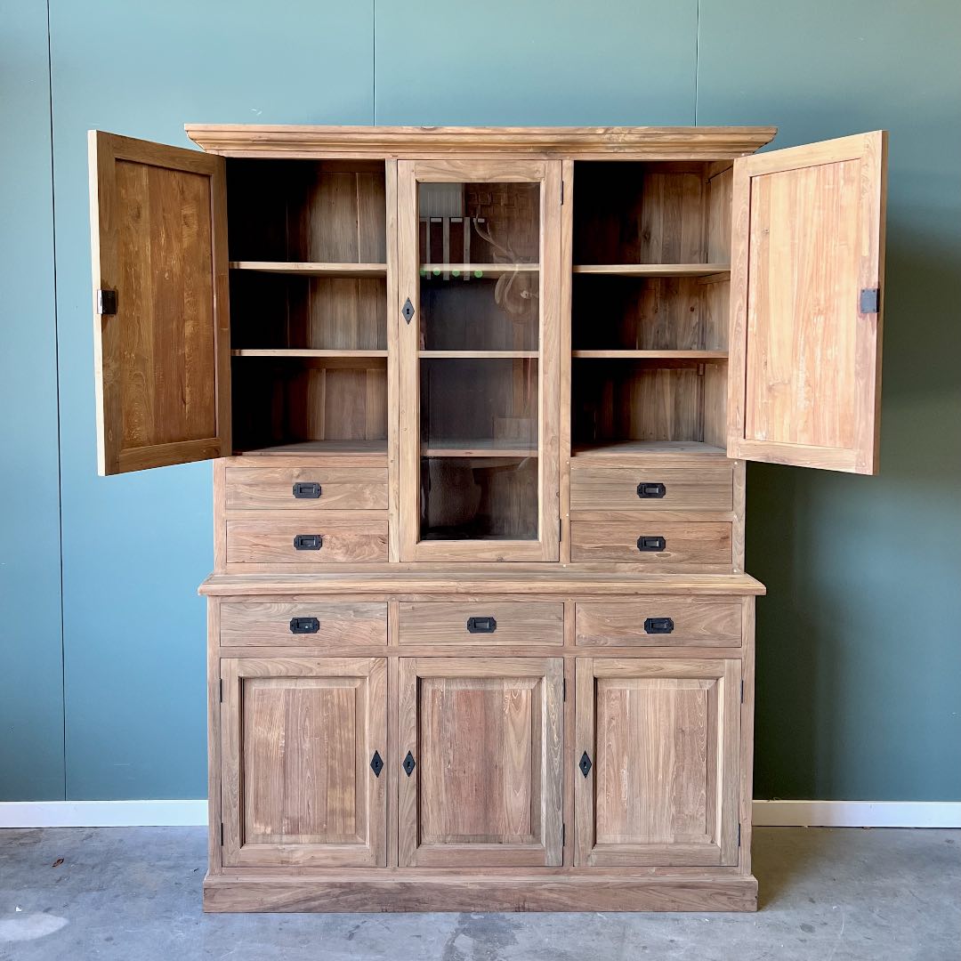 Deze teak buffetkast Barneveld zeven laden zes deuren past in elke inrichting! Doordat de kast vijf dichte deuren heeft, is die erg handig om veel spullen op te bergen die u niet zichtbaar in huis will hebben staan. Deze kast zou bijvoorbeeld prachtig staan in de keuken. Om eventueel te gebruiken als voorraadkast. Maar de kast zou ook in de woonkamer kunnen staan met het speelgoed van de kinderen erin. In het middelste gedeelte met de glazen deur kunt u eventueel uw mooie servies uitstallen.