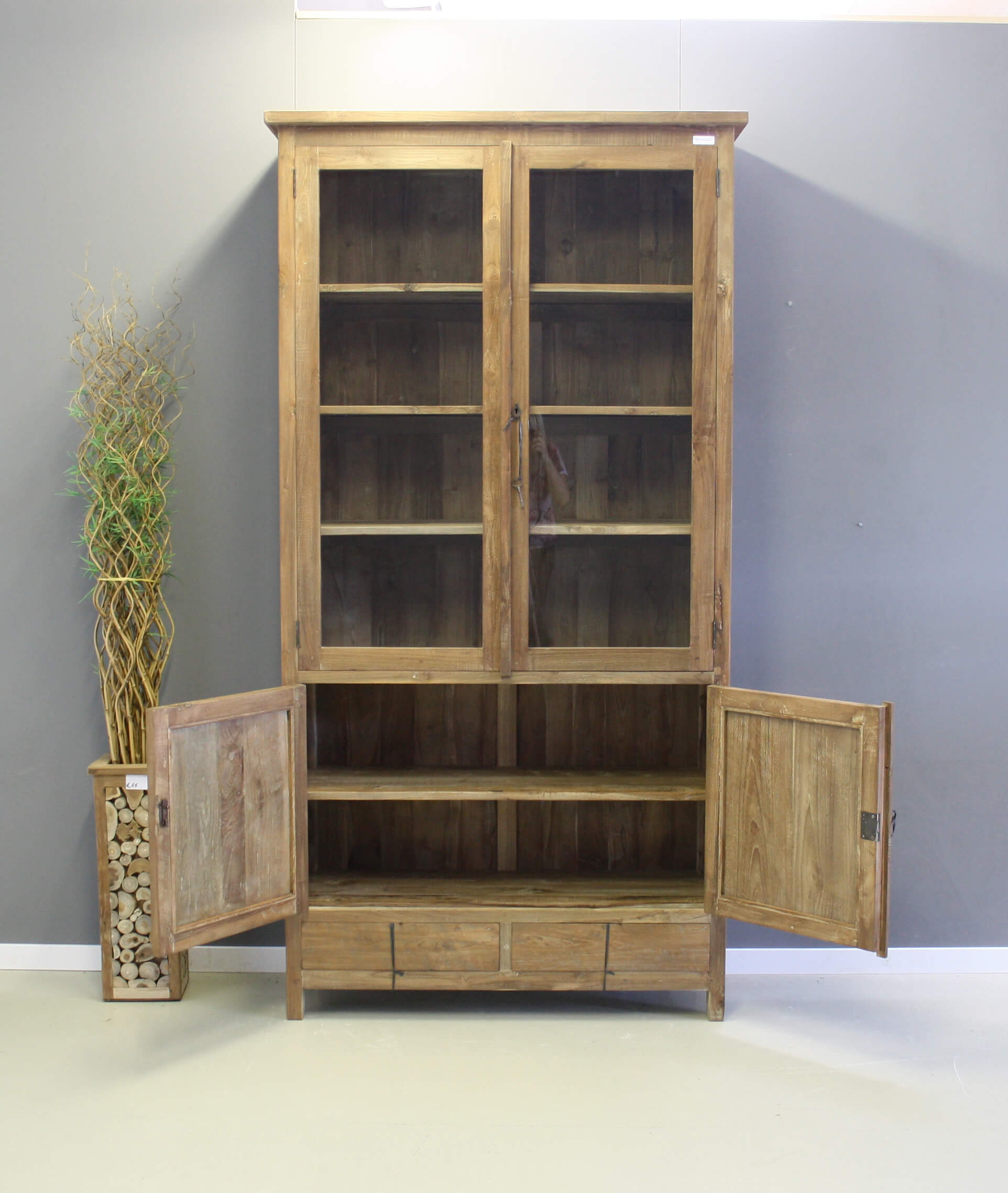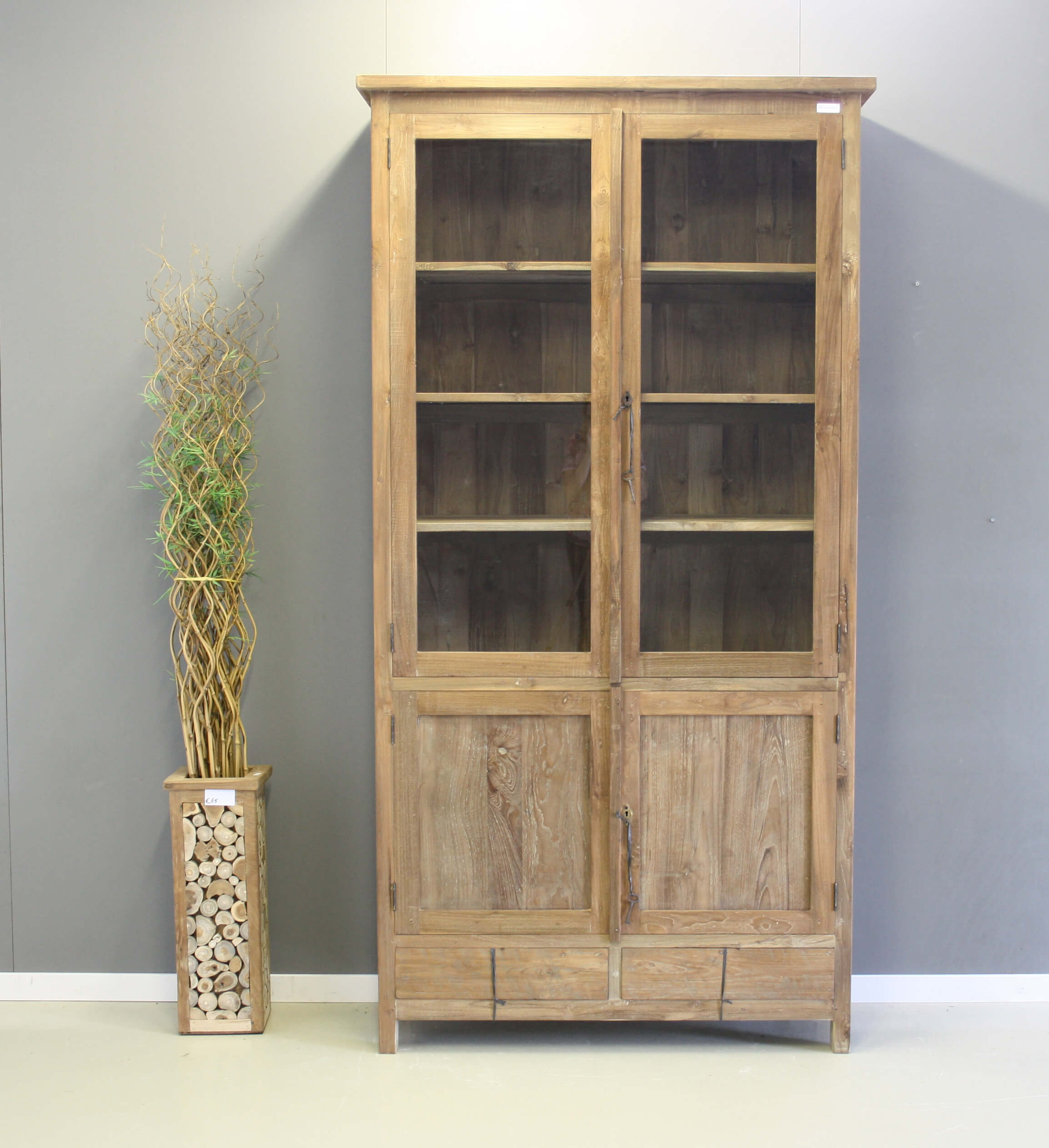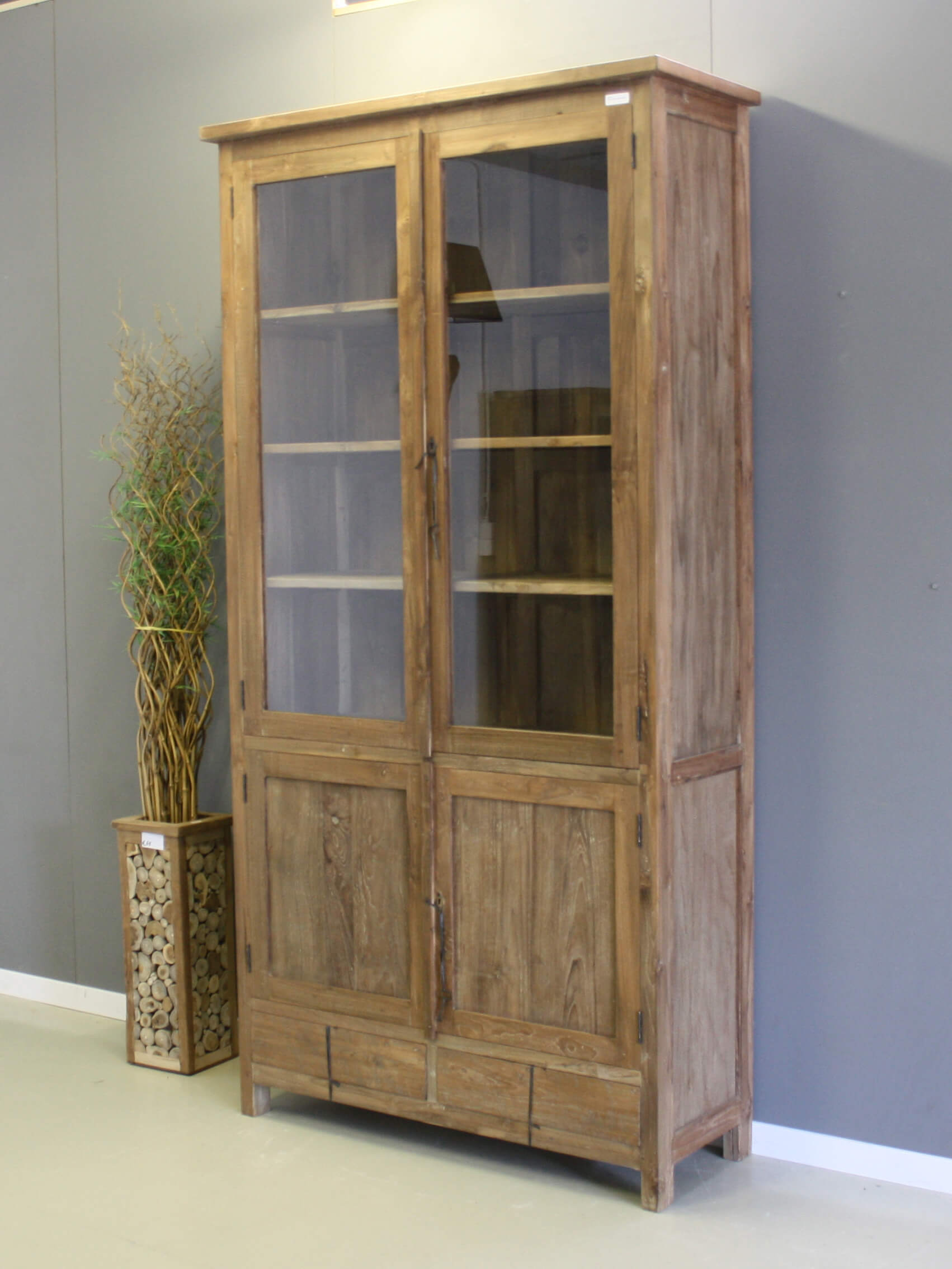Teak kast met een robuuste afwerking. De kast is behandeld met een waslaag, dit noemen ze dingklik. Vier deuren en twee laden.
