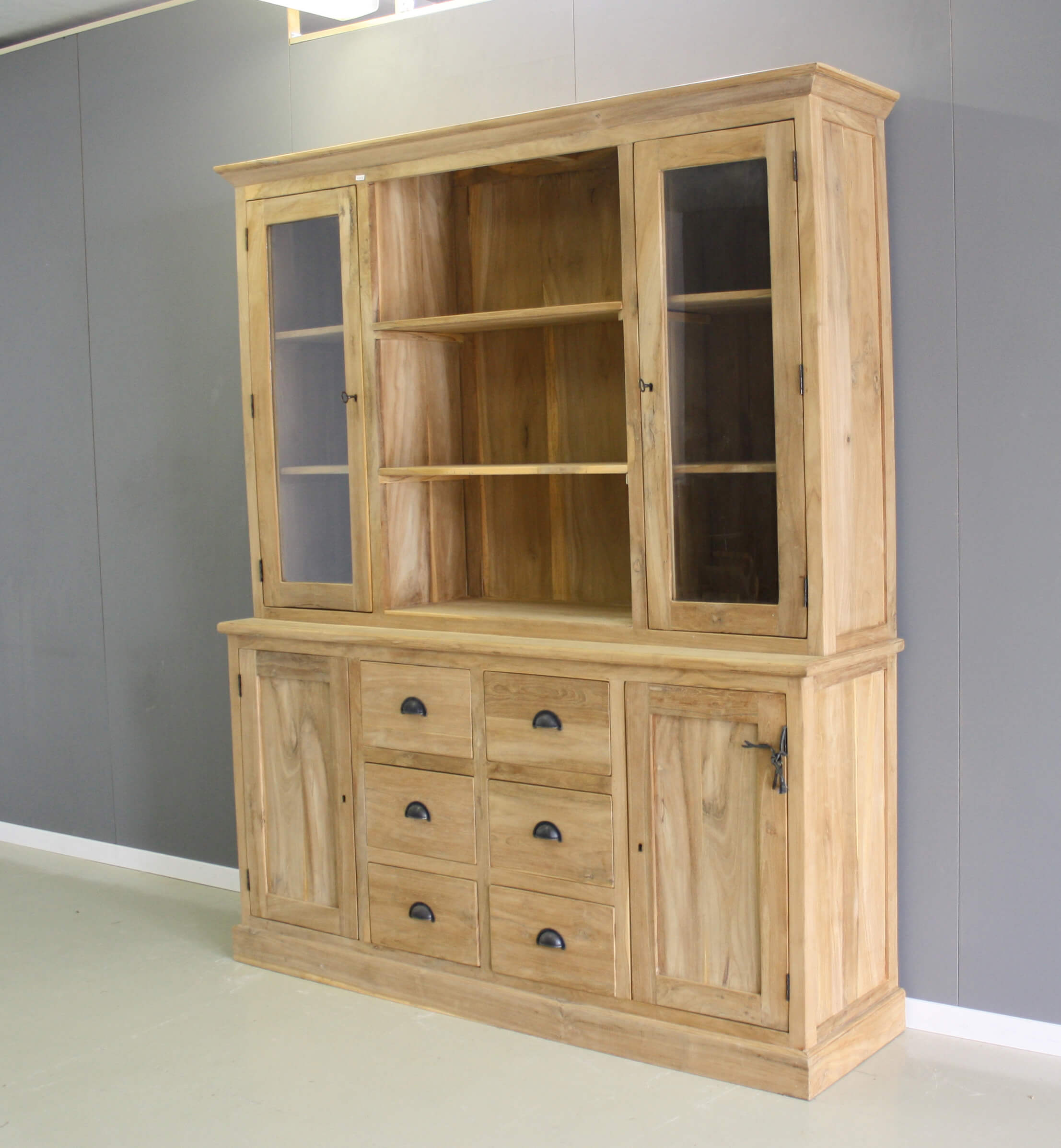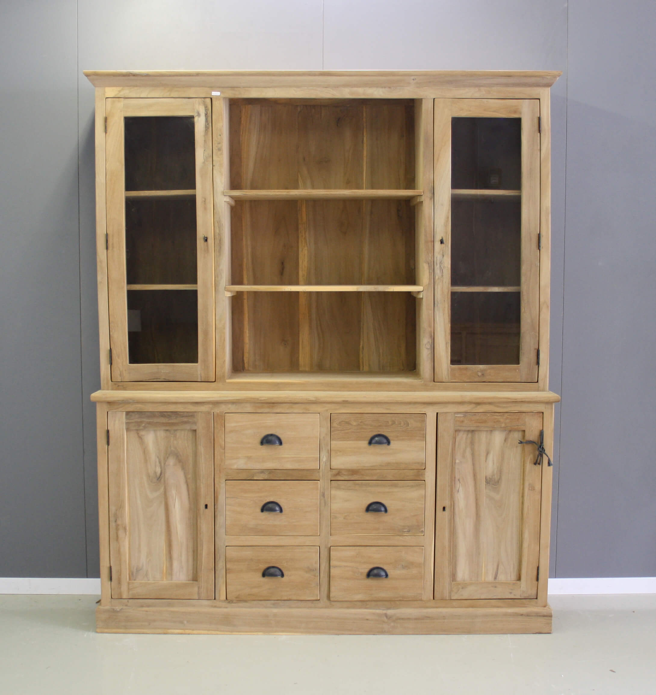 Fijne keukenkast van teakhout, model Almelo. De kast heeft in het bovenstuk glasdeuren en schappen, wat de kast heel praktisch maakt. In het onderstuk zitten twee deuren en zes laden.