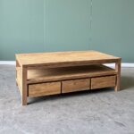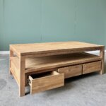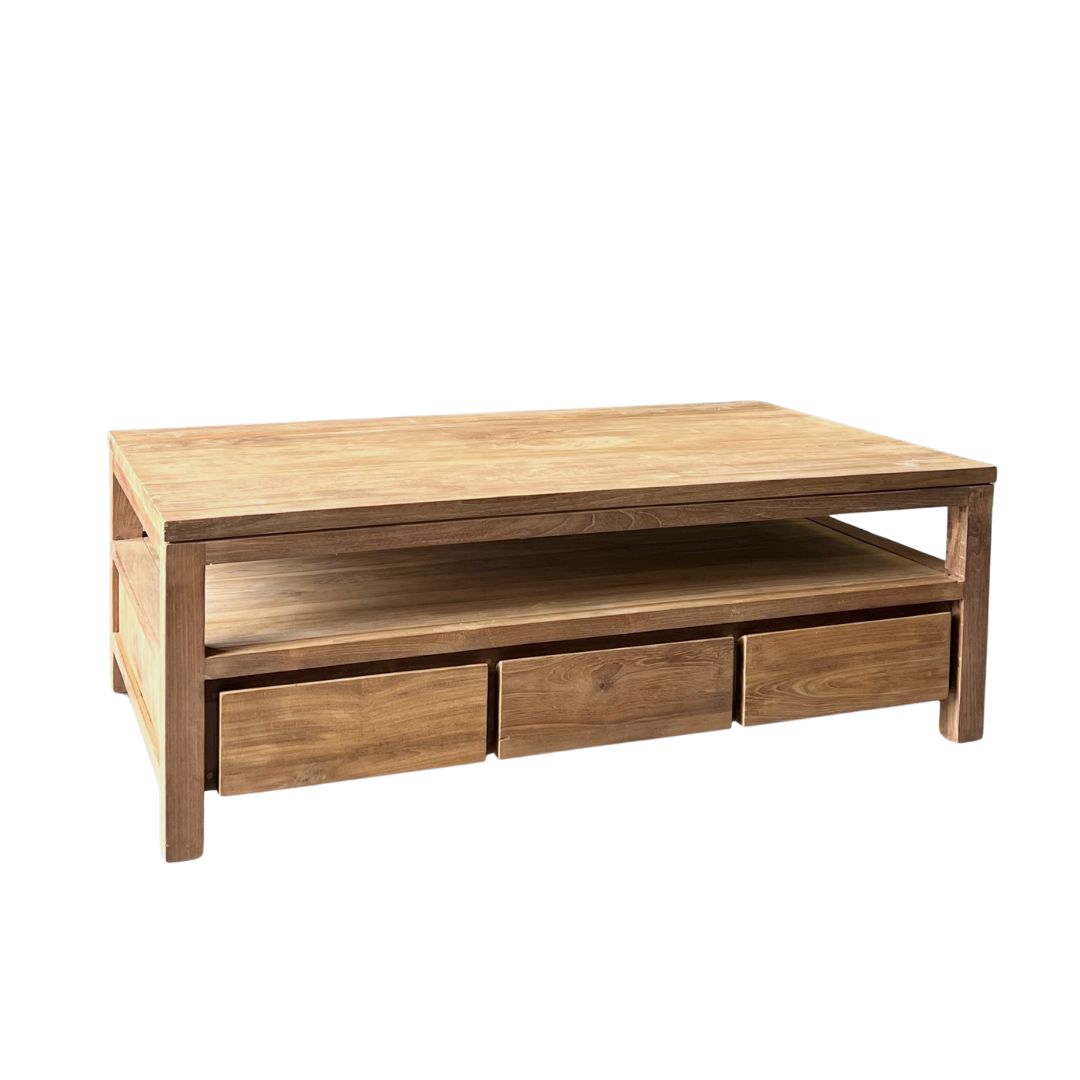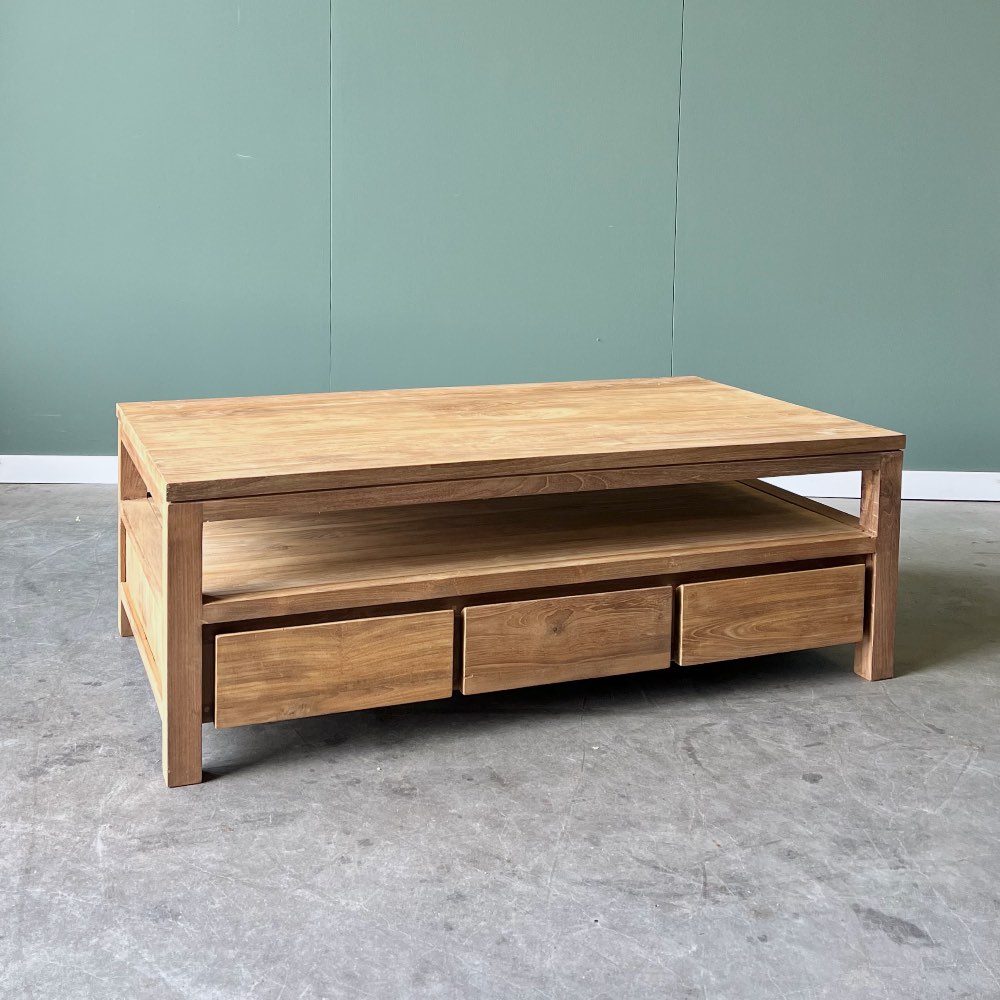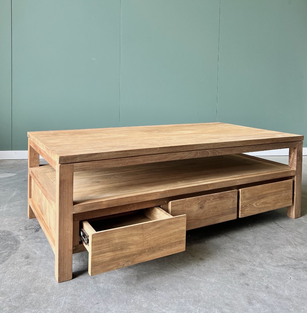 Deze moderne salontafel met greeploze laden is gemaakt van gerecycled teakhout en zijn 45cm hoog. De salontafel kunnen wij in verschillende maten leveren: