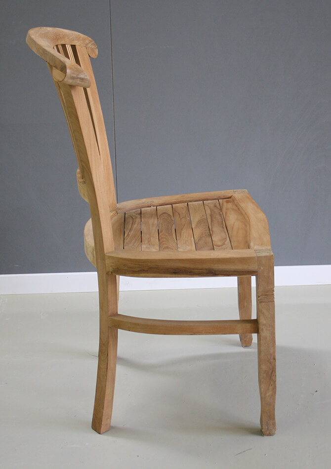 Fijne, stevige teak stoel. De stoel zit heerlijk, dit komt door de ronding in de rugleuning.