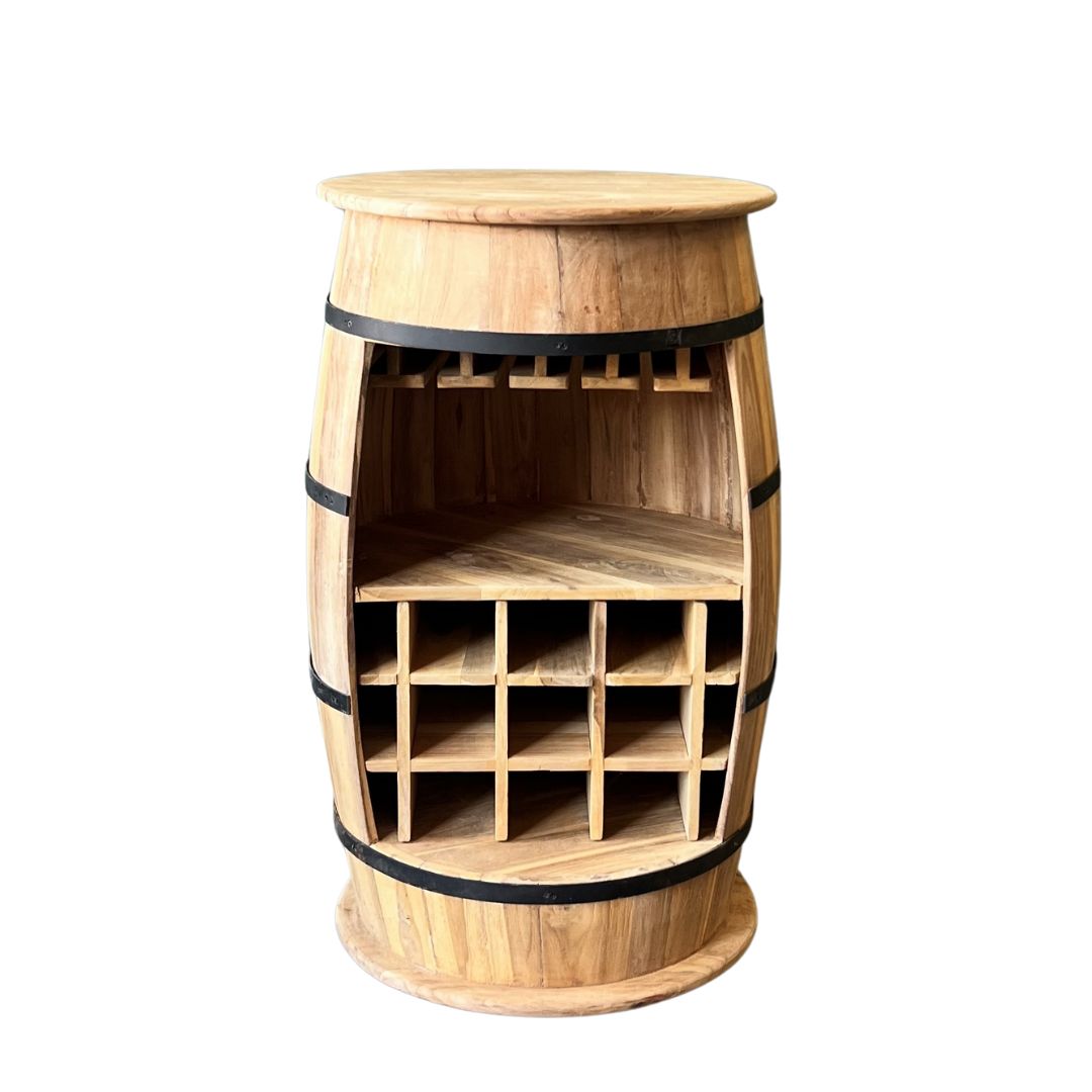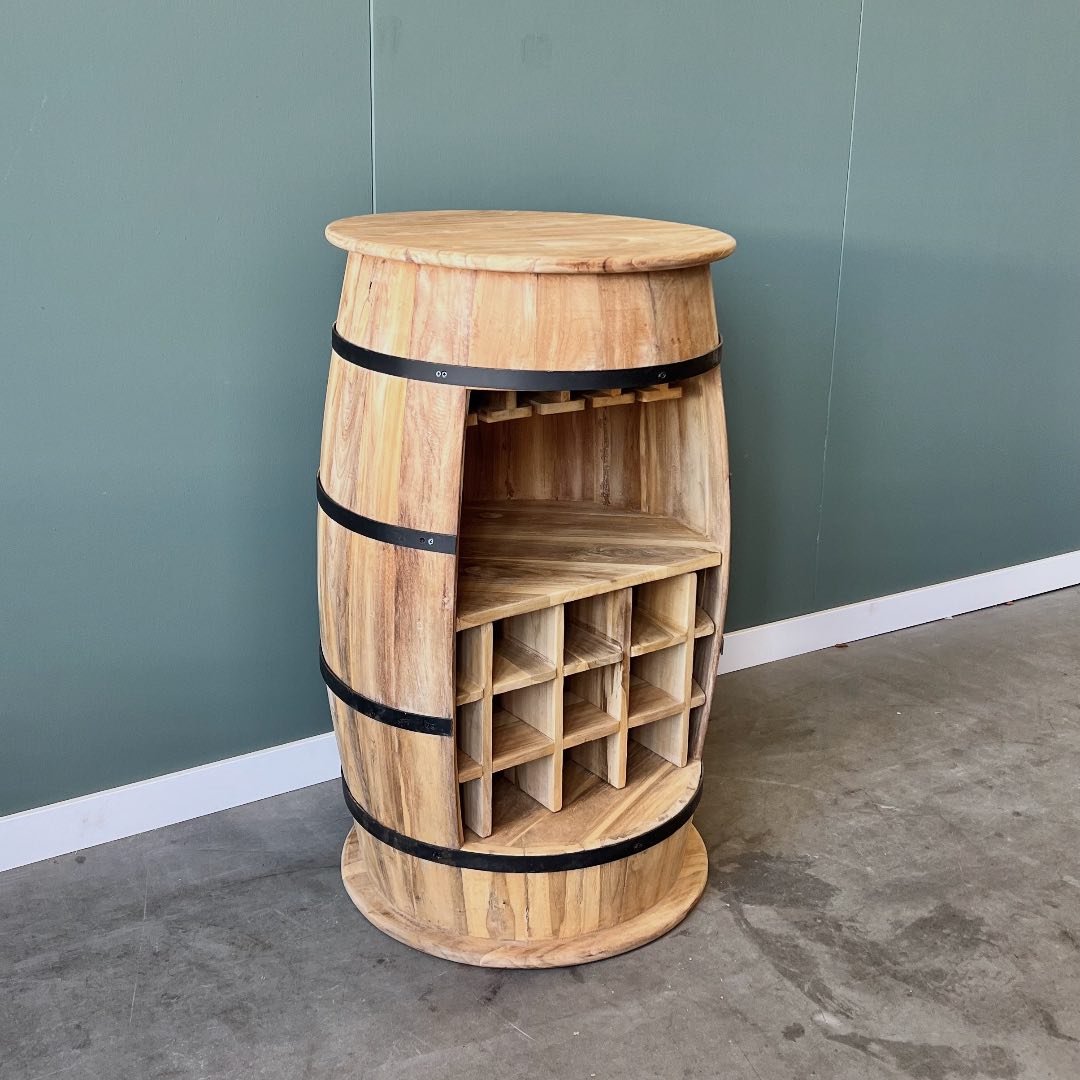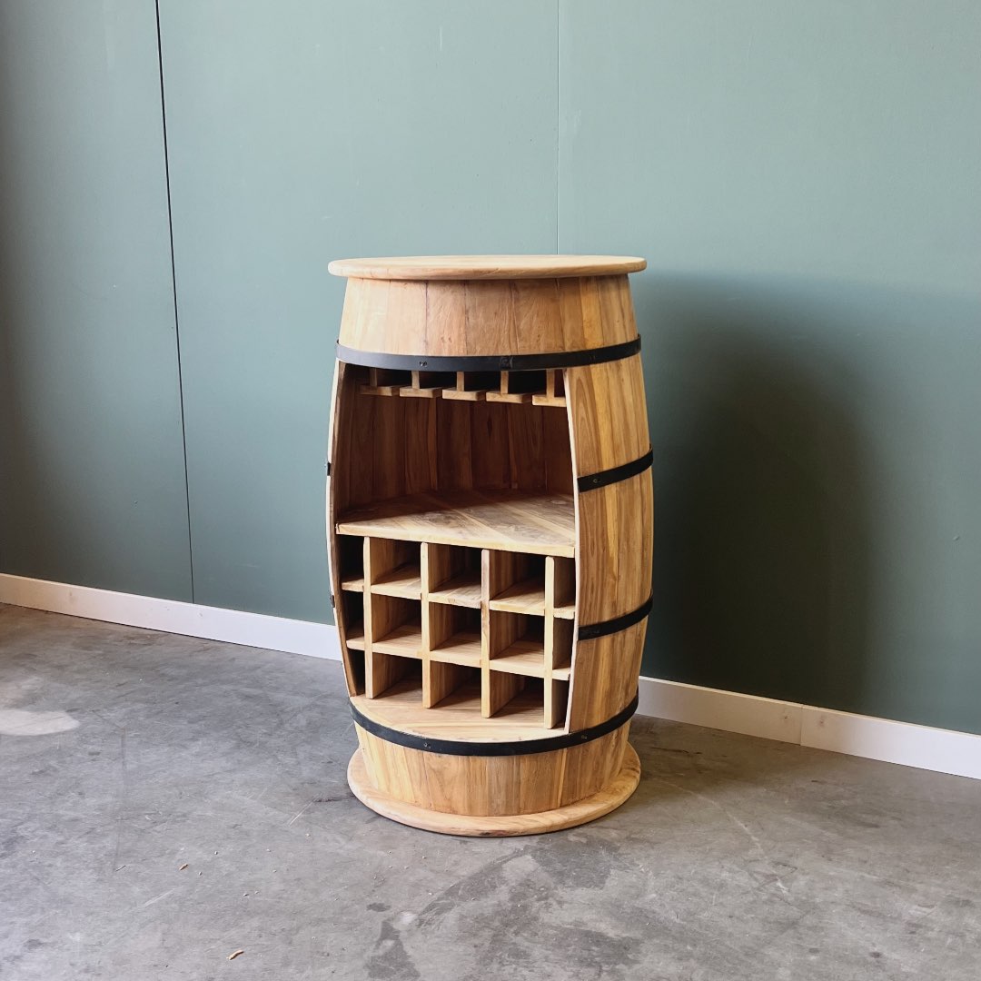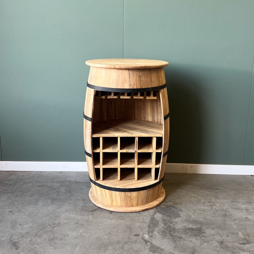 Uniek wijnrek een de vorm van een wijnvat, gemaakt van plantage teakhout. Het wijnrek heeft een glazenrek en biedt ruimte voor 9 flessen wijn.