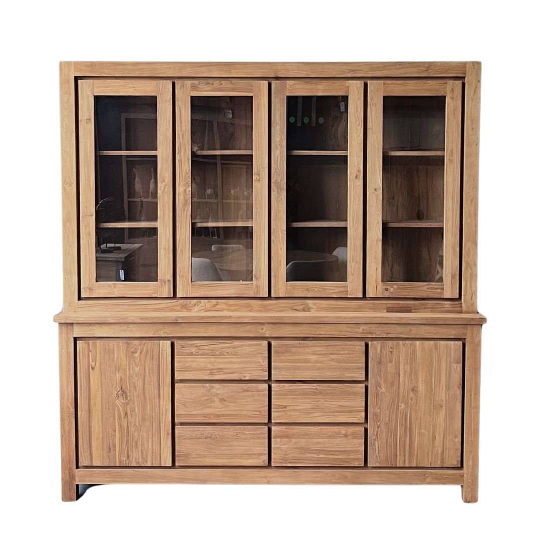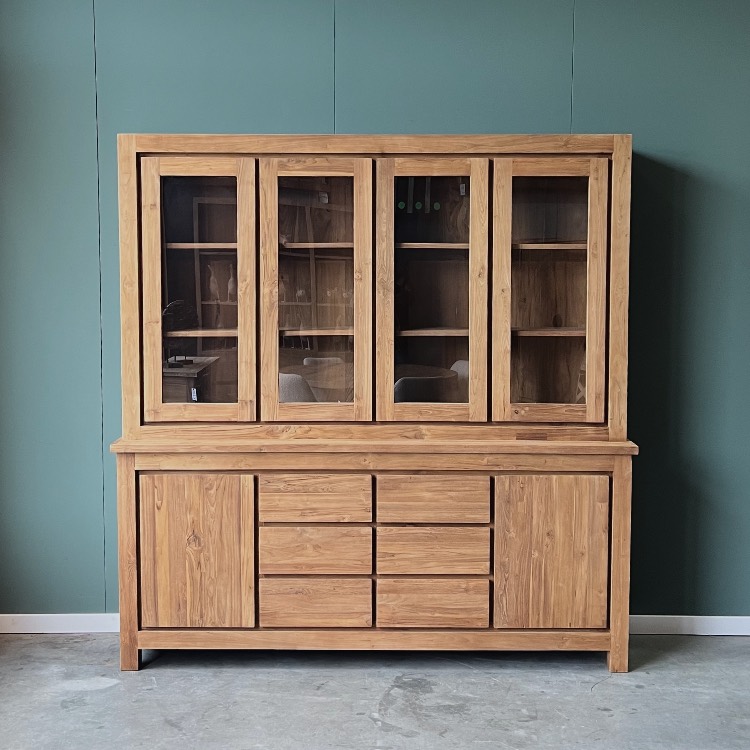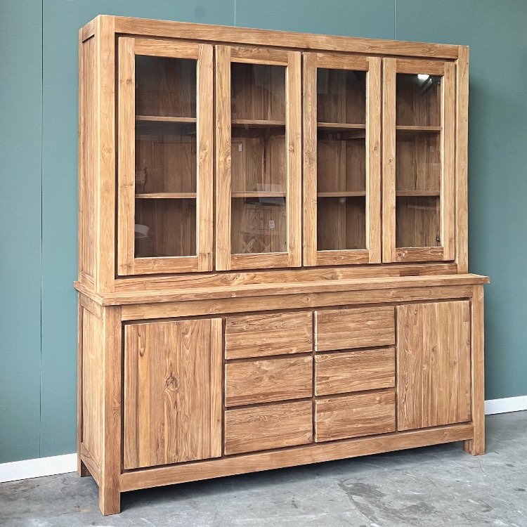 Deze moderne buffetkast is gemaakt van gerecycled teakhout, wat niet alleen zorgt voor een tijdloze uitstraling, maar ook voor een duurzame keuze. De kast heeft ruime opbergvakken en is voorzien van deuren met een soft close systeem, wat zorgt voor een rustige en elegante sluiting. Daarnaast lopen de laden erg soepel op metalen geleiders. Perfect voor het combineren van functionaliteit en stijl in jouw interieur.