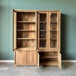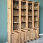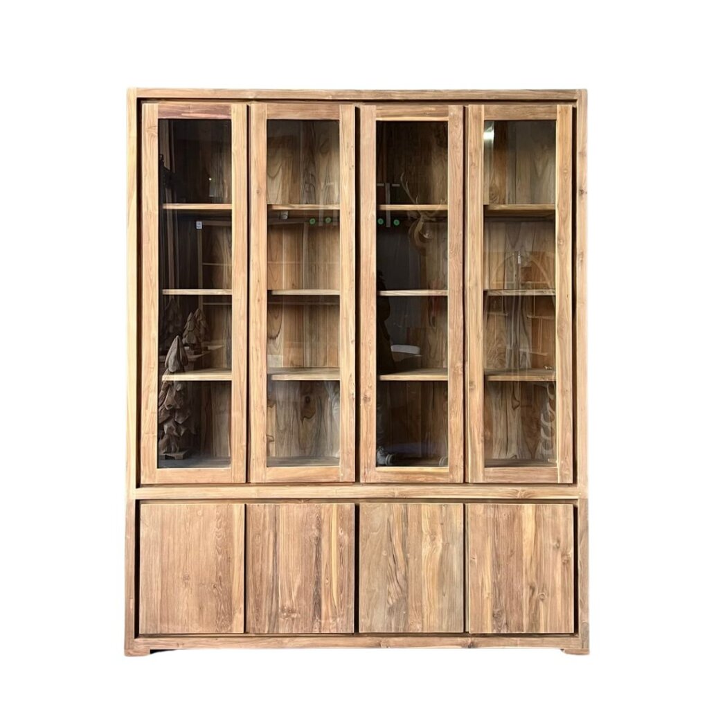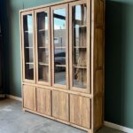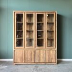 Met twee glazen deuren bovenin en twee dichte deuren met een praktische plank achterin, biedt de kast voldoende opbergruimte voor jouw servies, boeken of decoratie. Het strakke ontwerp past perfect in een modern interieur en benadrukt het natuurlijke karakter van het hout.