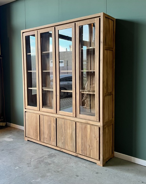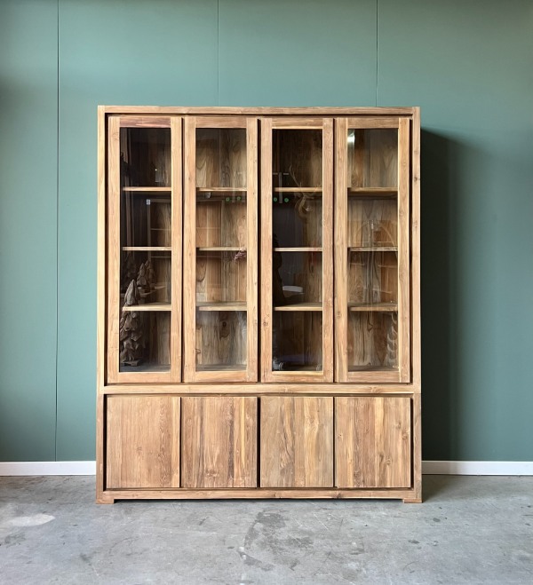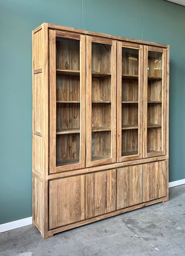 Zoekwoorden voor betere vindbaarheid: teakkast, gerecycled teakhout kast, moderne buffetkast, duurzame kast, FSC-teakhout, kast met glazen deuren, strakke kast, houten buffetkast, opbergkast modern design.