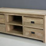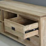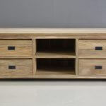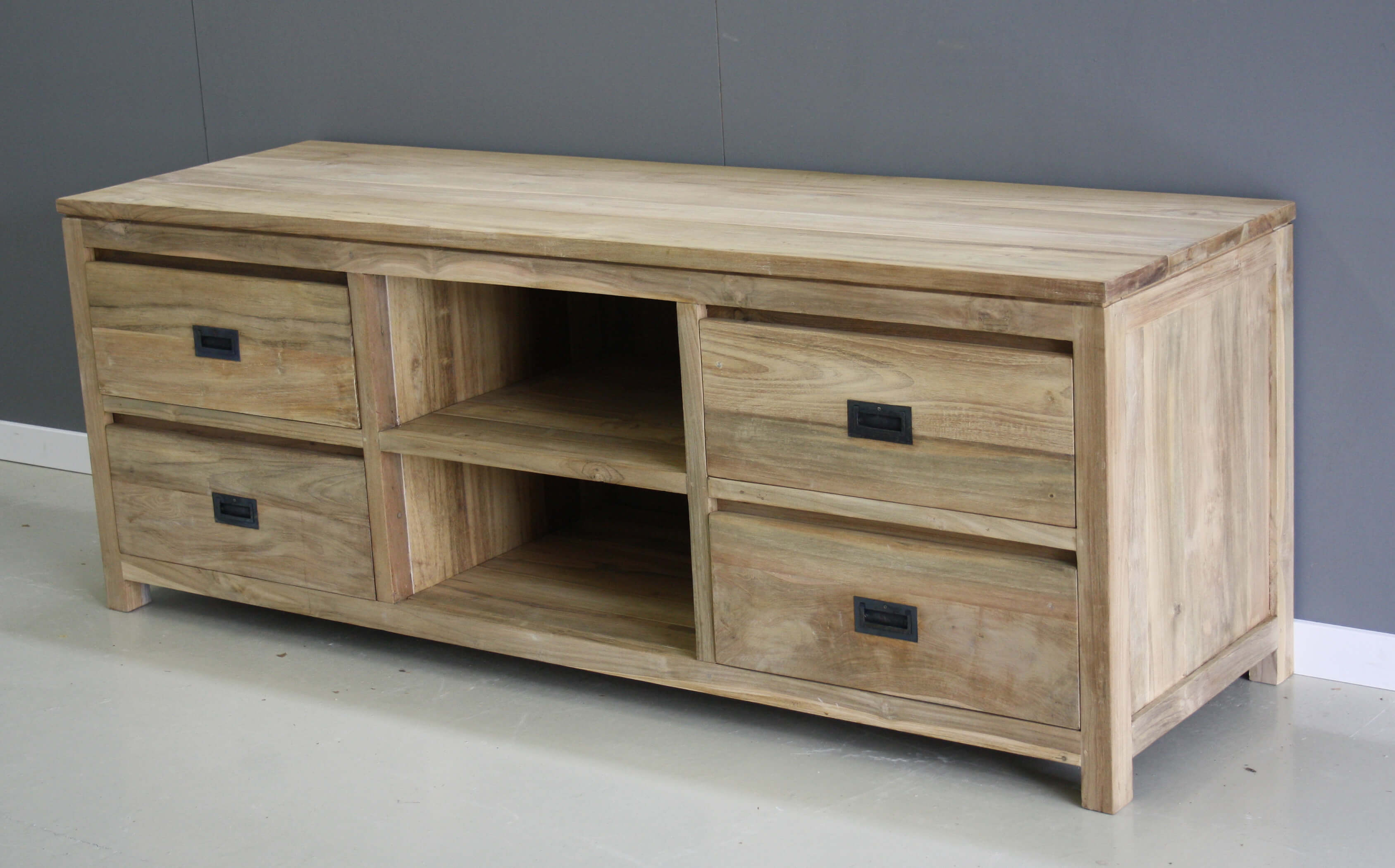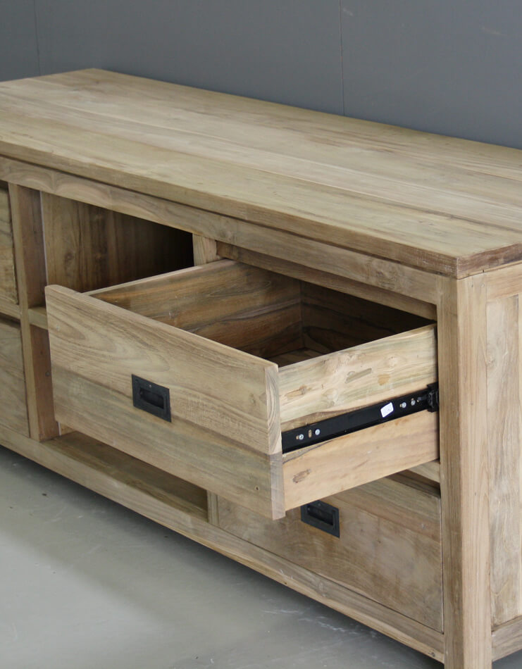 Teak tv meubel 160cm breed en 60cm hoog. Het meubel heeft twee open vakken van elk 20cm hoog en vier ruime laden.