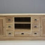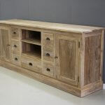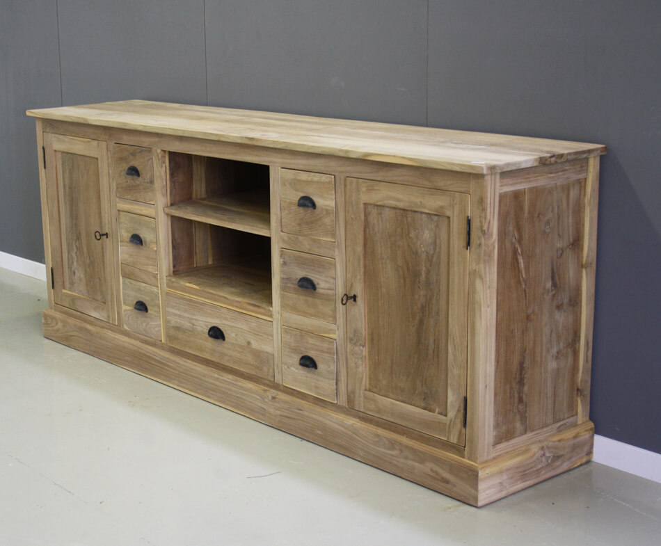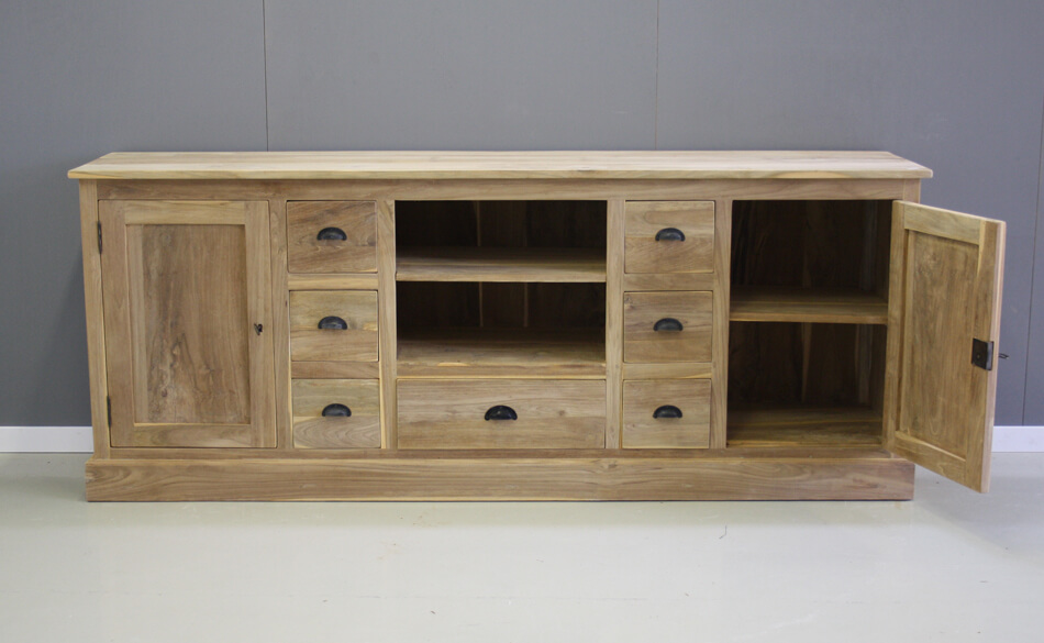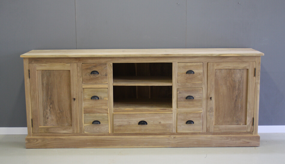 TV meubel met extra opbergruimte. Het meubel heeft zeven laden en achter de twee deuren kunt u ook nog veel spulletjes kwijt.