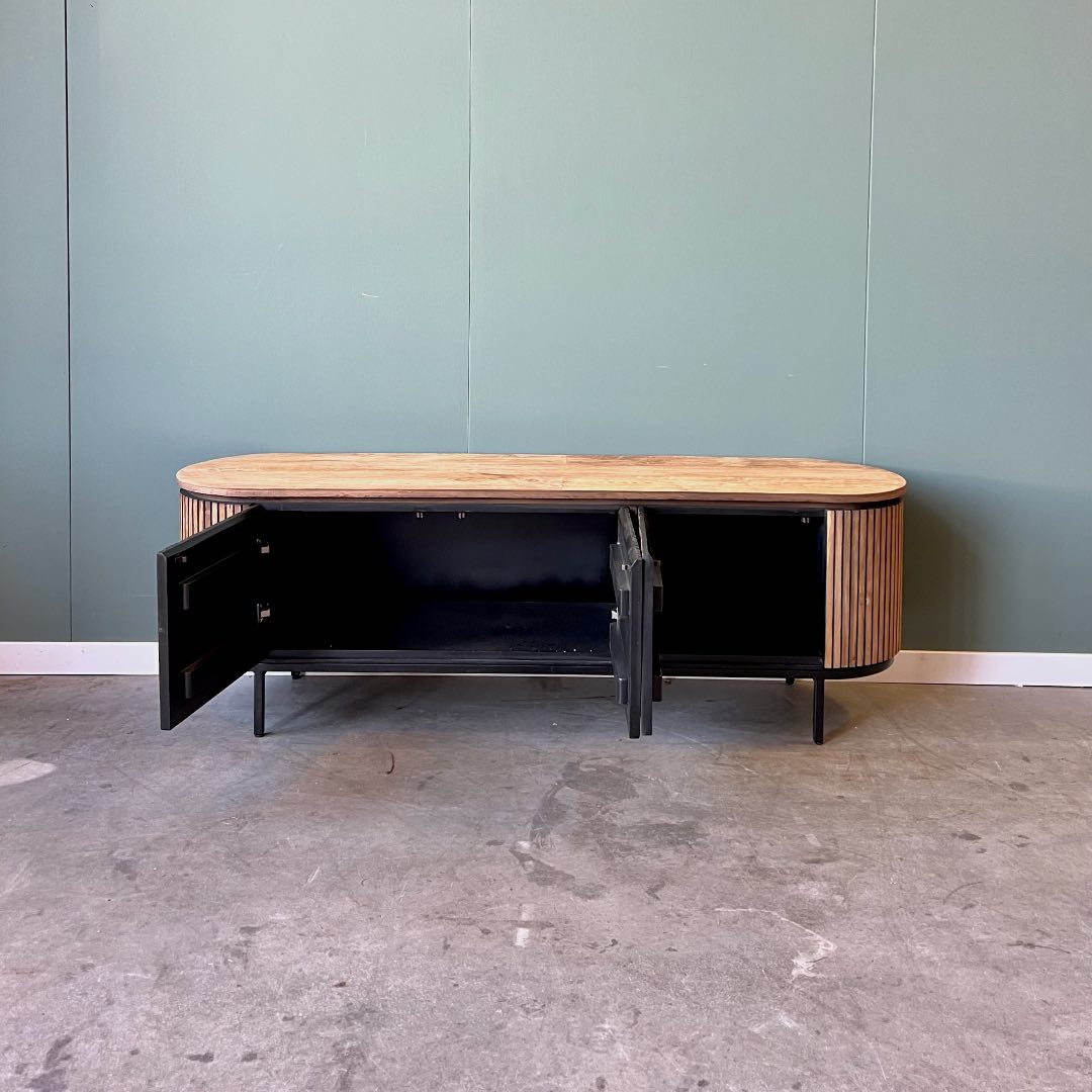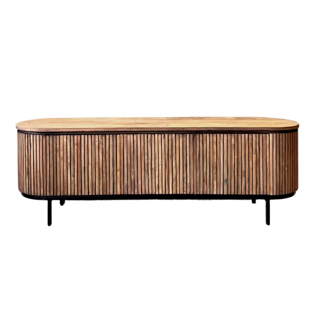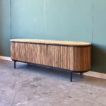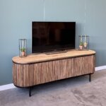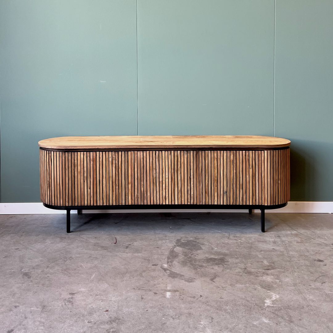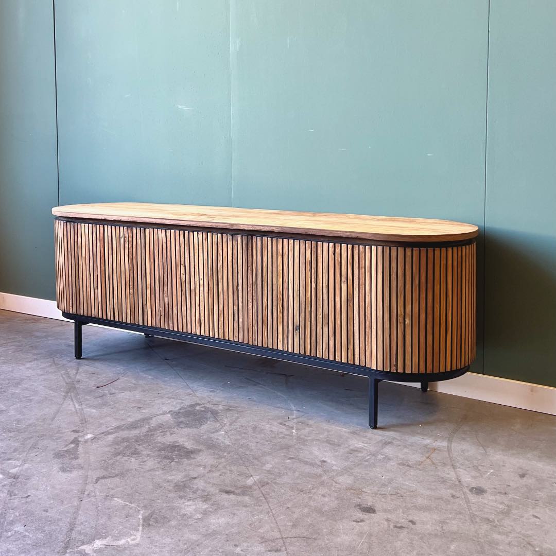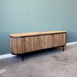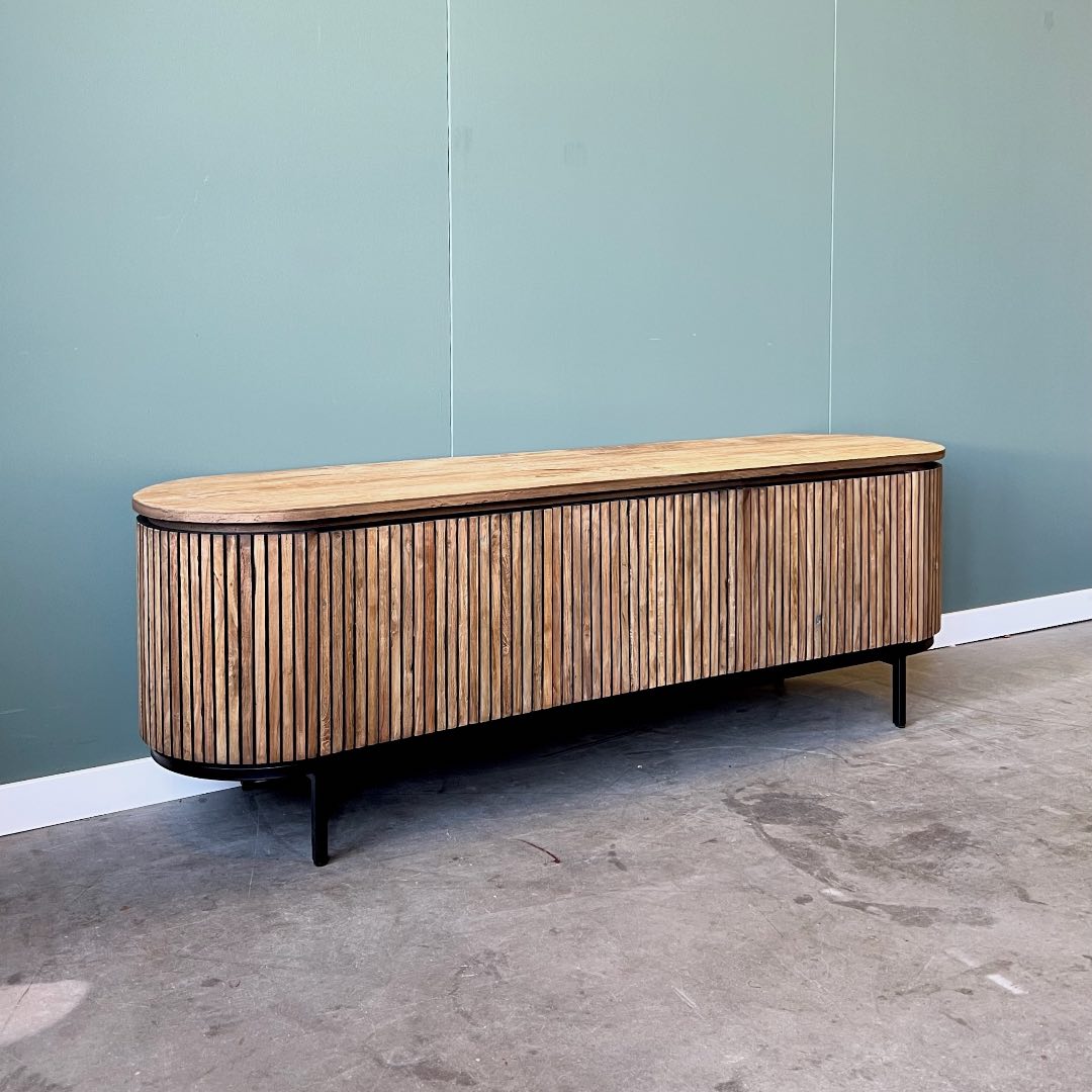 Het tv-meubel Curve combineert zachte rondingen met een strak lattenpatroon voor een stijlvol en eigentijds design. Gemaakt van hoogwaardig gerecycled teakhout straalt dit meubel warmte, karakter en vakmanschap uit. De afgeronde hoeken zorgen voor een verfijnde, organische look die perfect past in een modern, natuurlijk interieur.