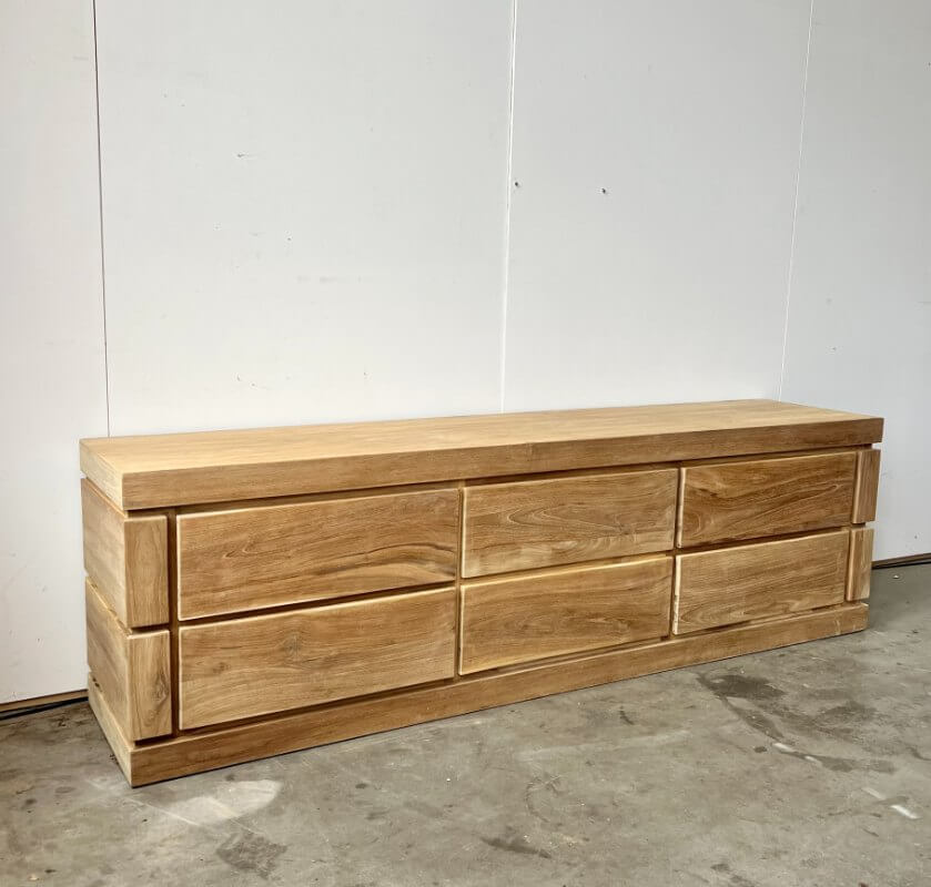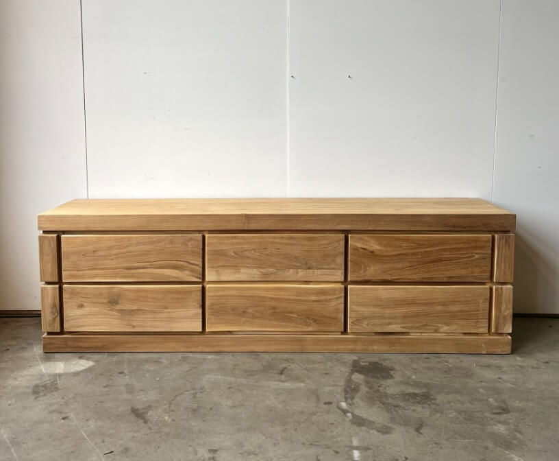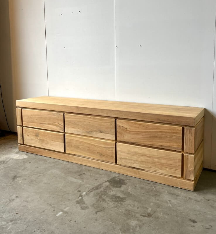 Ervaar de tijdloze charme van onze teakhouten tv-meubel, gemaakt van duurzaam plantagehout. Met zijn zes greeploze laden biedt dit meubel niet alleen een elegante oplossing voor je televisie, maar ook voldoende opbergruimte voor al je media-accessoires. Voeg een vleugje natuurlijke pracht en praktisch gemak toe aan je interieur met dit stijlvolle meubelstuk.