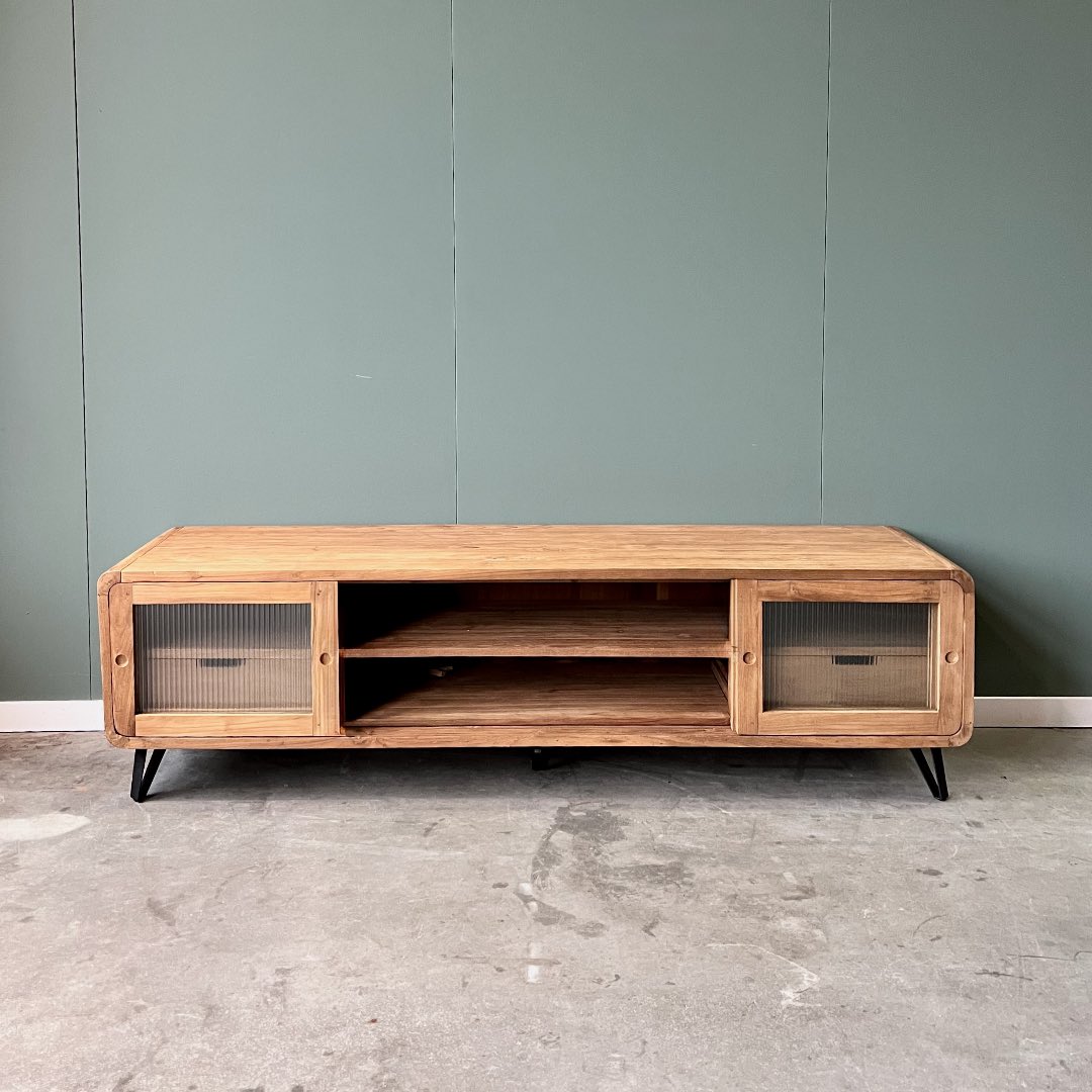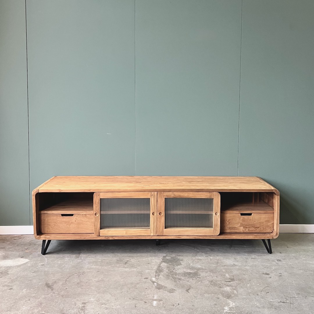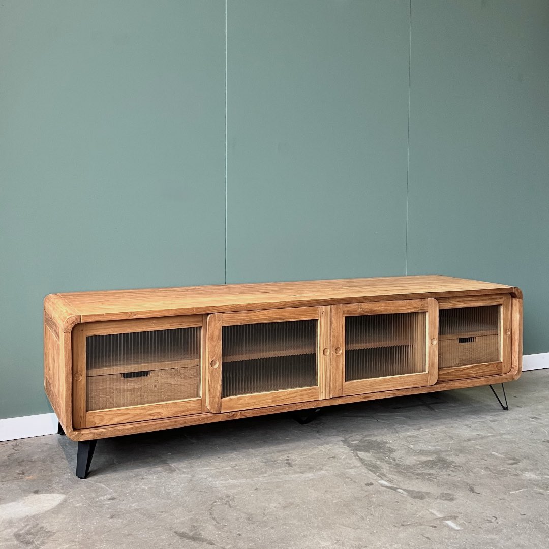 Dit tv-meubel is gemaakt van gerecycled teakhout. De combinatie van afgeronde hoeken en de schuine metalen poten zorgen voor een verfijnde uitstraling. De schuifdeuren met geribbeld glas voegen een speels accent toe. Het hout is licht geborsteld wat zorgt voor een mooie natuurlijke uitstraling.