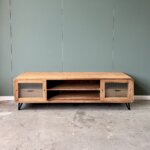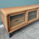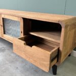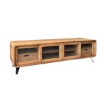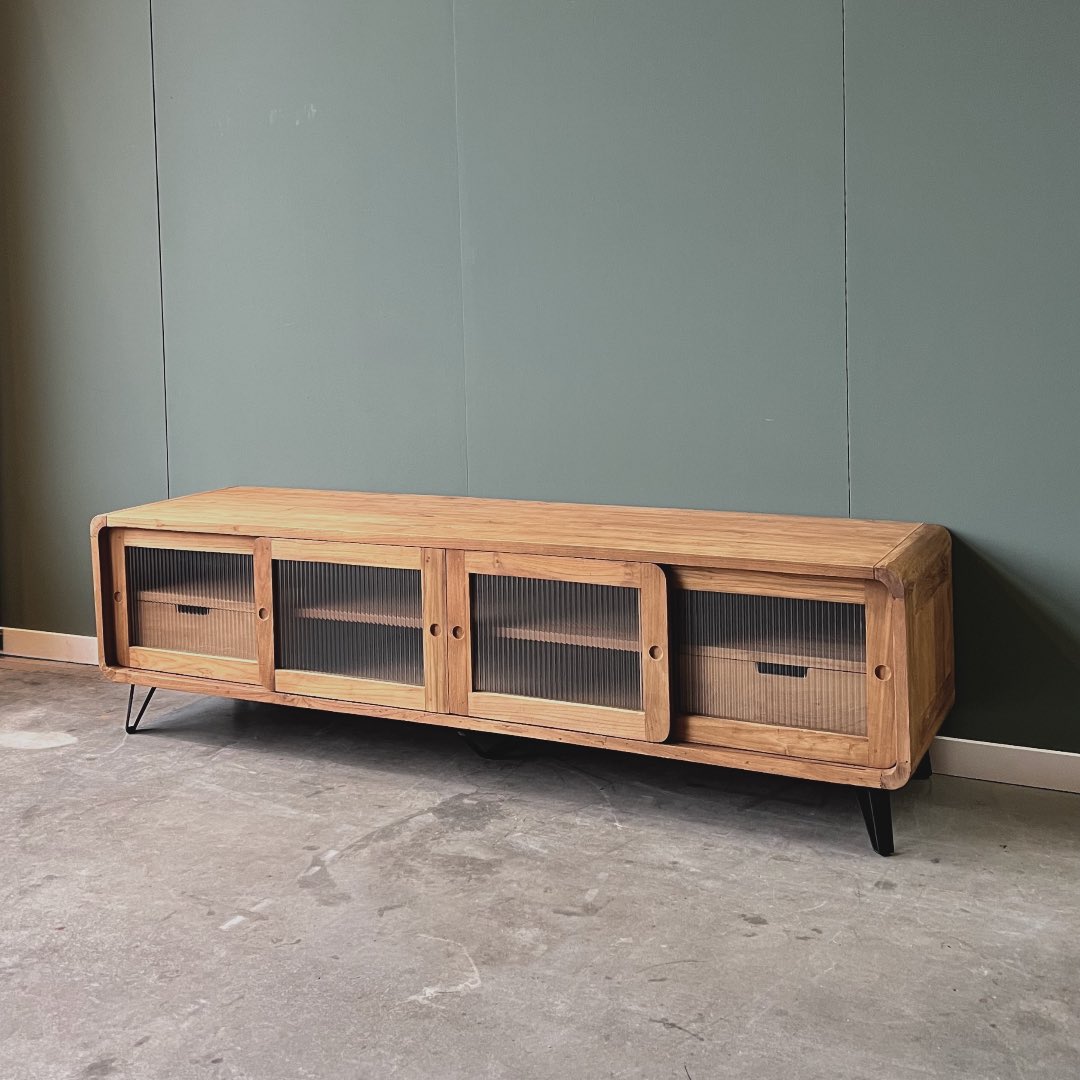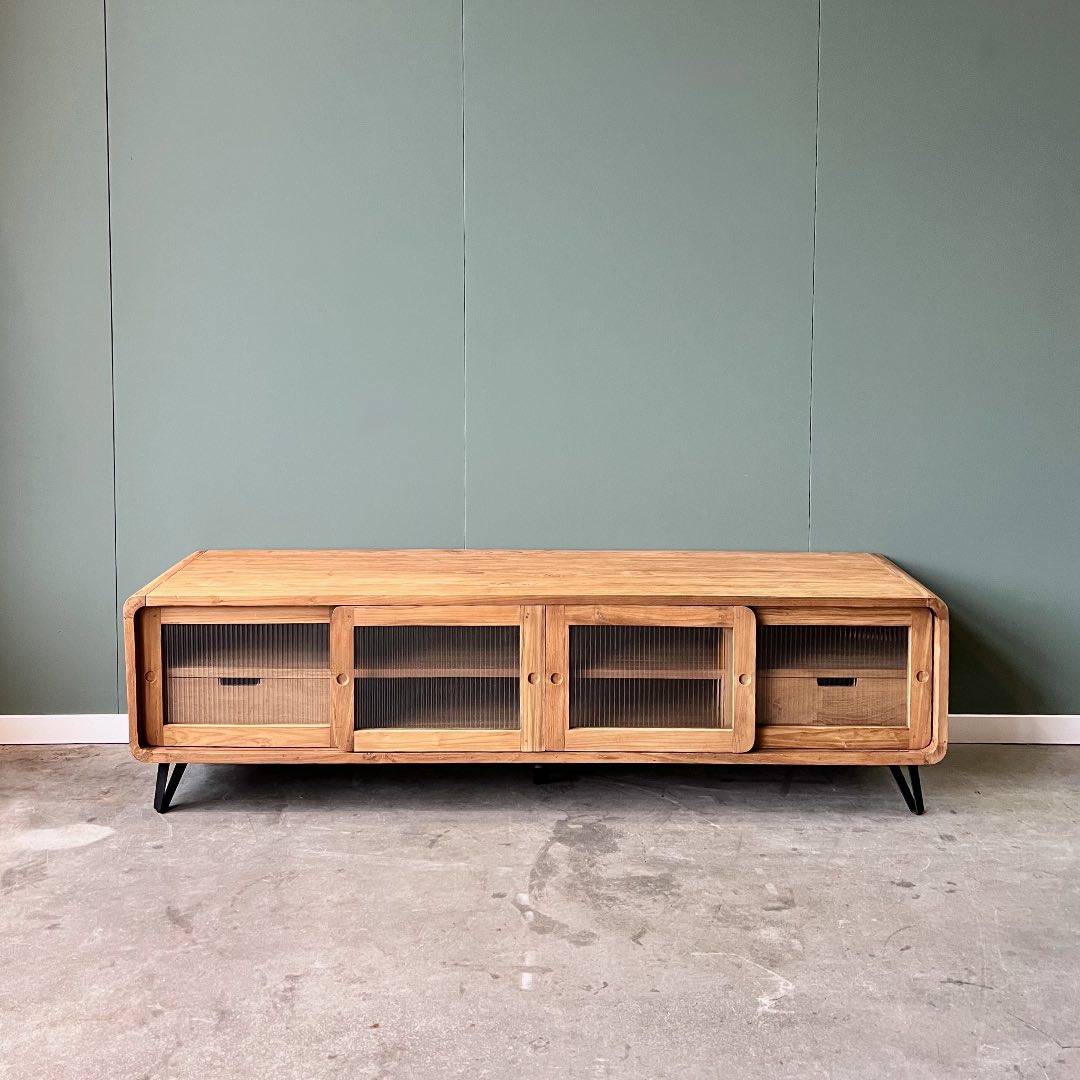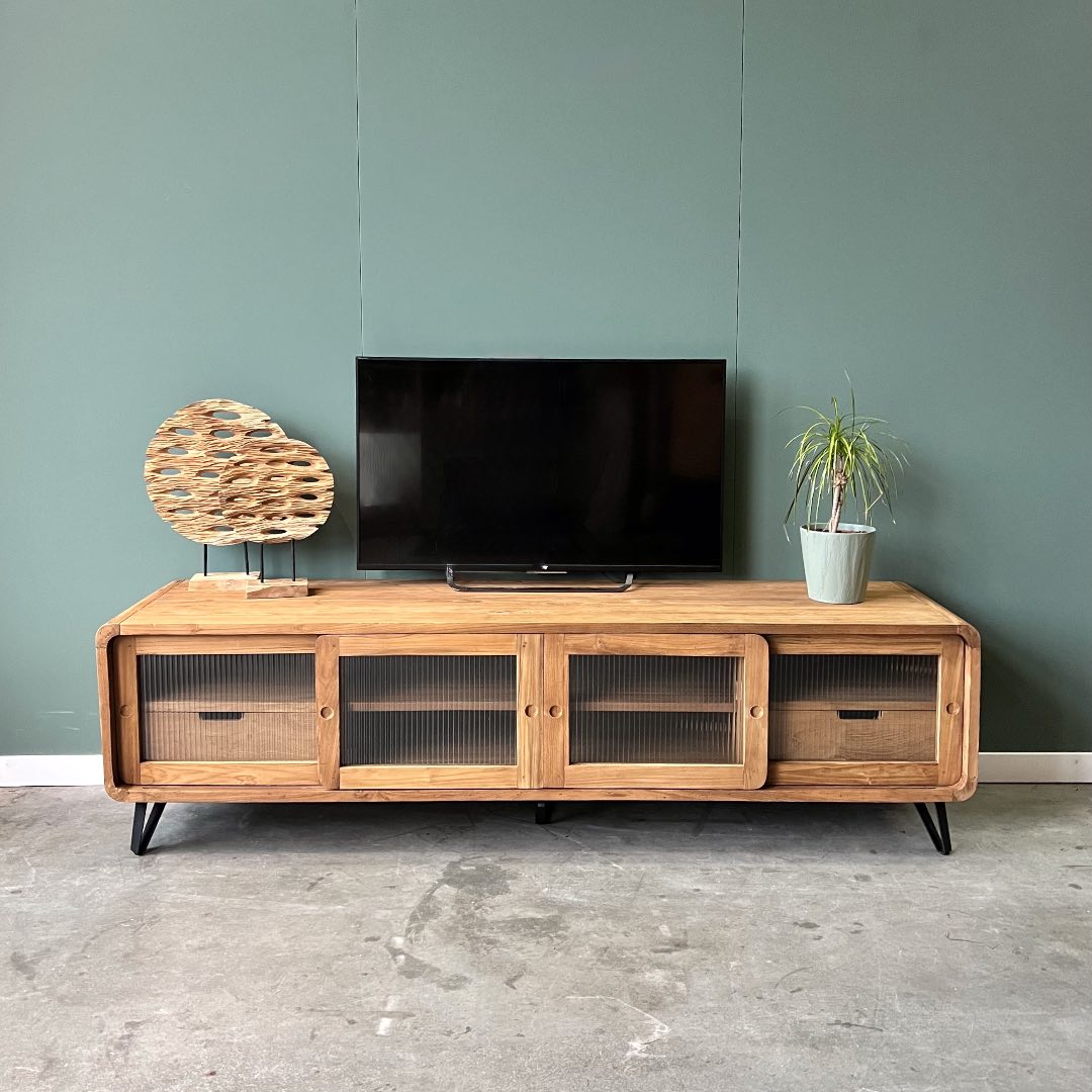 Dit tv-meubel is gemaakt van gerecycled teakhout. De combinatie van afgeronde hoeken en de schuine metalen poten zorgen voor een verfijnde uitstraling. De schuifdeuren met geribbeld glas voegen een speels accent toe. Het hout is licht geborsteld wat zorgt voor een mooie natuurlijke uitstraling.