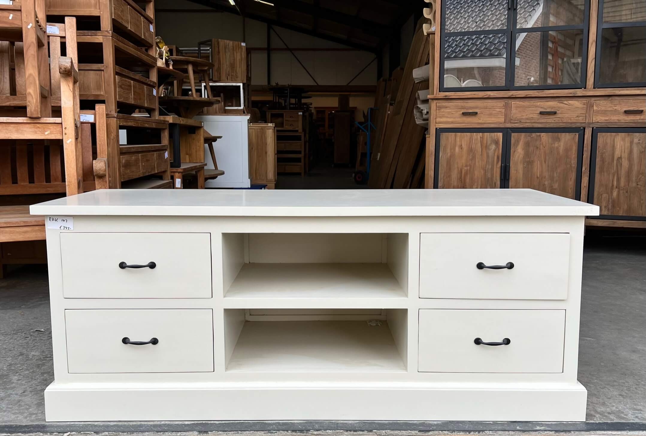 In de sale vanwege magazijn opruiming: wit tv meubel met 4 laden en 2 open vakken.