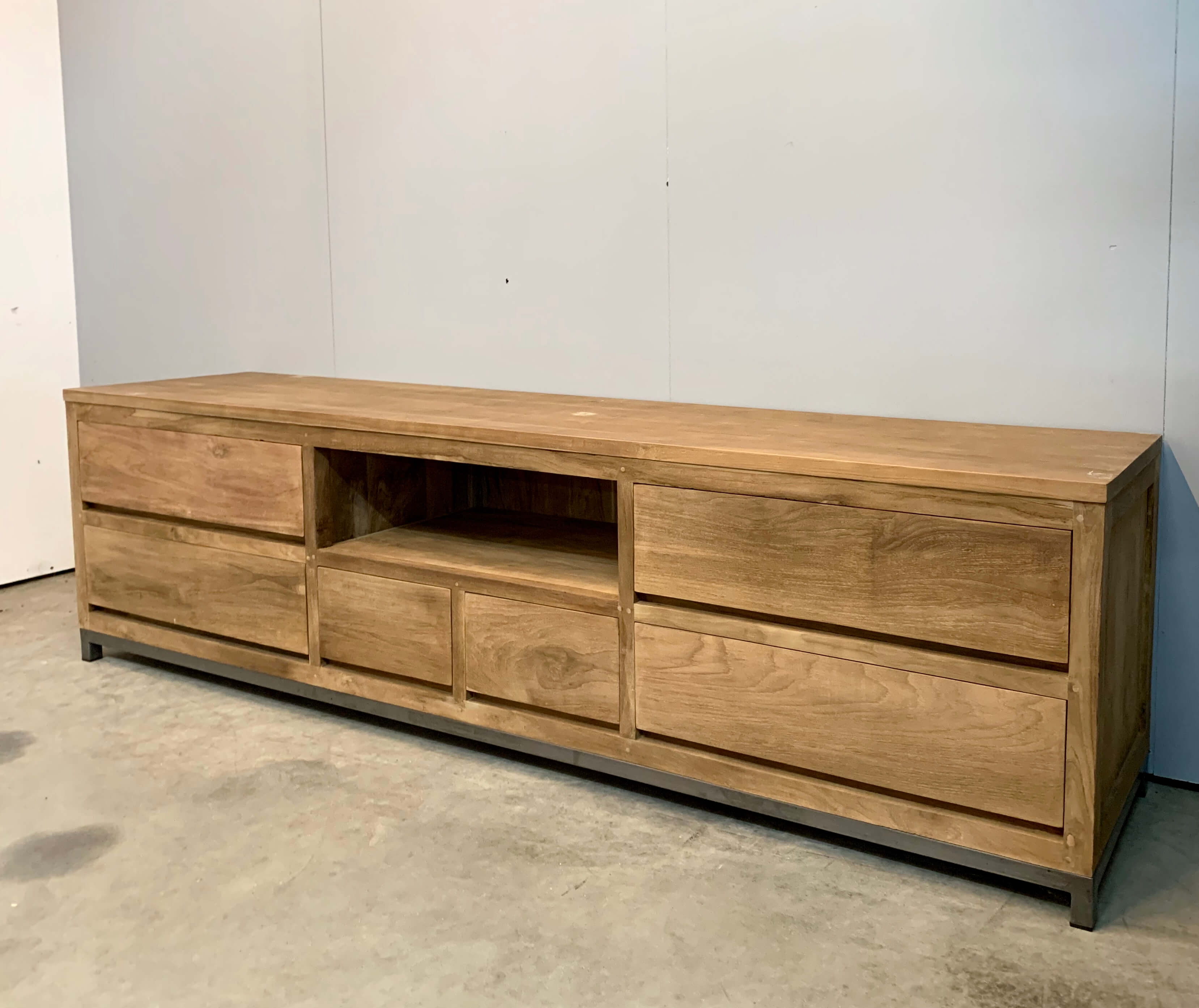 Strak tv-meubel met een stalen onderstel. De laden gaan moeiteloos open op een stalen rails. Dit meubel is volledig gemaakt van de beste kwaliteit hergebruikt teak.