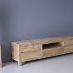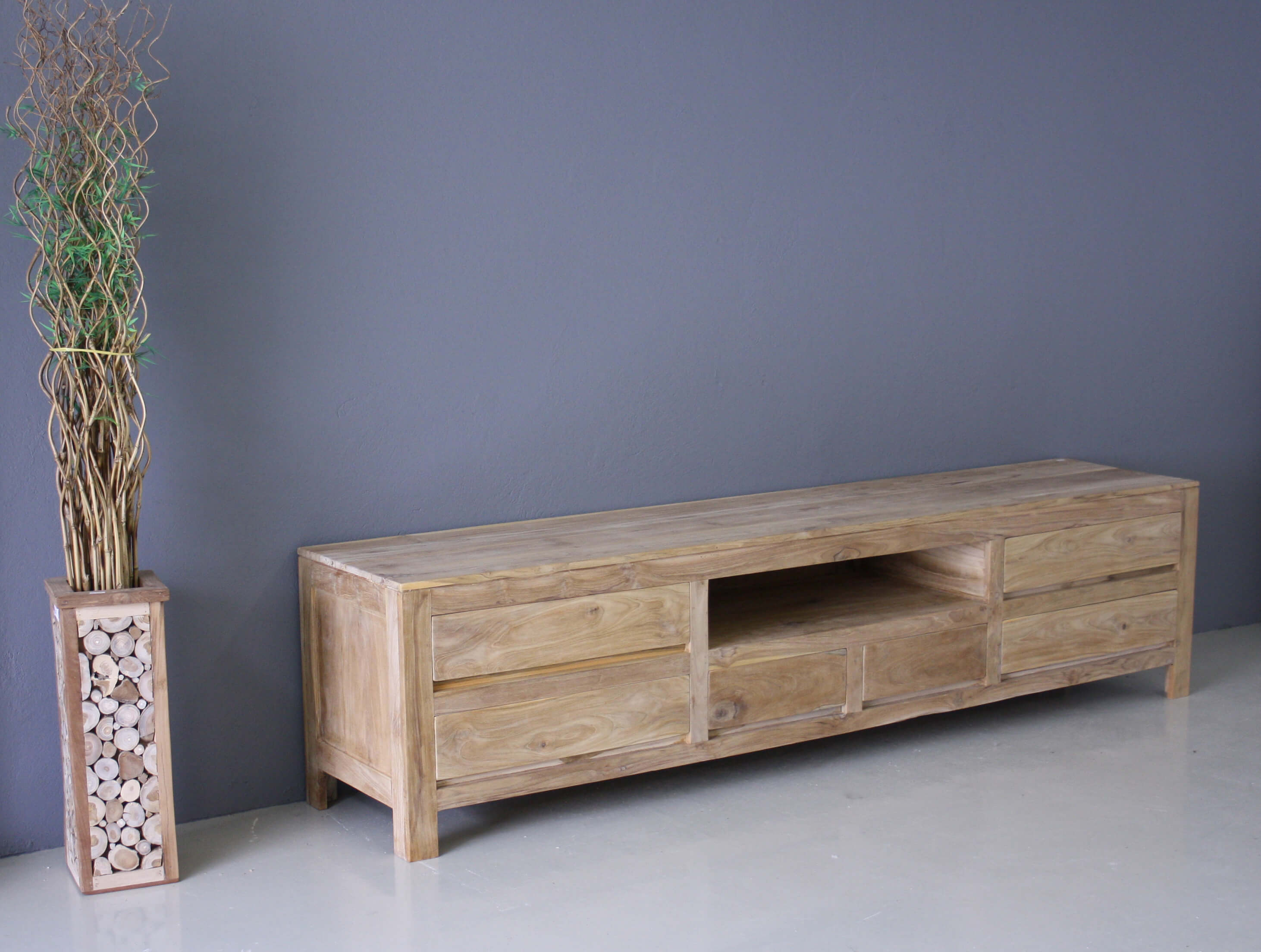 Velp TV meubel 240cm breed, 60cm hoog en 45cm diep. Dit tv meubel is gemaakt van plantage hout. Het hout is wat lichter van kleur en de laden zijn niet voorzien van geleiders.