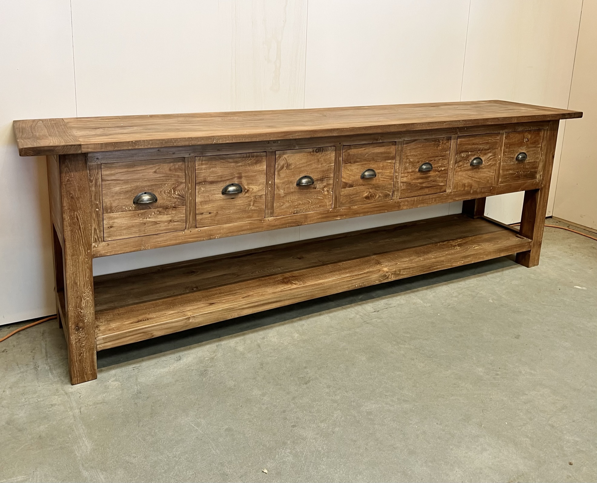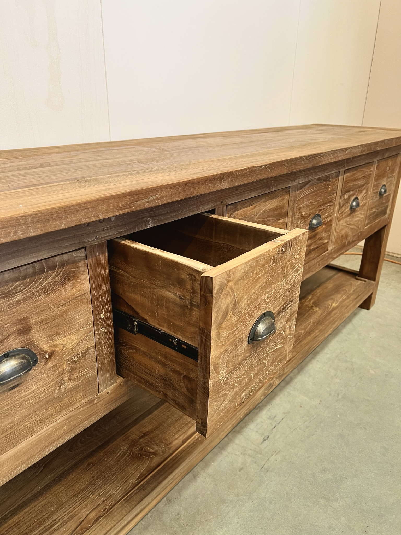 Wat een blikvanger! Zo groot zie je een sidetable niet vaak. Deze sidetable is gemaakt van gerecycled teakhout. Het hout is wat ruiger gelaten en behandeld met een wax. De laden gaan open op een metalen rail.