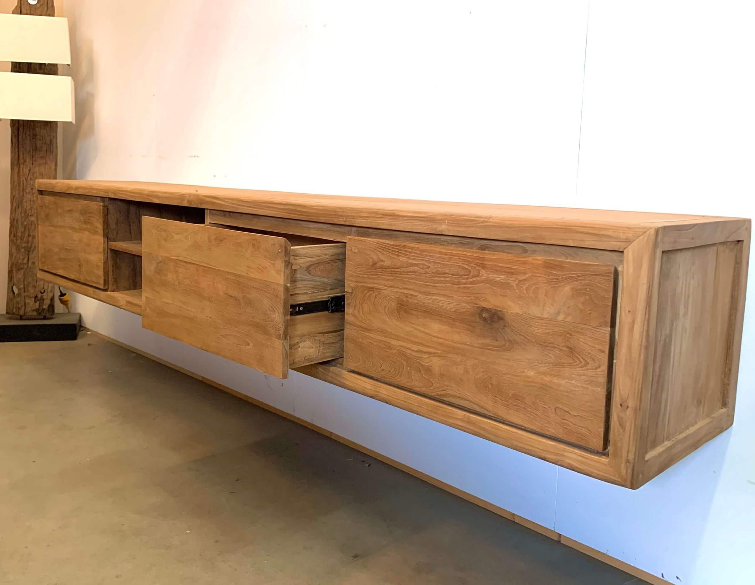 Kenmerken van dit zwevend tv-meubel van massief teakhout