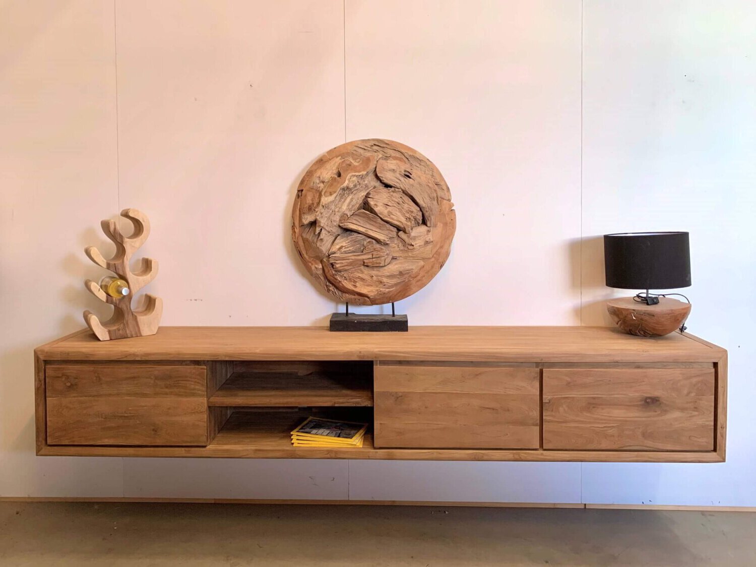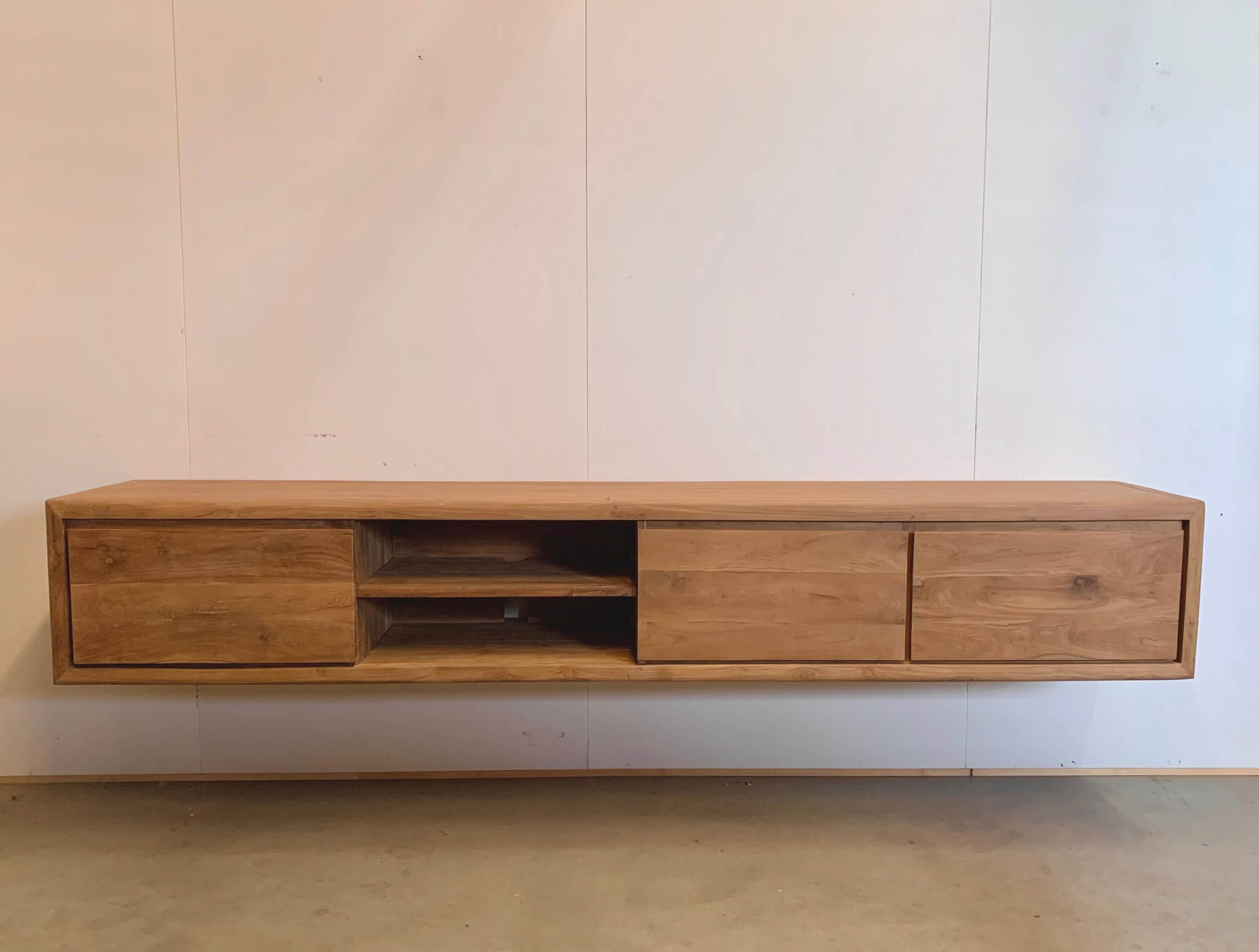 U wilt een prachtig tv-meubel aanschaffen dat makkelijk te onderhouden het is. Maar u wilt wel investeren in een uniek meubel dat niemand anders in huis heeft staan. Dan is dit zwevend tv-meubel teakhout van 250 cm perfect voor u. Handgemaakt, duurzaam en met een uniek karakter.